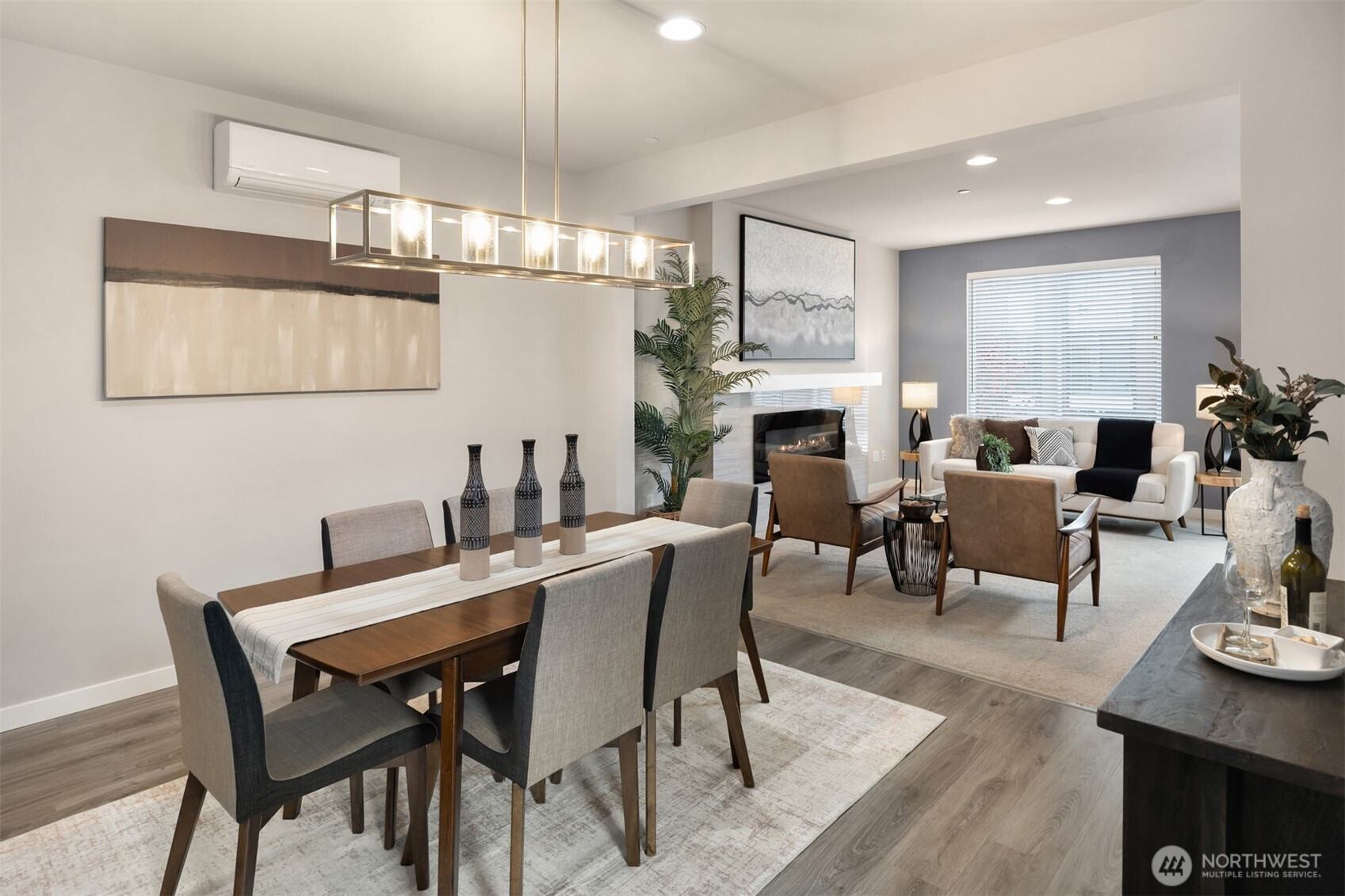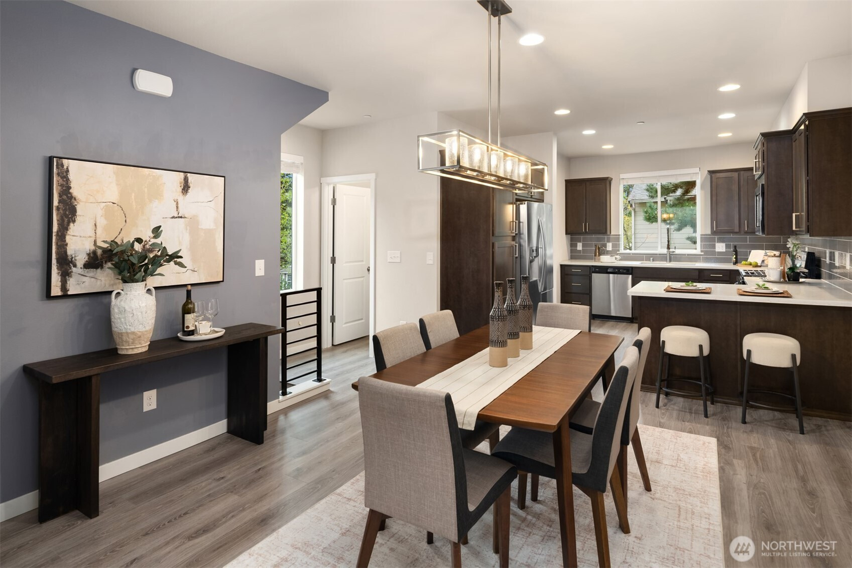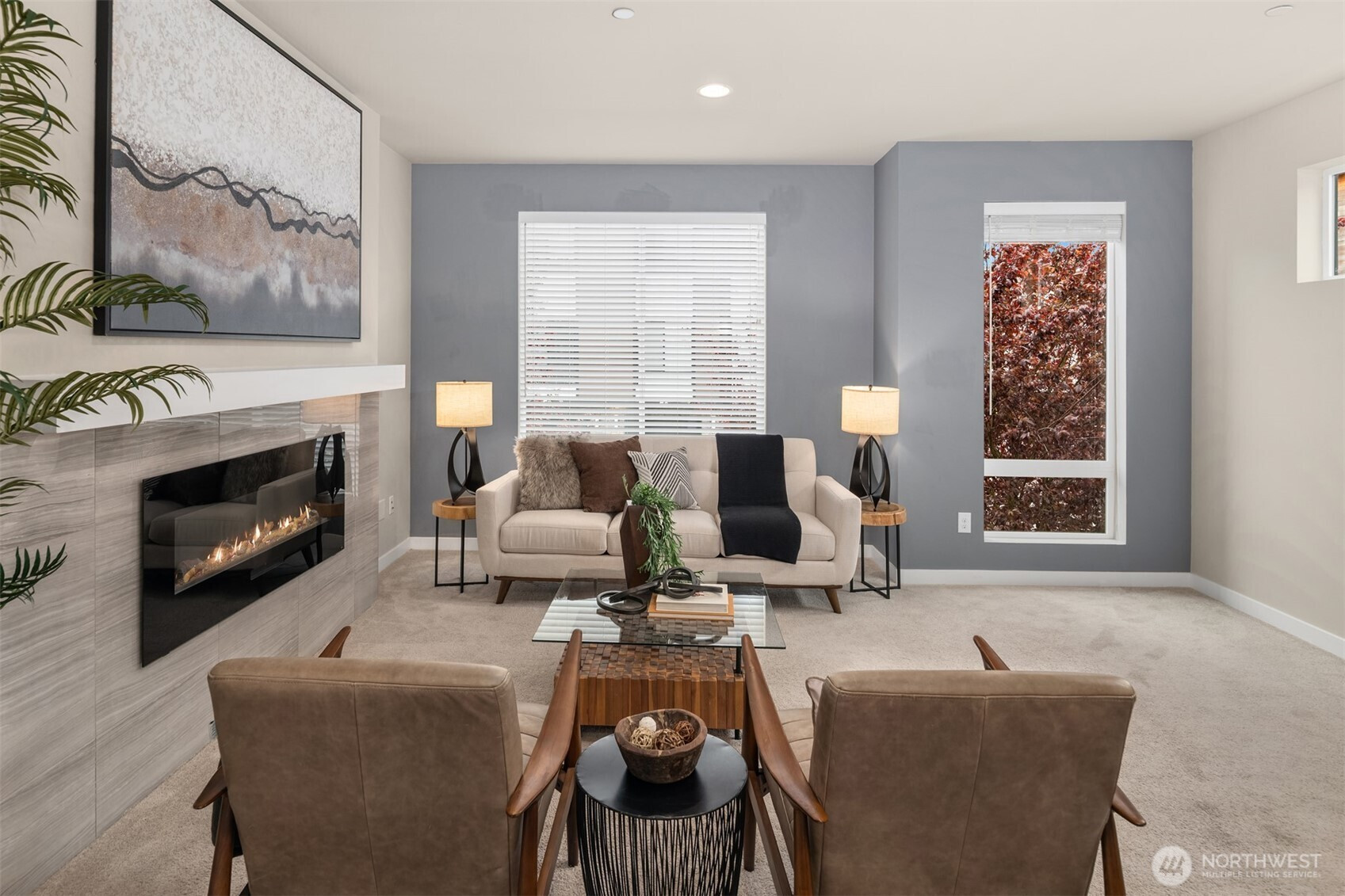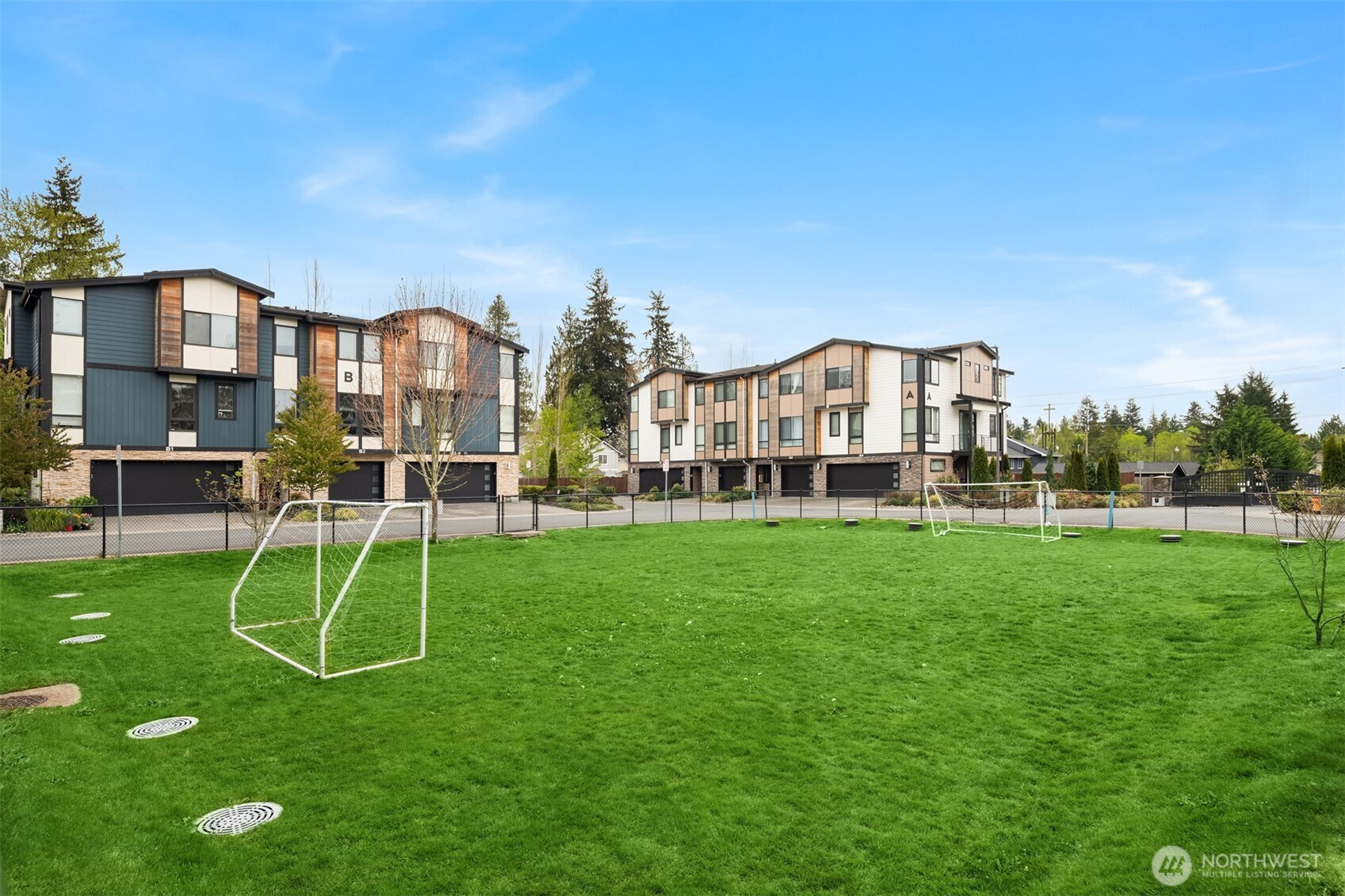 Securely tucked away in a sought-after gated community, this luxurious 2019 end-unit townhome is a move-in ready masterpiece boasting impressive curb appeal & stunning modern finishes with a sprawling 2-car garage, driveway & super low HOA dues! Lavishly appointed 1,548sf, 3 bed, 2.5 bath design features a desirable open concept layout with tall ceilings, oversized windows & horizontal open rail staircases throughout. Light-filled living room with captivating linear fireplace opens spacious formal dining & high-end dream kitchen with rich solid wood cabinetry, gorgeous quartz counters, full-height tiled backsplash, gas range, stainless steel appliances, peninsula bar & private covered balcony. The primary suite dazzles with generous walk-in closet & dramatic tiled bath with dual-sink quartz vanity & glass enclosed shower. Full-size utility room, abundant storage space, on-demand hot water & efficient A/C. Covered patio + backyard space with upside potential. Attractive neighborhood with fenced-in playground, ample guest parking & no rental cap!
