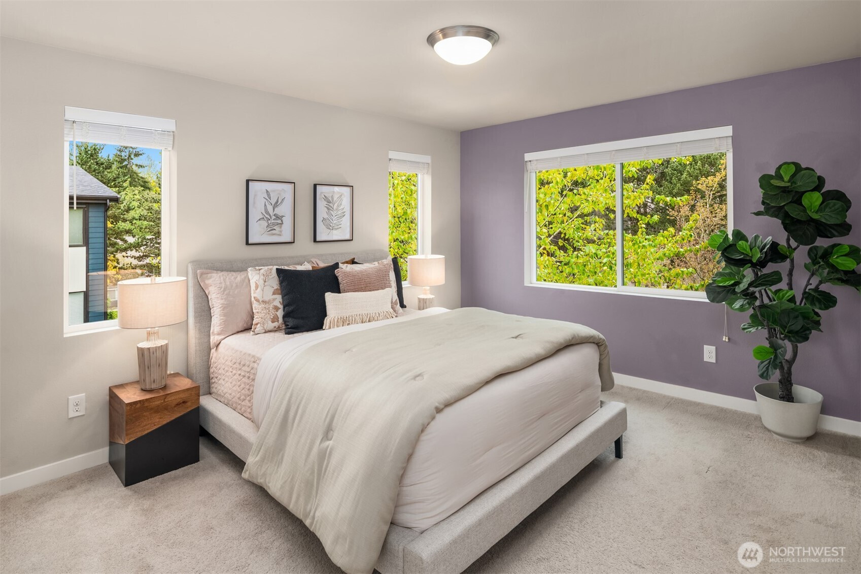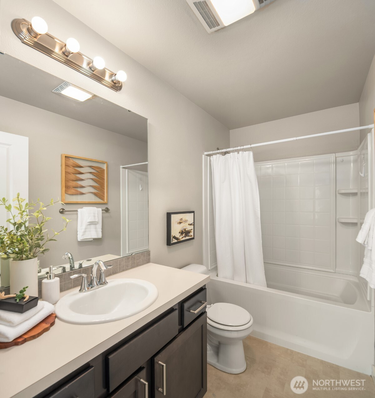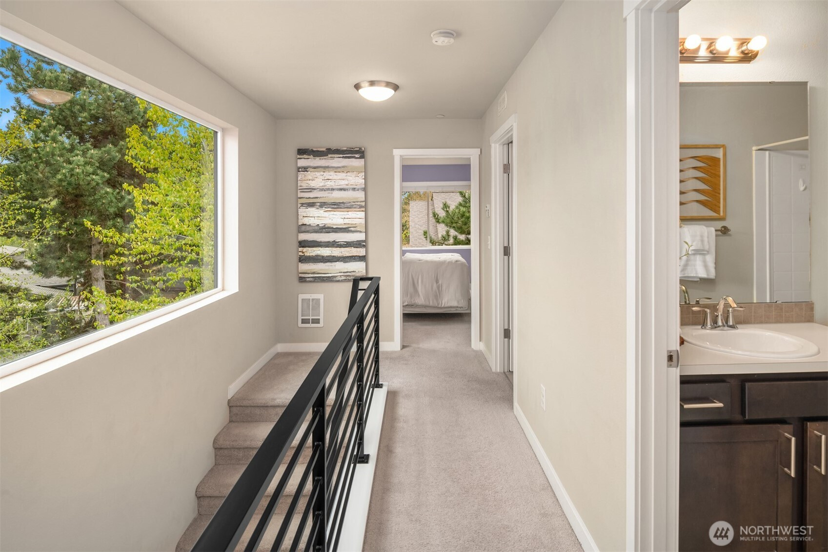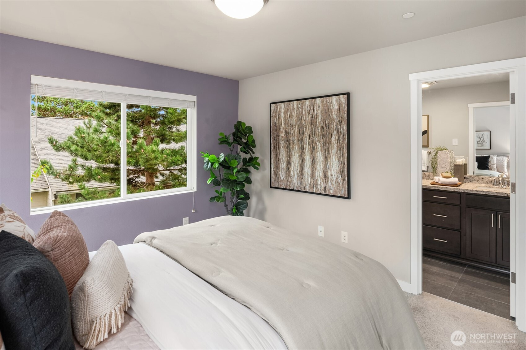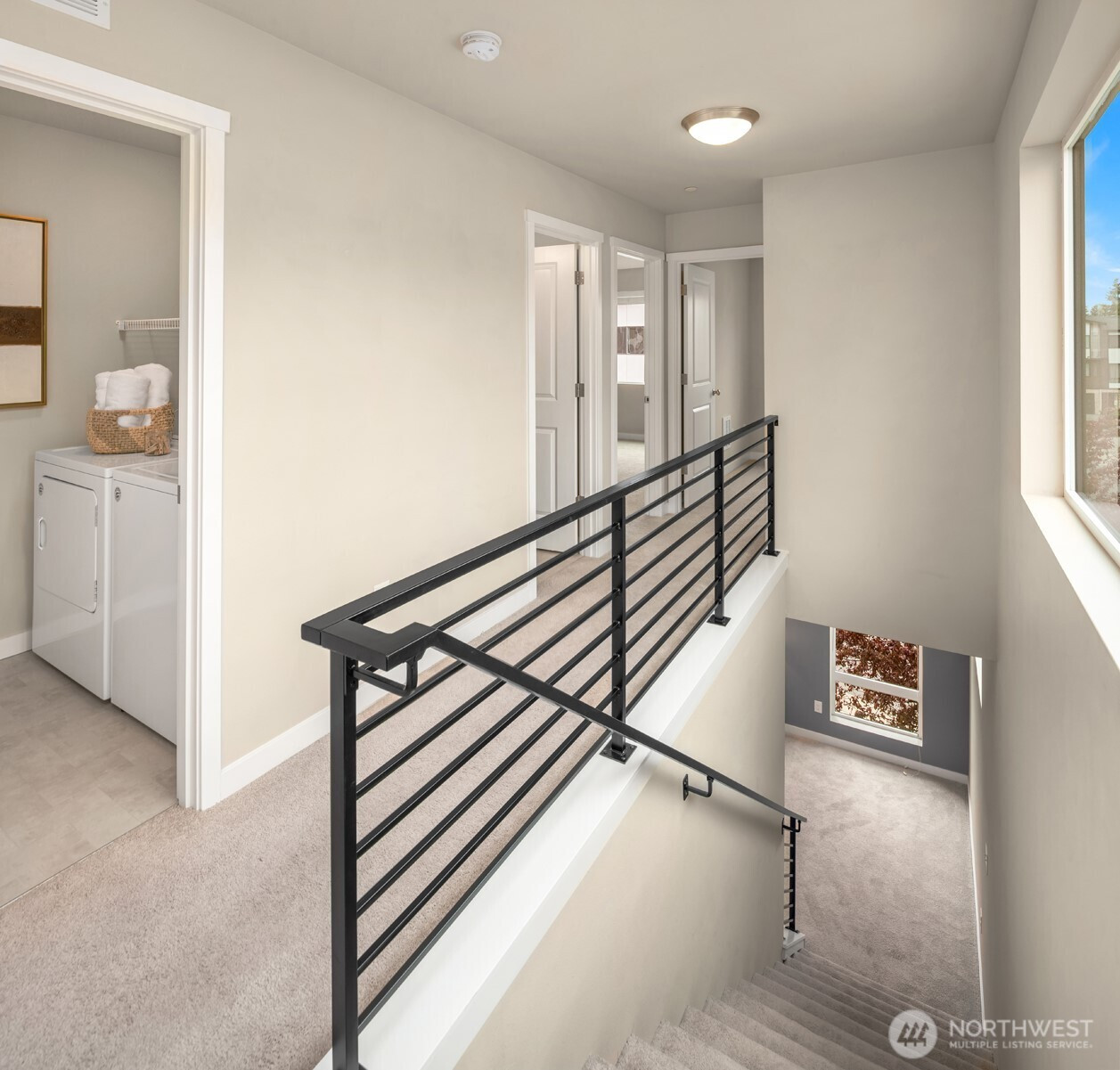 Securely tucked away in a sought-after gated community, this luxurious 2019 end-unit townhome is a move-in ready masterpiece boasting impressive curb appeal & stunning modern finishes with a sprawling 2-car garage, driveway & super low HOA dues! Lavishly appointed 1,548sf, 3 bed, 2.5 bath design features a desirable open concept layout with tall ceilings, oversized windows & horizontal open rail staircases throughout. Light-filled living room with captivating linear fireplace opens spacious formal dining & high-end dream kitchen with rich solid wood cabinetry, gorgeous quartz counters, full-height tiled backsplash, gas range, stainless steel appliances, peninsula bar & private covered balcony. The primary suite dazzles with generous walk-in closet & dramatic tiled bath with dual-sink quartz vanity & glass enclosed shower. Full-size utility room, abundant storage space, on-demand hot water & efficient A/C. Covered patio + backyard space with upside potential. Attractive neighborhood with fenced-in playground, ample guest parking & no rental cap!