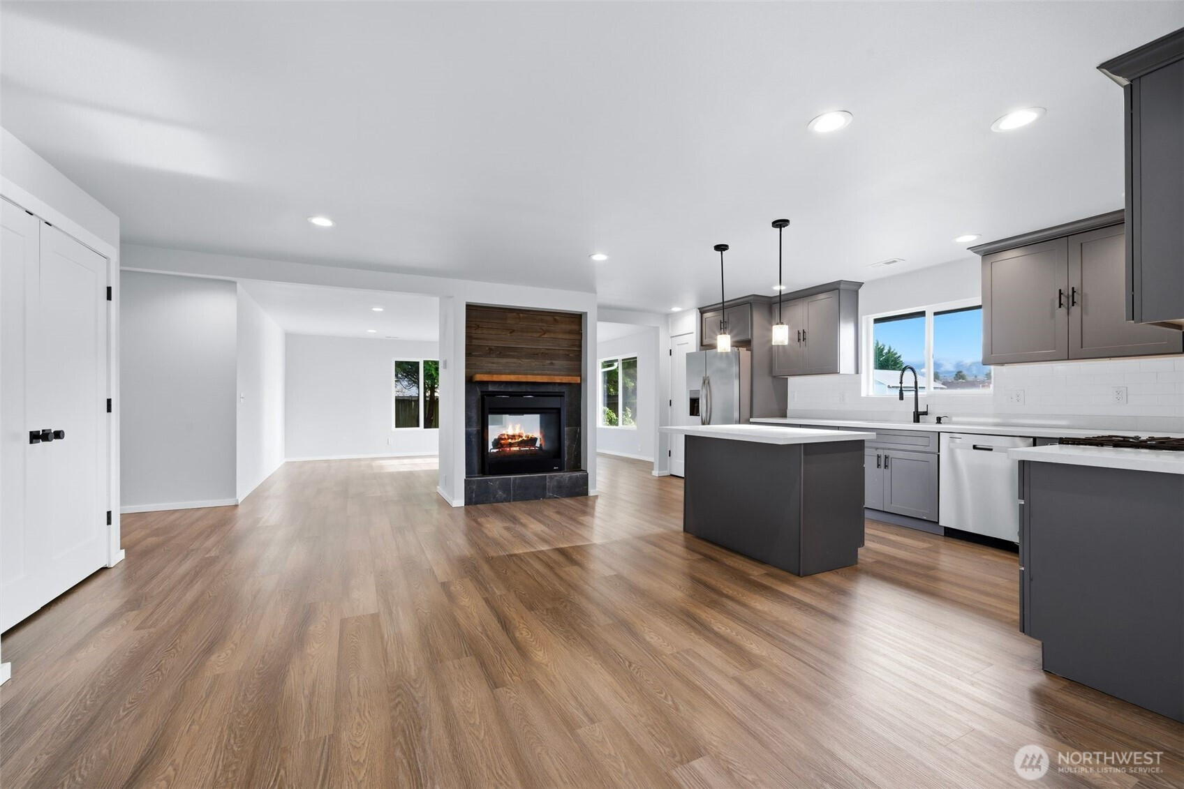 Discover the perfect blend of modern luxury and small-town charm in this newly renovated rambler. The heart of the home features a stunning open-concept layout, seamlessly connecting the living and dining areas to a chef-inspired kitchen. You’ll love the sleek quartz countertops, expansive island, and the cozy ambiance of a unique double-sided fireplace. The primary suite serves as a private retreat, complete with a refreshed 3/4 en-suite bath. Outside, the level yard offers a blank canvas for your gardening dreams and summer entertaining. With abundant parking and dedicated RV space, there’s room for all your toys. Experience turnkey living at the gateway to the Cascades!