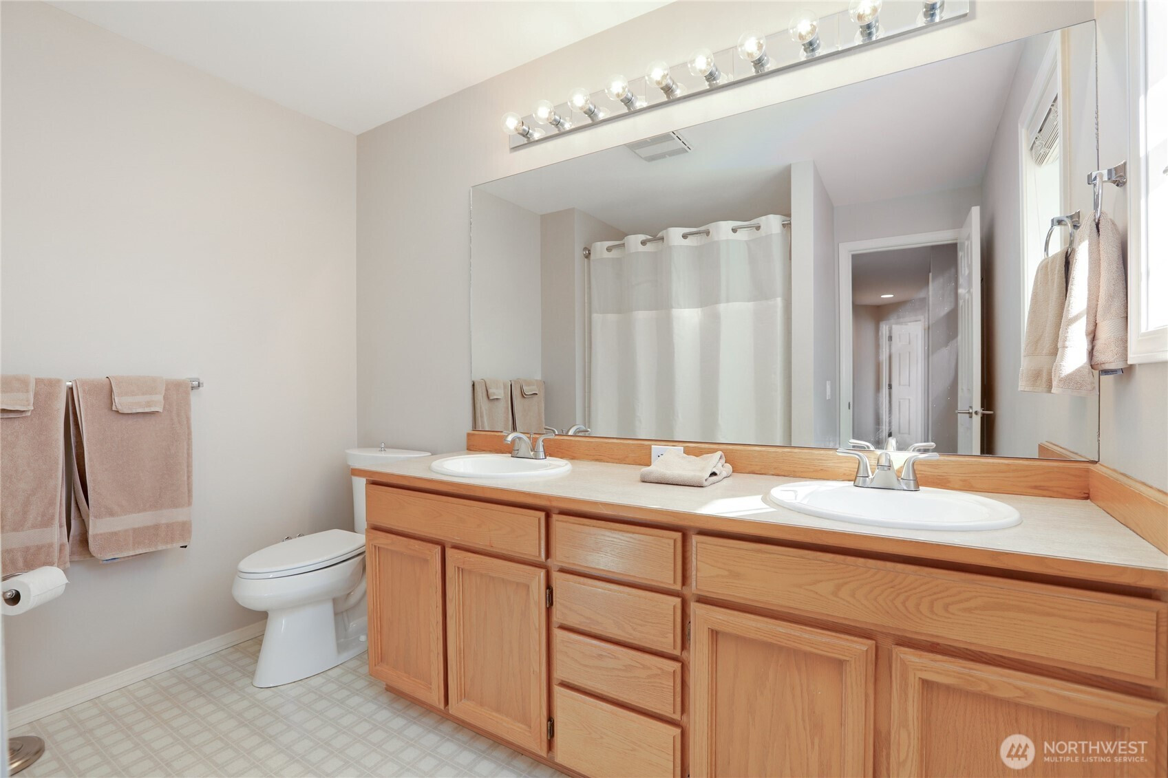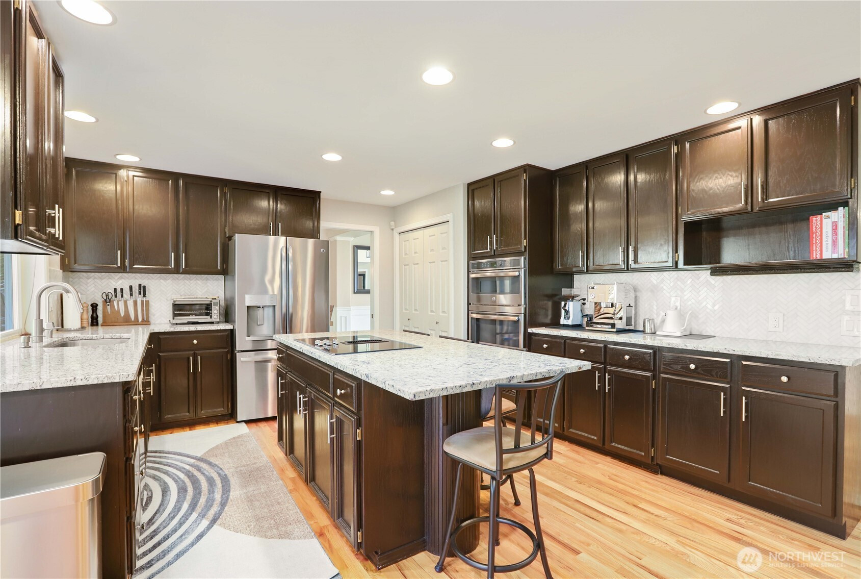 Beautifully maintained Gleneagle home backing to the 1st hole green. The exterior has been fully resided with Hardi-Plank and features freshly painted trim—no LP siding! The main level offers a bright living room with gas fireplace, a den/office, and a spacious kitchen with large island and stainless steel appliances that opens to the family room. French doors lead to a backyard with patio, perfect for relaxing or entertaining. Upstairs features 4 bedrooms, including a generous primary suite with 5-pc bath and walk-in closet. Professionally landscaped yard includes sprinkler system and fountain. Additional highlights: 5-gig WiFi, 3-car garage, central A/C, and close proximity to clubhouse, parks, trails, and schools.