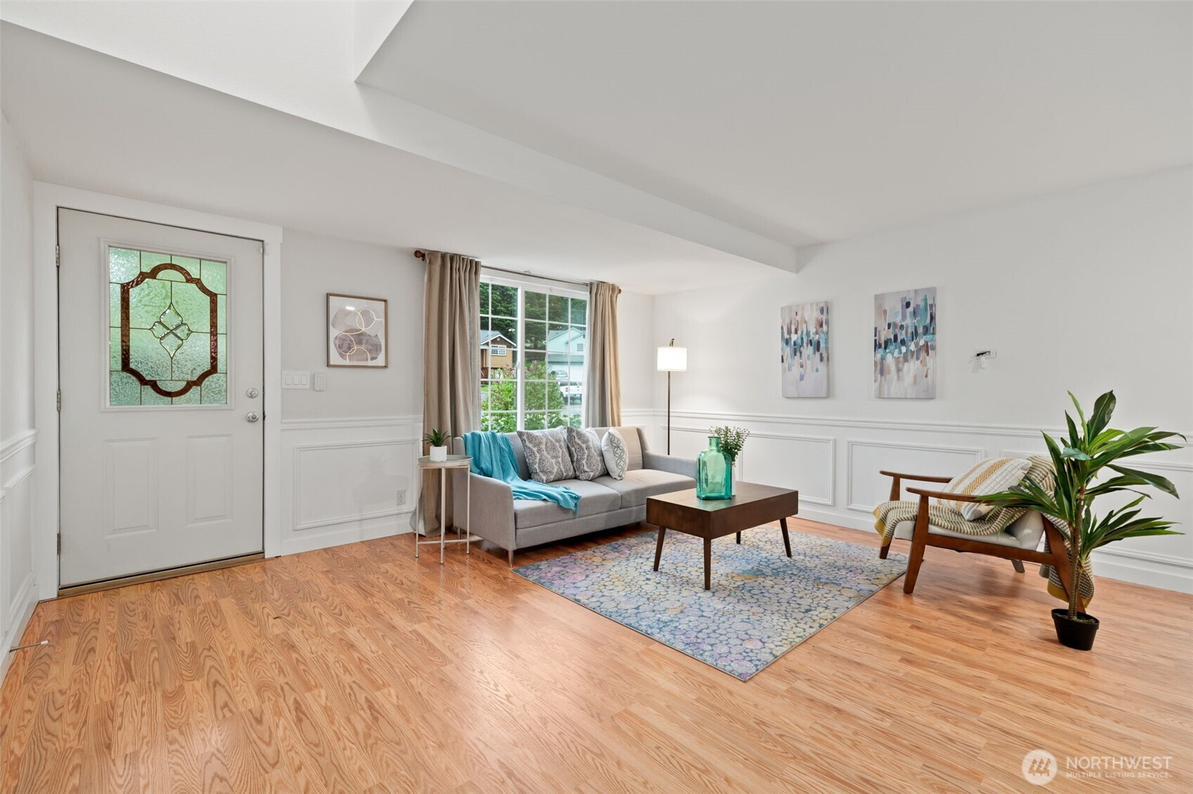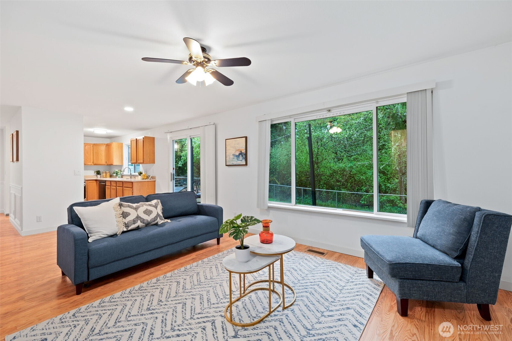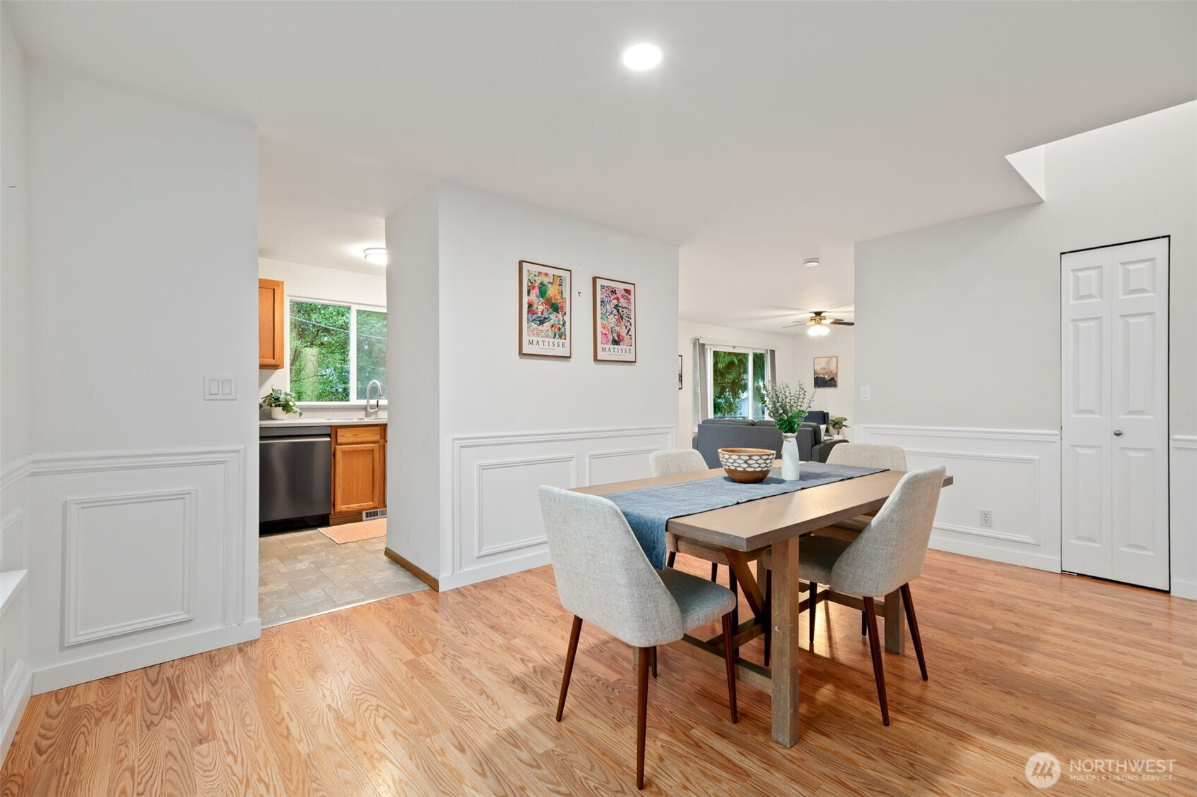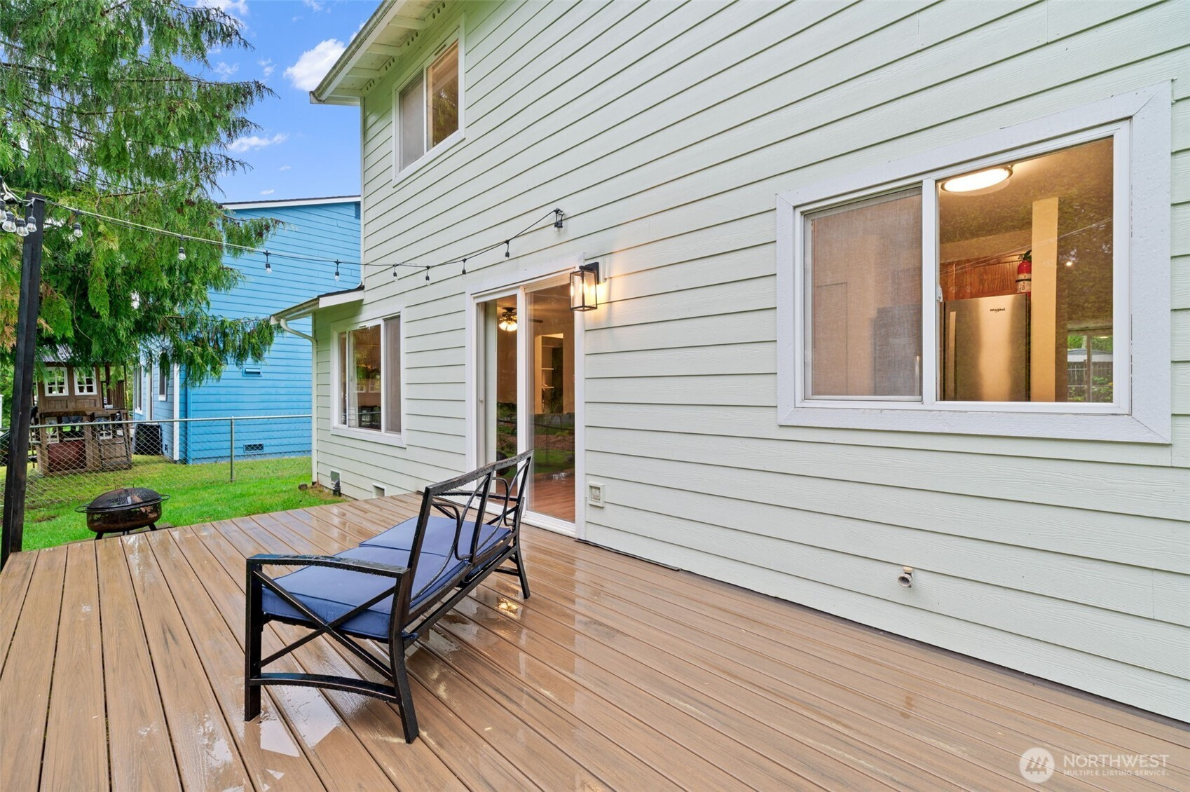 Move in ready, two-story home in a desirable cul-de-sac location convenient to Boeing, Freeways and minutes to Mukilteo Waterfront and Forest Park. Flex space front living and dining room with chair rail and shadow boxing. Wood laminate floors throughout main level. Rocker light switches. 6 panel white doors and white painted millwork. Kitchen with custom solid surface countertops, Stainless Steel appliances including brand new smooth top electric range + hood vent, newer Dishwasher and Refrigerator & newer vinyl floors. Open concept to eating nook and family room, perfect for entertaining. Sunny east/west exposure for great natural light. Primary suite with attached updated full bath and walk-in closet. Newer LG Washer & Dryer. A fully fenced spacious yard with Trex decking, garden lights & backs to a quiet greenbelt. Newer efficient Trane heat pump, AC, furnace, and water heater tank. Attached two-car garage. Low maintenance cement planked siding. No HOA. Pre-inspected for peace of mind.