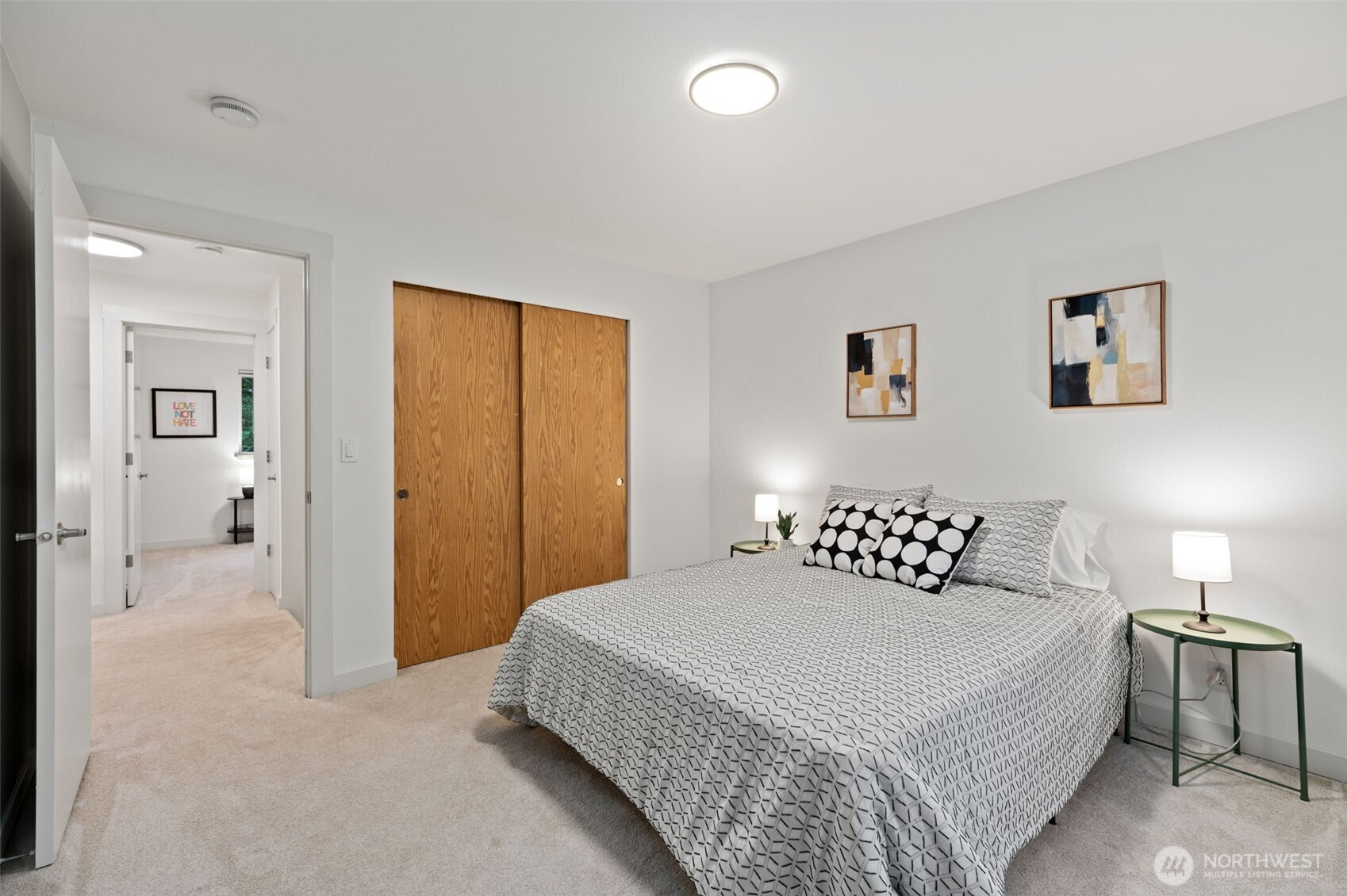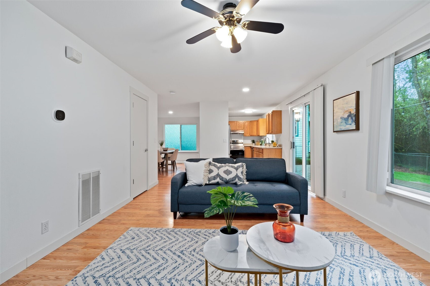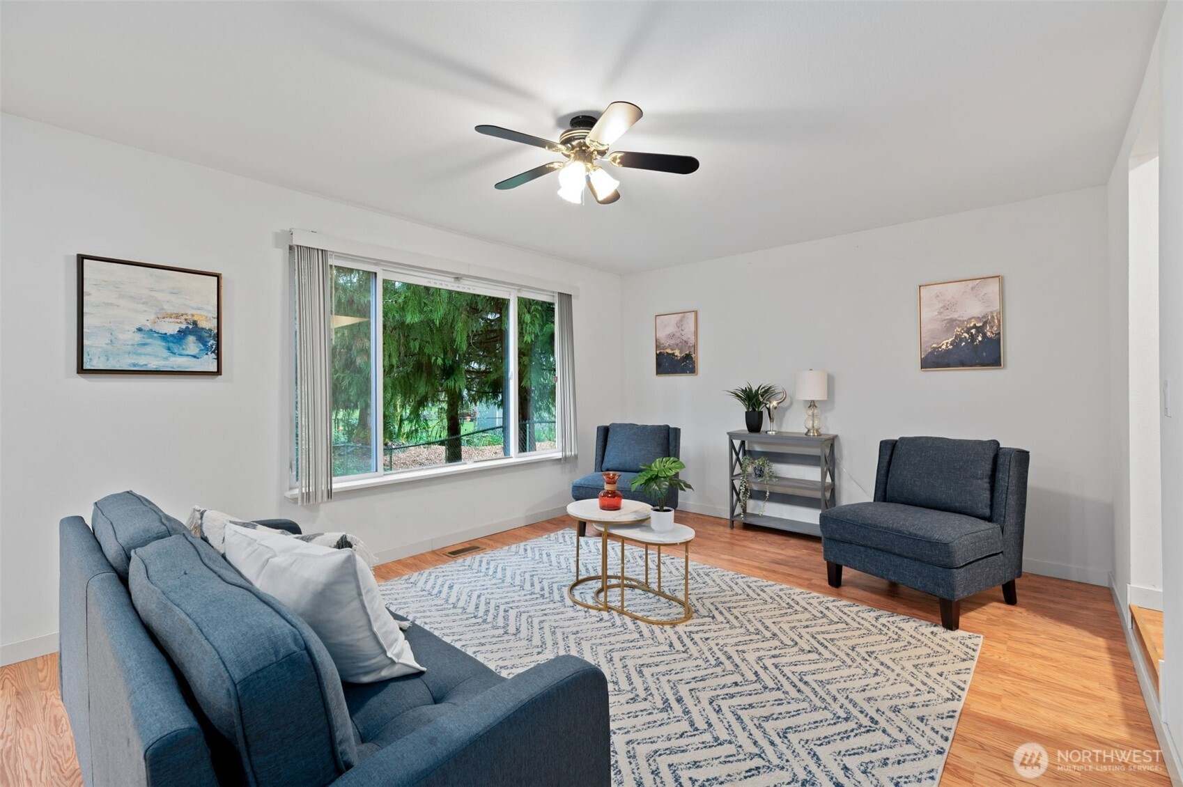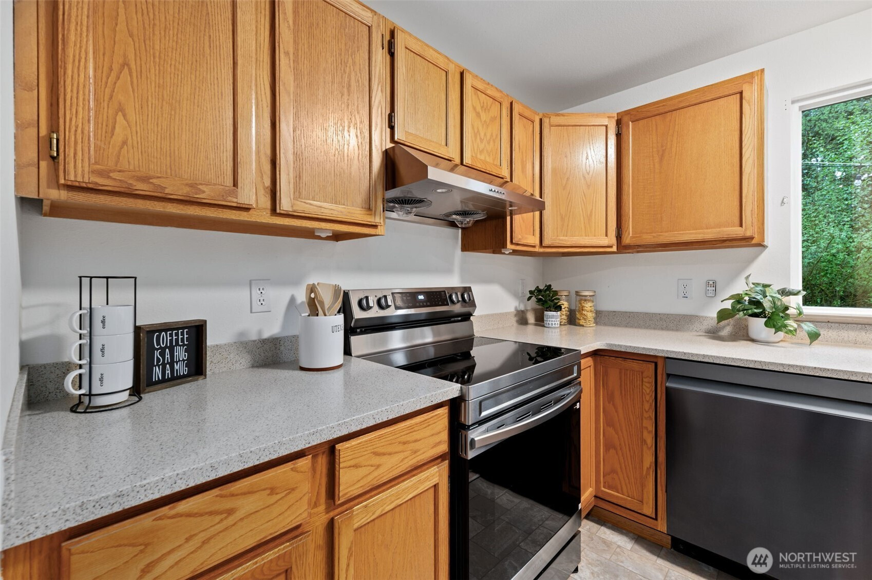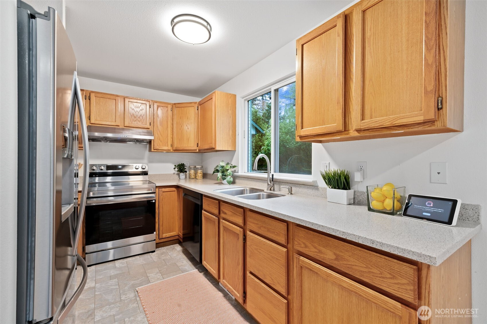 Move in ready, two-story home in a desirable cul-de-sac location convenient to Boeing, Freeways and minutes to Mukilteo Waterfront and Forest Park. Flex space front living and dining room with chair rail and shadow boxing. Wood laminate floors throughout main level. Rocker light switches. 6 panel white doors and white painted millwork. Kitchen with custom solid surface countertops, Stainless Steel appliances including brand new smooth top electric range + hood vent, newer Dishwasher and Refrigerator & newer vinyl floors. Open concept to eating nook and family room, perfect for entertaining. Sunny east/west exposure for great natural light. Primary suite with attached updated full bath and walk-in closet. Newer LG Washer & Dryer. A fully fenced spacious yard with Trex decking, garden lights & backs to a quiet greenbelt. Newer efficient Trane heat pump, AC, furnace, and water heater tank. Attached two-car garage. Low maintenance cement planked siding. No HOA. Pre-inspected for peace of mind.
