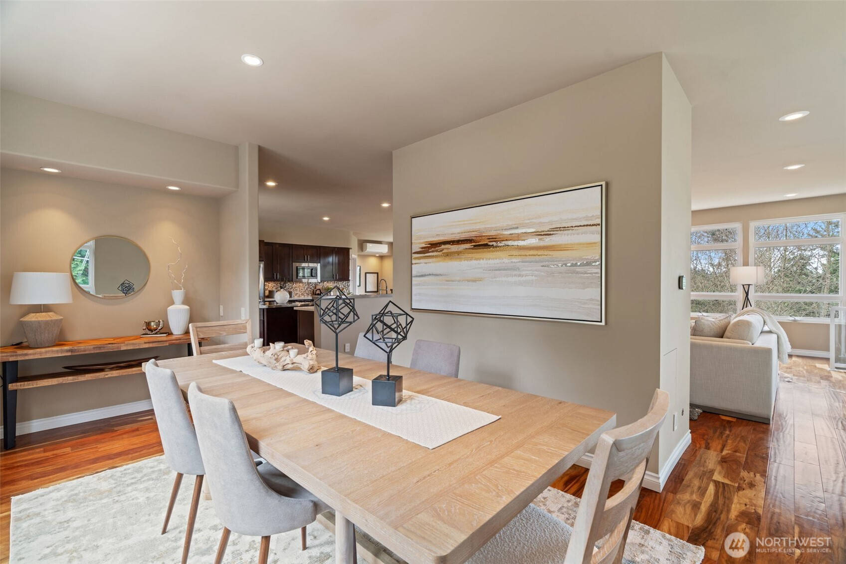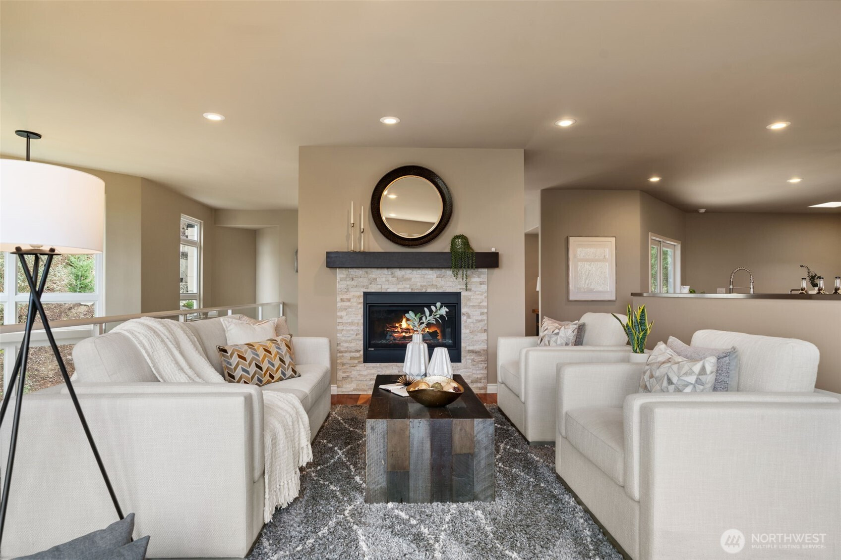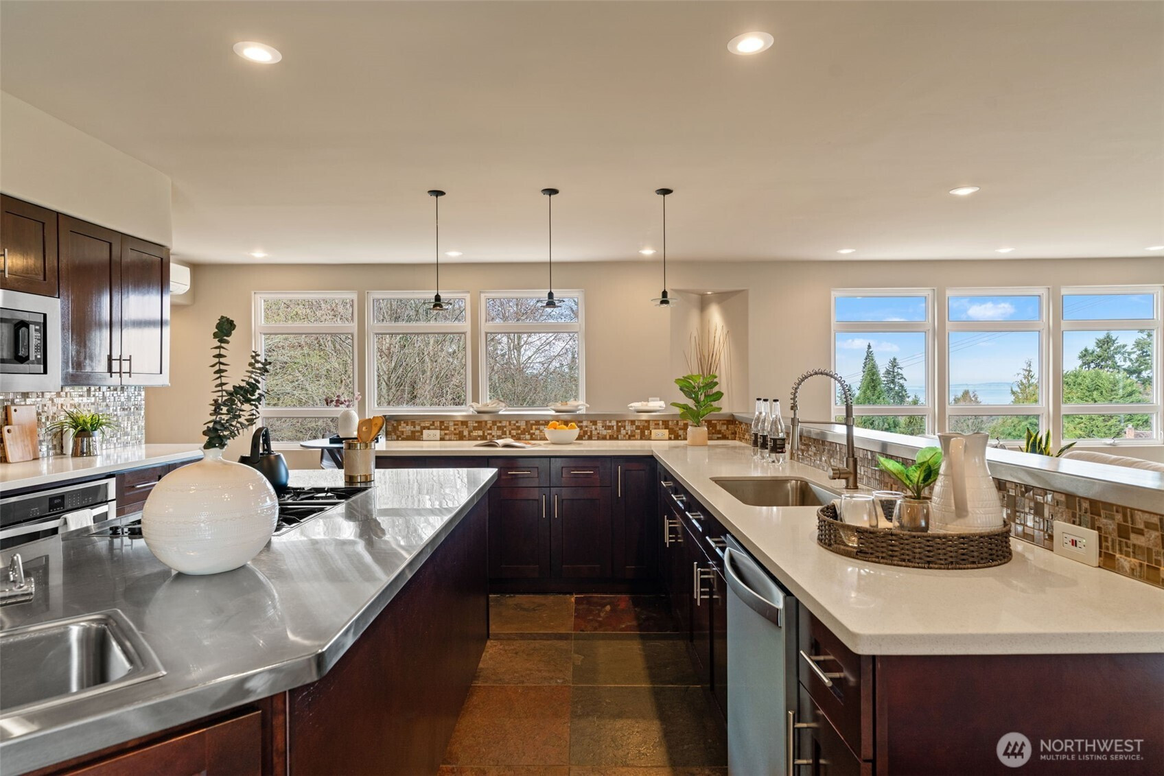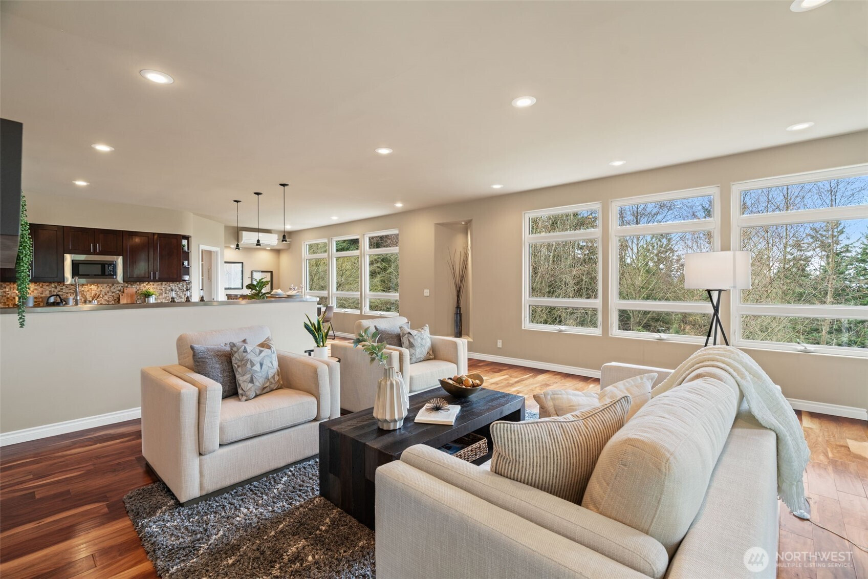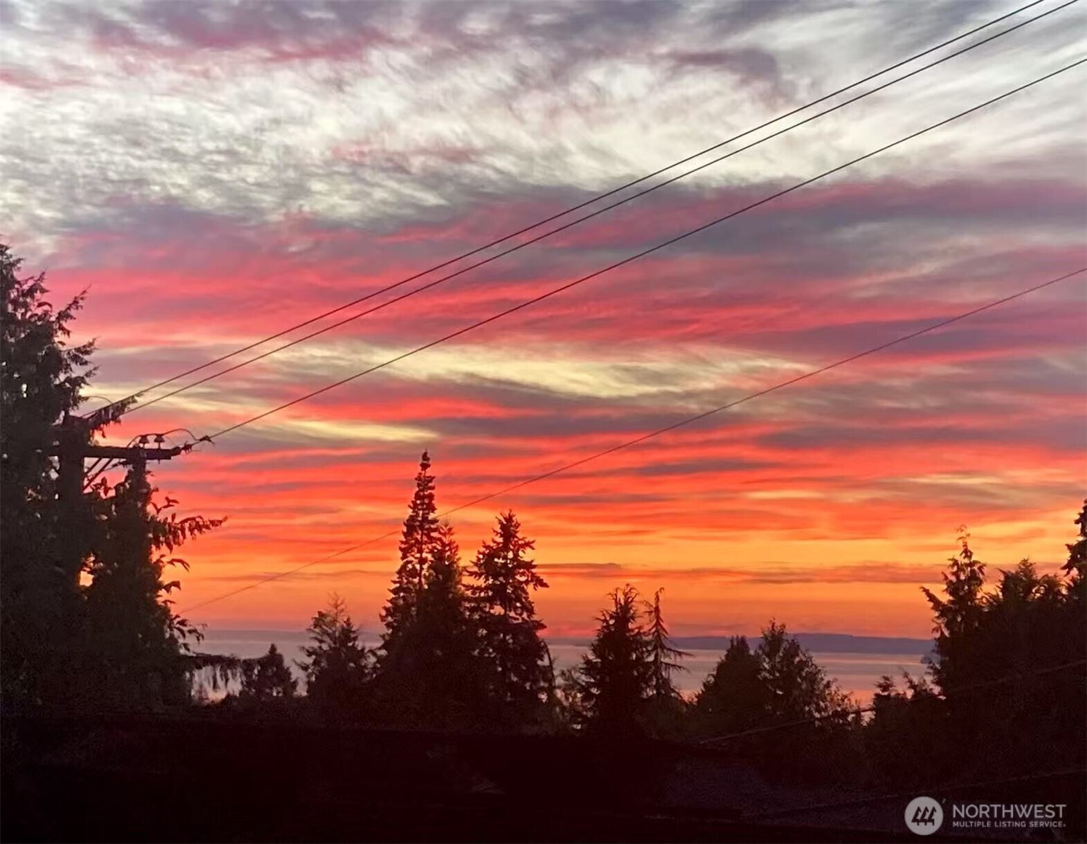 A truly exceptional Sound-view custom home offers refined design, privacy and unforgettable sunsets. Natural light fills the open-concept living spaces, complemented by Acacia floors and a dramatic stacked-stone fireplace that creates a welcoming focal point. The kitchen is both elegant and functional, featuring quartz countertops, soft-close cabinetry, stainless steel appliances, and an oversized island with prep sink - perfect for hosting and everyday living.The primary suite serves as a peaceful retreat, with French doors opening to a private view deck -an ideal spot to unwind while enjoying sunset views over the Sound and Whidbey Island. Radiant in-floor heating, a high-efficiency boiler, on-demand hot water, and air conditioning enhance year-round comfort.Outdoor spaces are designed for relaxation and connection to nature, offering multiple areas to lounge, dine, and entertain in a serene setting. A substantial 896-square-foot garage provides exceptional storage and flexibility, complemented by RV parking and a location within the Edmonds School District. Secluded, serene, and truly special.
