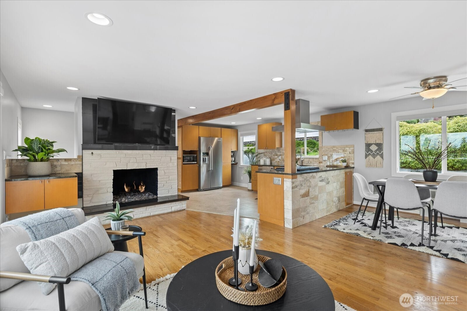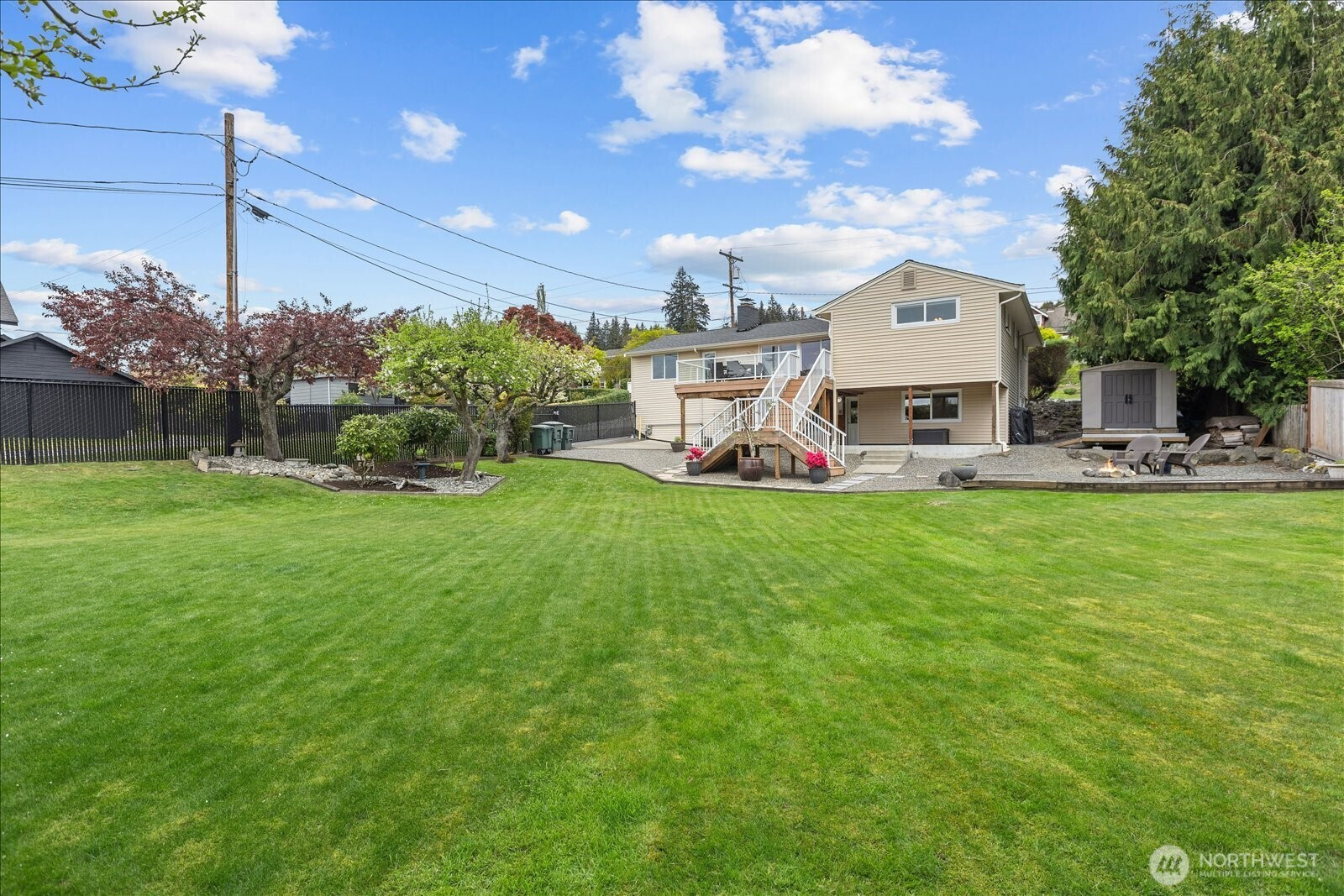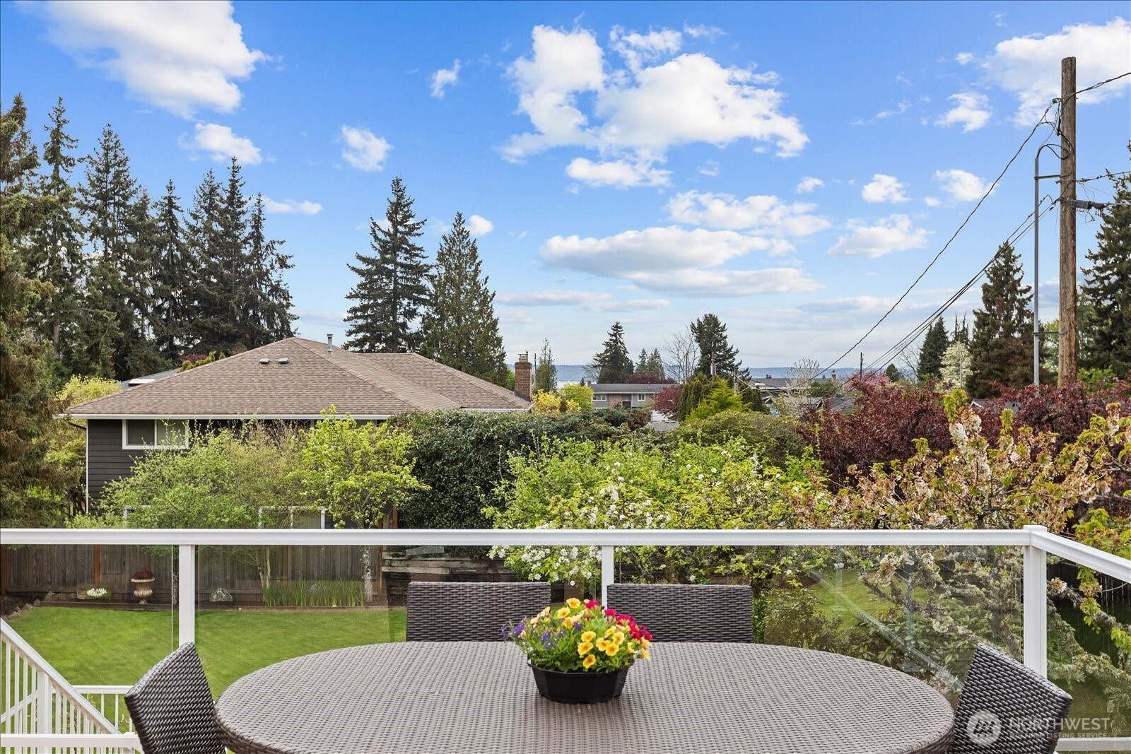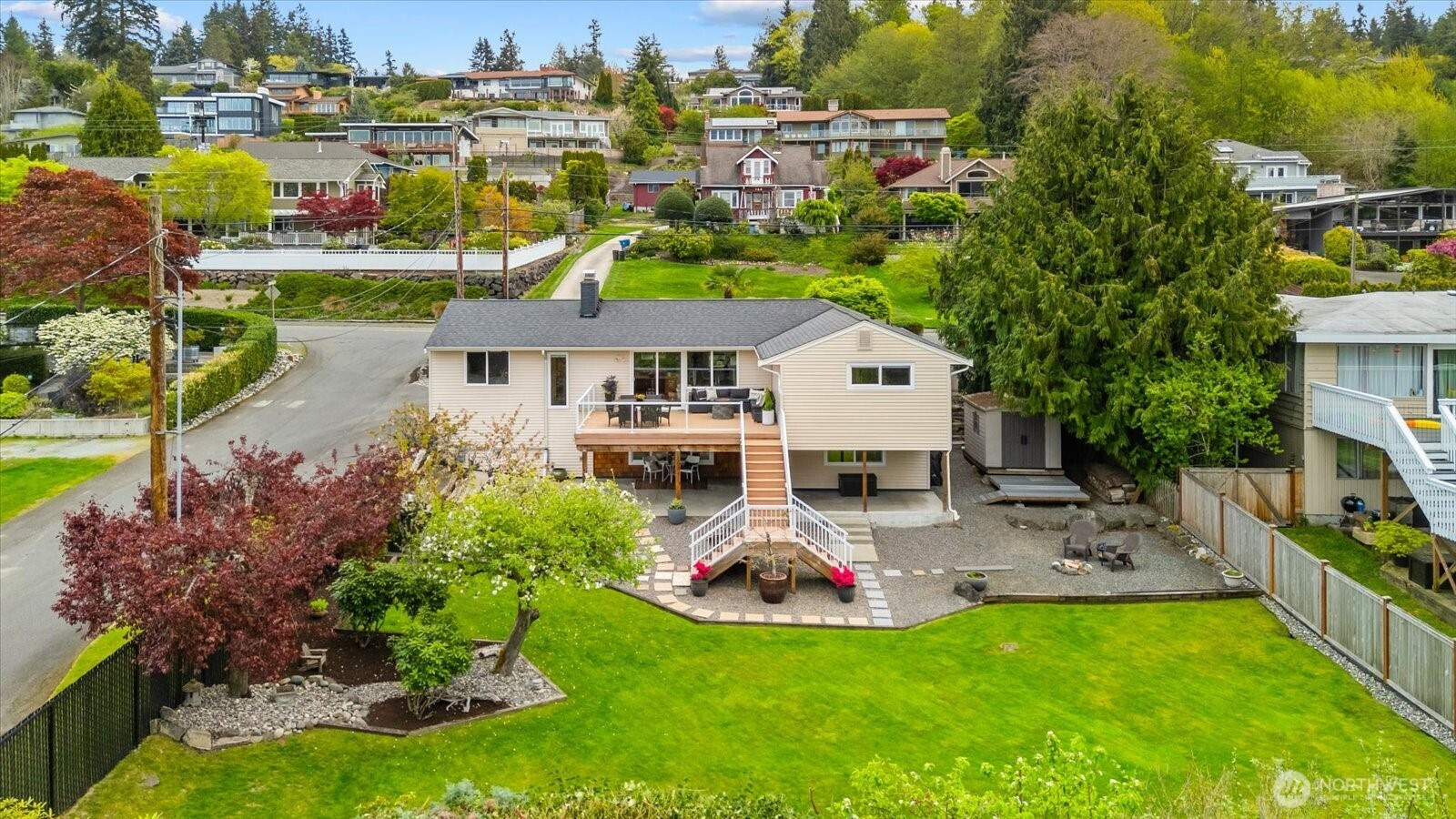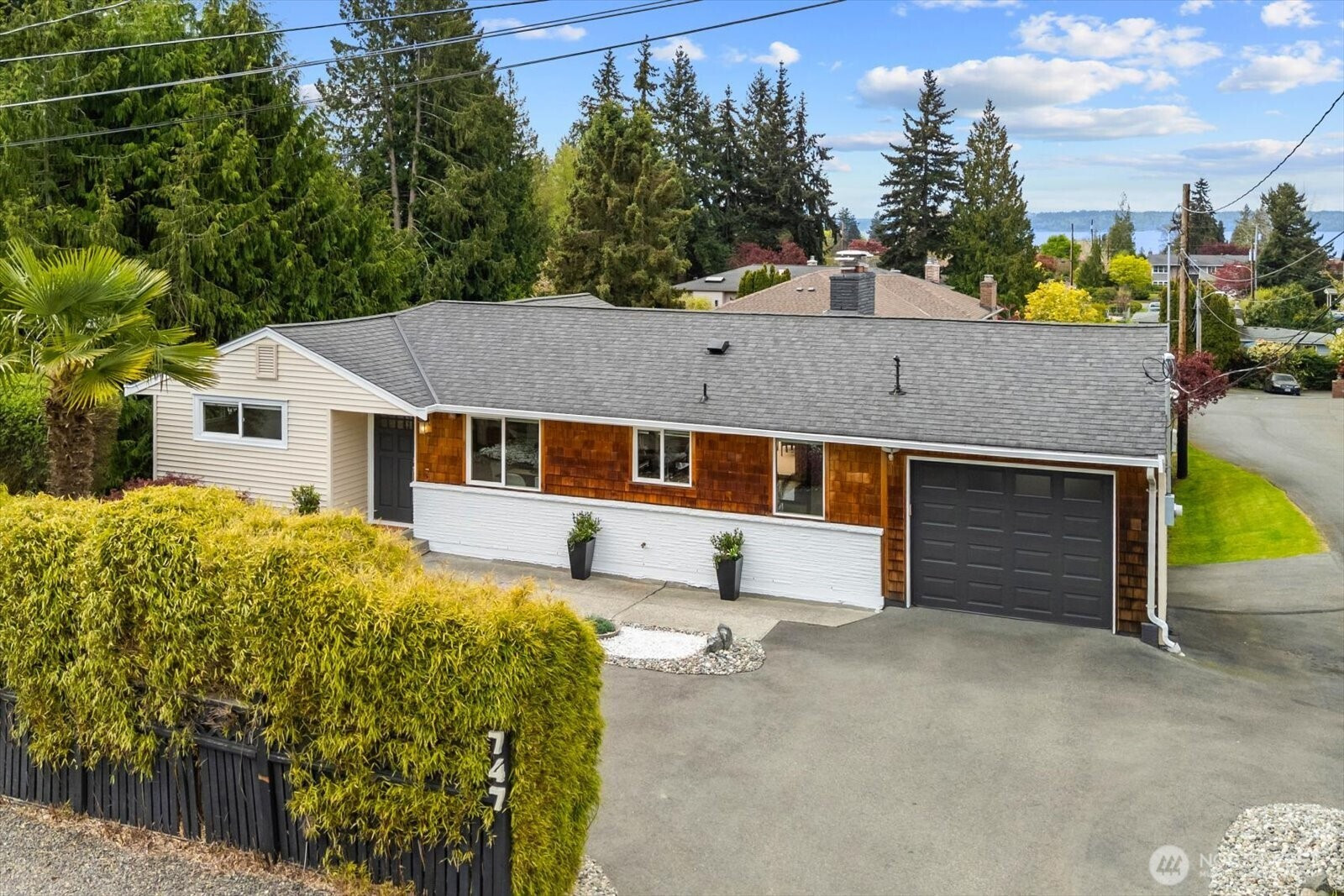 Welcome to Edmonds Bowl, where views of the Puget Sound and Olympic Mountains create a stunning backdrop that never gets old. Perfectly set on a spacious corner lot adjacent to a quiet private drive, this immaculate one-story home with a basement is thoughtfully designed for both everyday living and effortless entertaining. Fresh interior paint and hardwood floors span the main level, creating a warm, inviting atmosphere. The open-concept living space is full of natural light, with a large picture window framing unforgettable sunsets and ever-changing skies. A sliding glass door opens to the west-facing deck and backyard, ideal for morning coffee or simply taking in the beauty. The kitchen features fir beams and cabinetry, granite countertops, LVT flooring, and stainless steel appliances. The primary ensuite offers a spa-like feel with a jetted tub, walk-in shower, and an expansive wall of closet space. The lower level adds incredible versatility, featuring a 3rd bedroom, ¾ bath, laundry, and spacious living room complete with a 2nd kitchen, quartz counters and high bar seating-ideal for guests, multi-generational living or entertaining. This level offers direct access to the patio and meticulously maintained fenced backyard designed for relaxation and enjoyment. The rolling gate allows for privacy, accessibility for one-level entry and extra parking while the circular driveway and off-street parking ensure space for all. Edmonds School District. Pre-inspected & sewer-scoped.