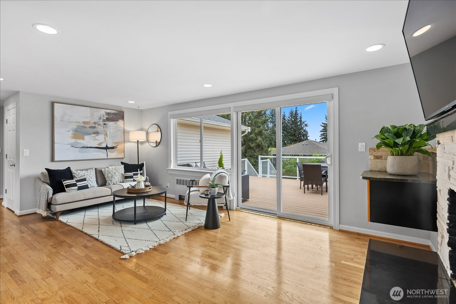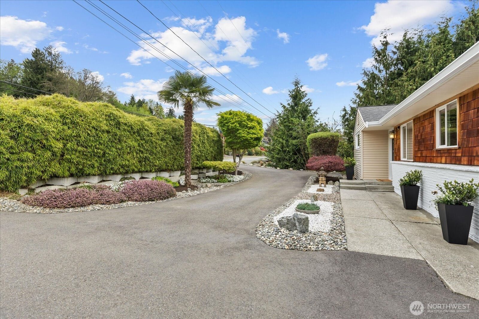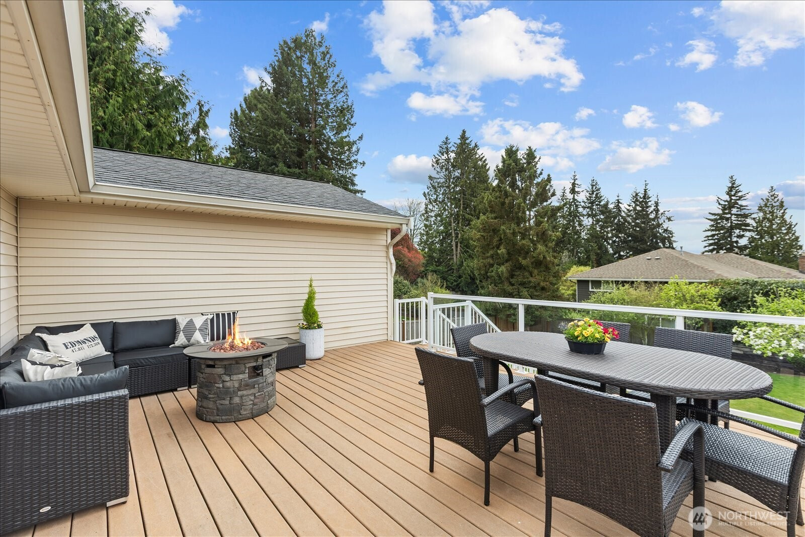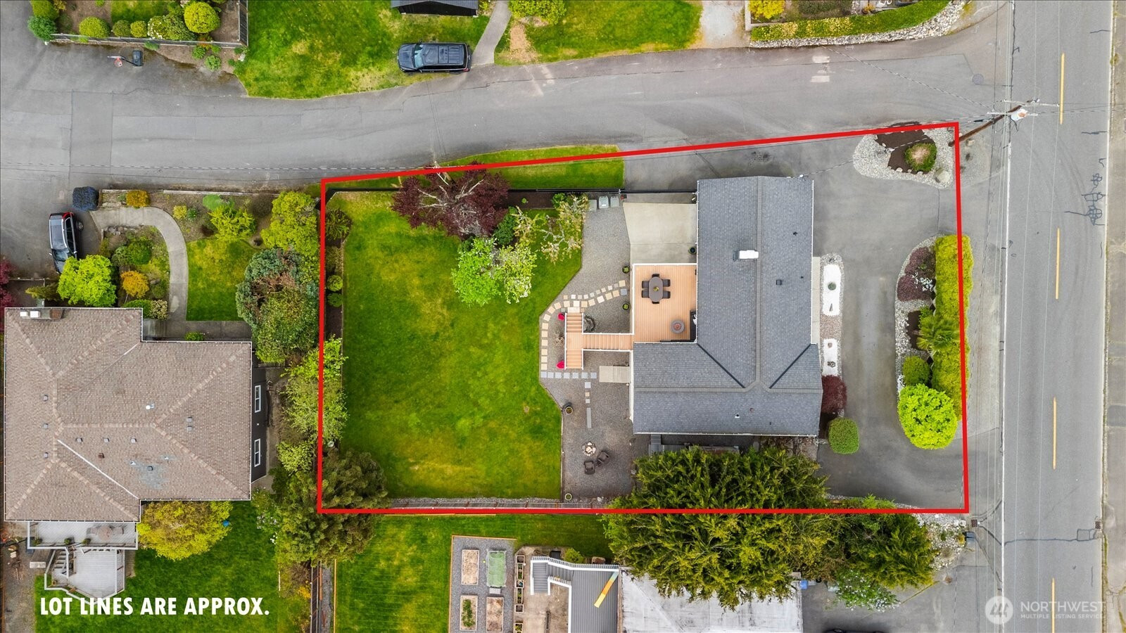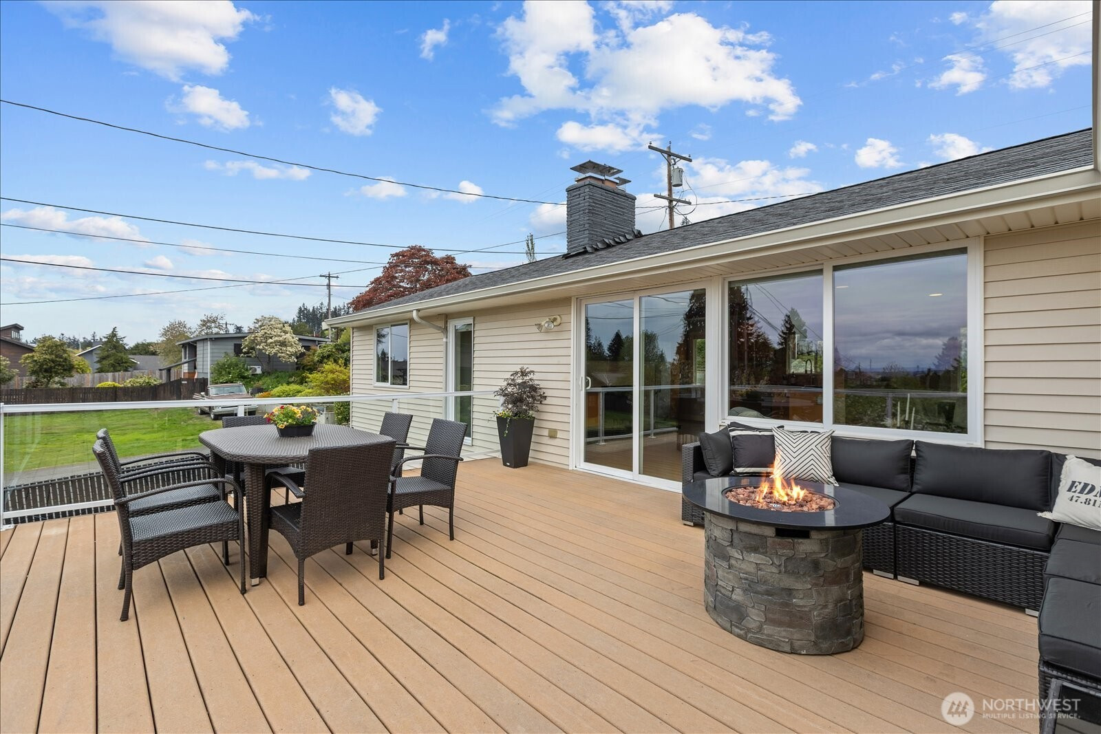 Welcome to Edmonds Bowl, where views of the Puget Sound and Olympic Mountains create a stunning backdrop that never gets old. Perfectly set on a spacious corner lot adjacent to a quiet private drive, this immaculate one-story home with a basement is thoughtfully designed for both everyday living and effortless entertaining. Fresh interior paint and hardwood floors span the main level, creating a warm, inviting atmosphere. The open-concept living space is full of natural light, with a large picture window framing unforgettable sunsets and ever-changing skies. A sliding glass door opens to the west-facing deck and backyard, ideal for morning coffee or simply taking in the beauty. The kitchen features fir beams and cabinetry, granite countertops, LVT flooring, and stainless steel appliances. The primary ensuite offers a spa-like feel with a jetted tub, walk-in shower, and an expansive wall of closet space. The lower level adds incredible versatility, featuring a 3rd bedroom, ¾ bath, laundry, and spacious living room complete with a 2nd kitchen, quartz counters and high bar seating-ideal for guests, multi-generational living or entertaining. This level offers direct access to the patio and meticulously maintained fenced backyard designed for relaxation and enjoyment. The rolling gate allows for privacy, accessibility for one-level entry and extra parking while the circular driveway and off-street parking ensure space for all. Edmonds School District. Pre-inspected & sewer-scoped.