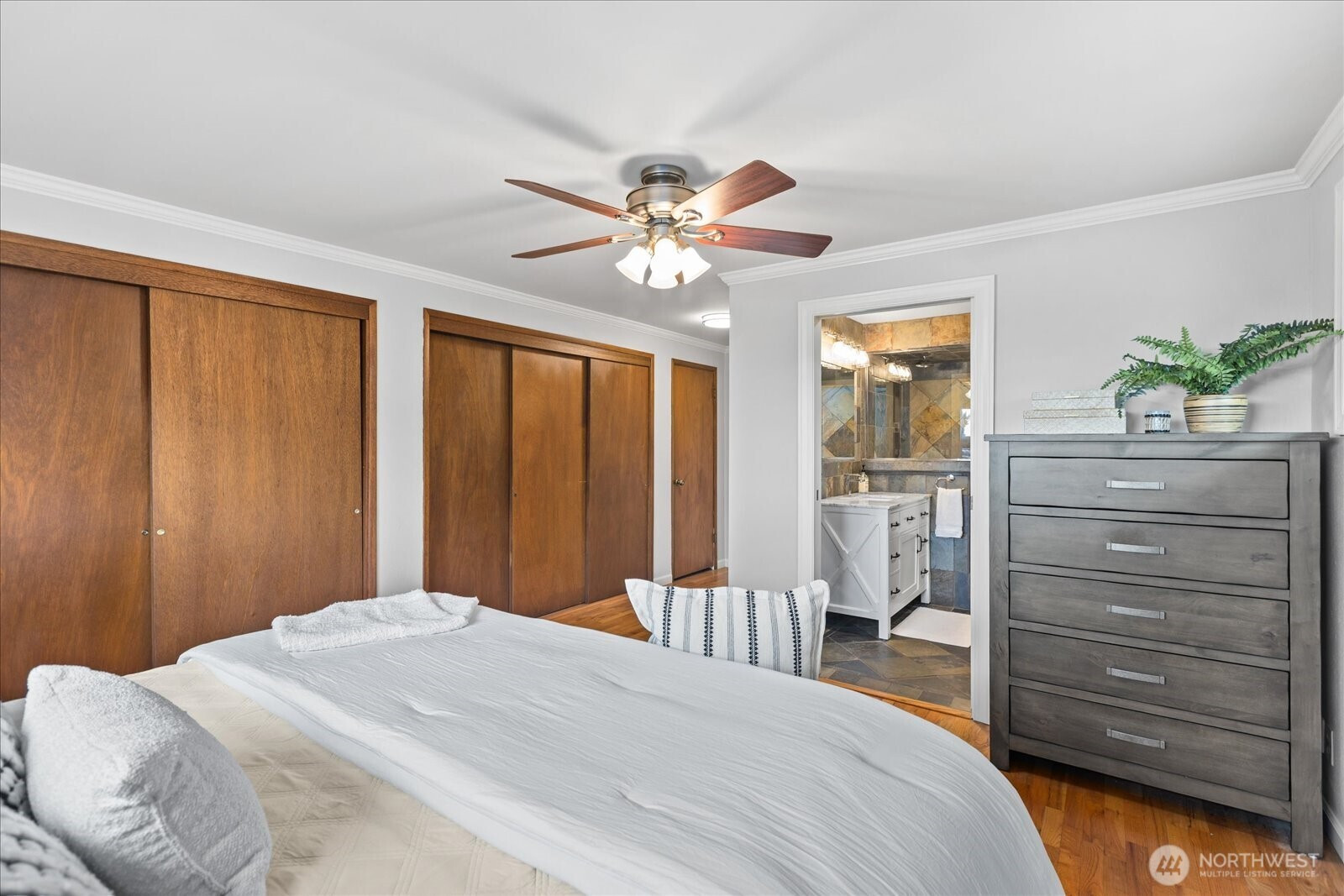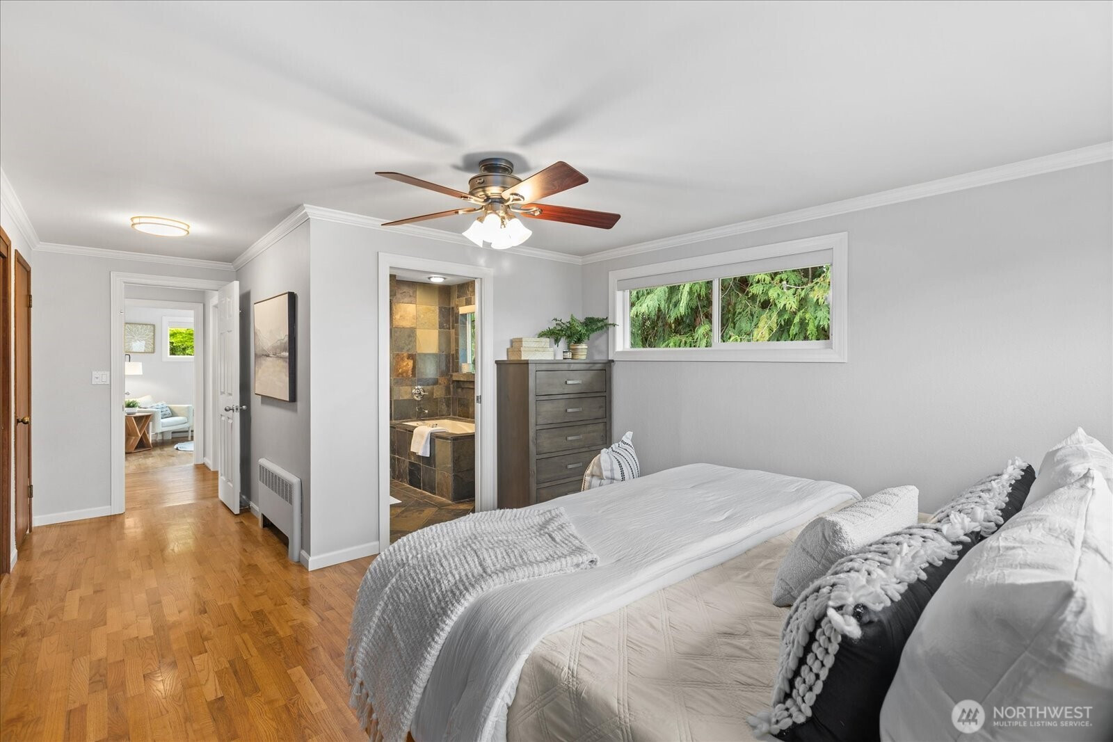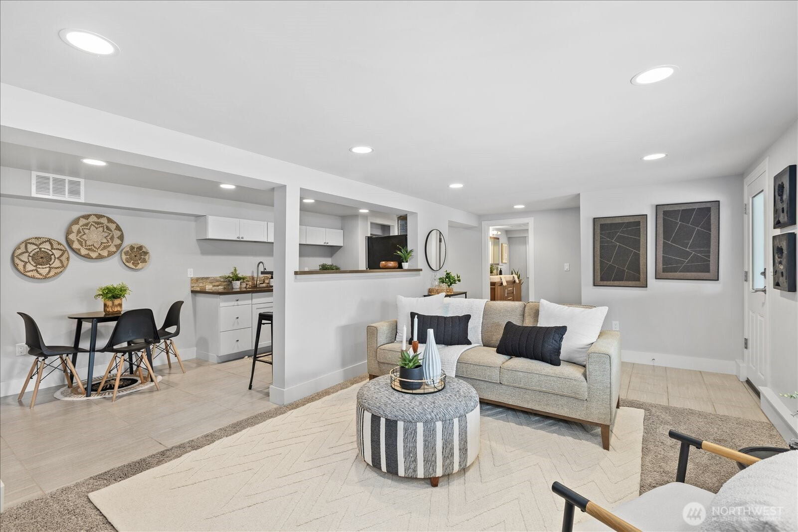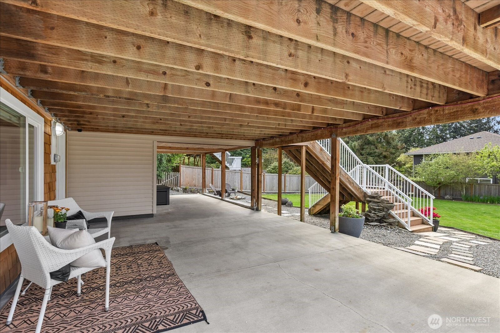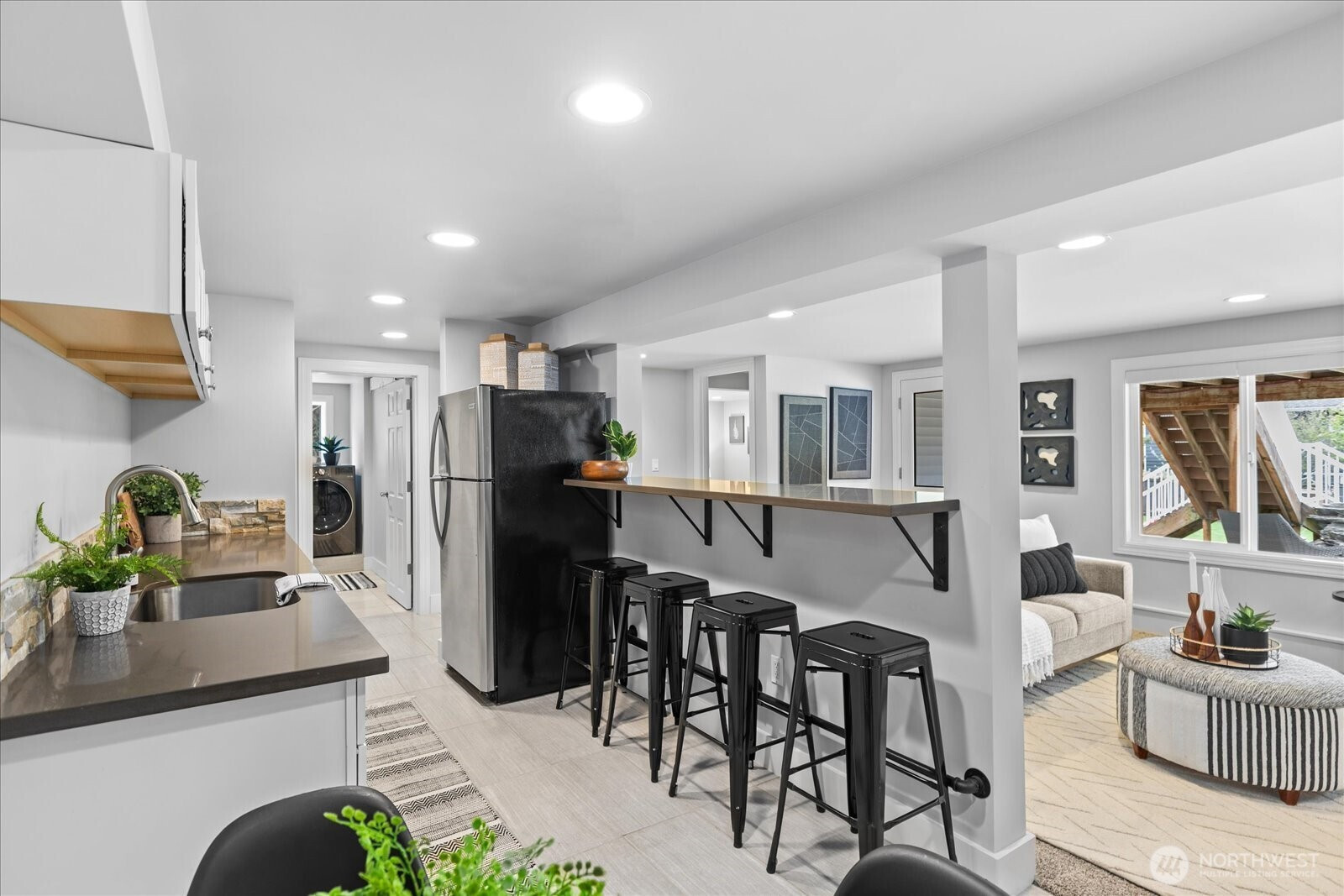 Welcome to Edmonds Bowl, where views of the Puget Sound and Olympic Mountains create a stunning backdrop that never gets old. Perfectly set on a spacious corner lot adjacent to a quiet private drive, this immaculate one-story home with a basement is thoughtfully designed for both everyday living and effortless entertaining. Fresh interior paint and hardwood floors span the main level, creating a warm, inviting atmosphere. The open-concept living space is full of natural light, with a large picture window framing unforgettable sunsets and ever-changing skies. A sliding glass door opens to the west-facing deck and backyard, ideal for morning coffee or simply taking in the beauty. The kitchen features fir beams and cabinetry, granite countertops, LVT flooring, and stainless steel appliances. The primary ensuite offers a spa-like feel with a jetted tub, walk-in shower, and an expansive wall of closet space. The lower level adds incredible versatility, featuring a 3rd bedroom, ¾ bath, laundry, and spacious living room complete with a 2nd kitchen, quartz counters and high bar seating-ideal for guests, multi-generational living or entertaining. This level offers direct access to the patio and meticulously maintained fenced backyard designed for relaxation and enjoyment. The rolling gate allows for privacy, accessibility for one-level entry and extra parking while the circular driveway and off-street parking ensure space for all. Edmonds School District. Pre-inspected & sewer-scoped.
