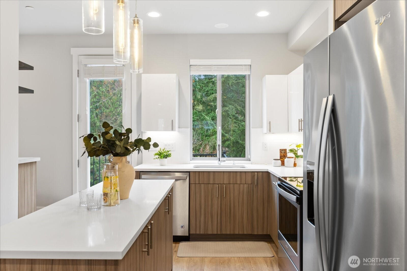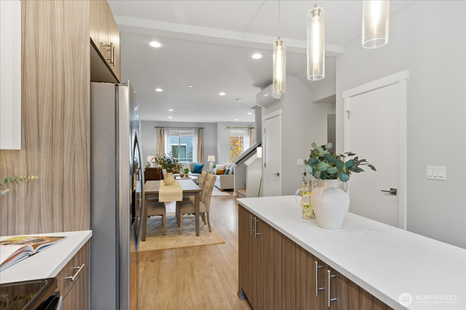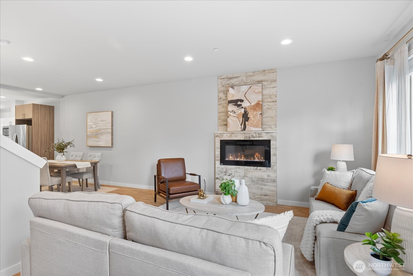 Modern living in Edmonds! Nestled in an intimate Edmonds enclave, this 2019-built 2-bed, 2.25-bath townhouse offers modern comfort and standout amenities, including a one-of-a-kind private fenced dog park and close proximity to local community parks. HOA-maintained landscaping and additional guest parking add ease of ownership. Inside, enjoy superior finishes such as a gourmet kitchen with island seating, designer Bellmont cabinets, quartz countertops, and an stylish floor-to-ceiling tile-wrapped electric fireplace. A split HVAC system and dedicated office nook complement the space. All appliances are included, along with two covered parking spots and one uncovered.