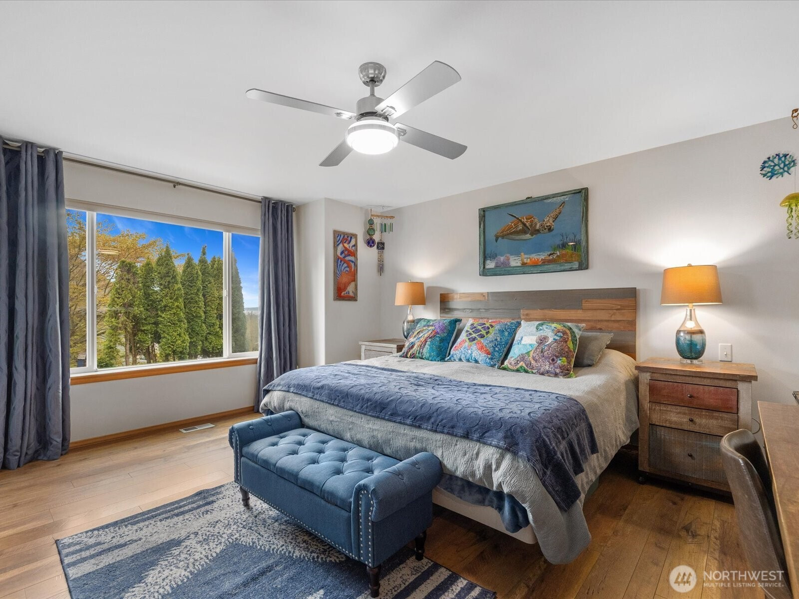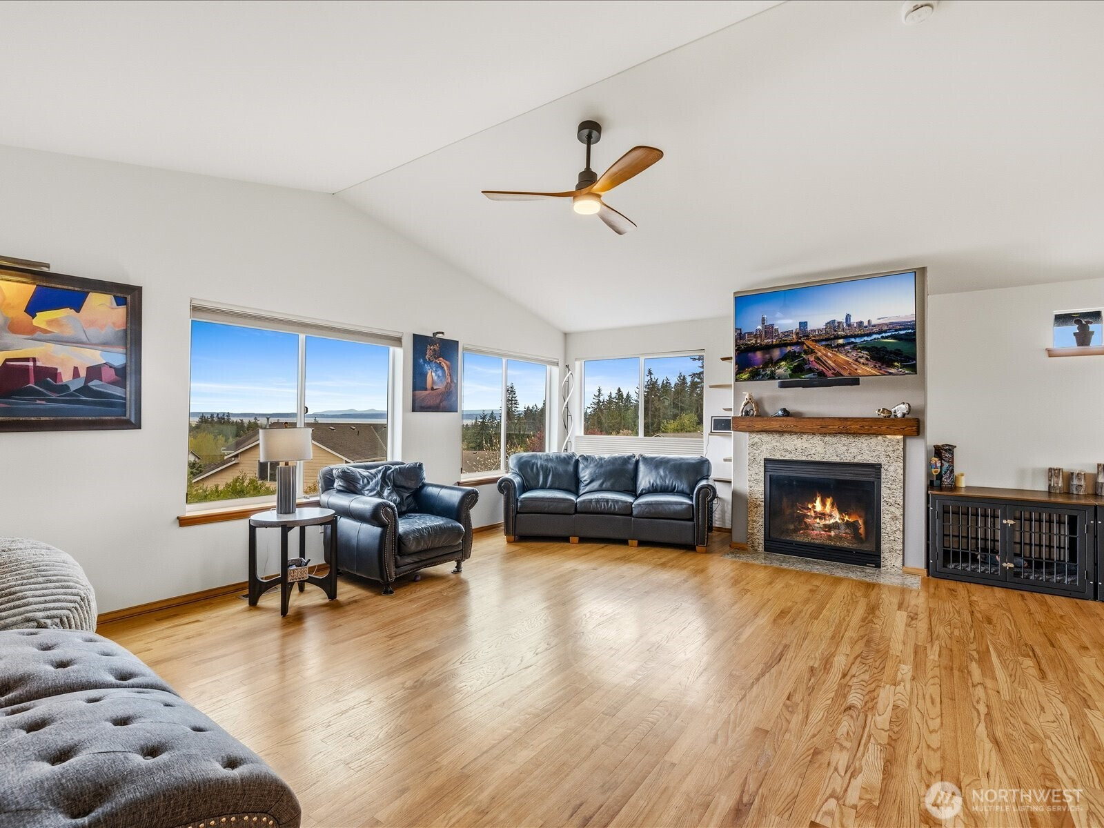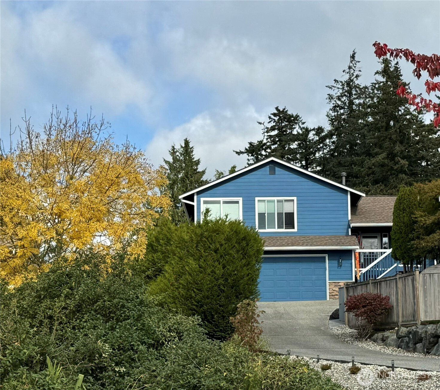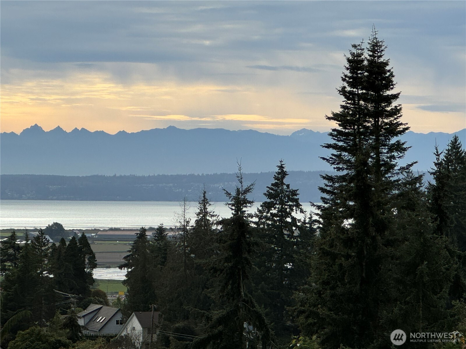 Stunning Views of the Sound(Skagit Bay & Port Susan Bay), the Olympic Mountains, City, Sunsets, & Valley. Be prepared to be impressed by this Tri-Level's quality and condition. Enjoy all the privacy tucked back into a well appointed park like flagpole lot allowing parking for up to 5 additional cars. Soaring ceilings greet you as you enter into the foyer, up a few steps to the kitchen & great room that offer the most spectacular west facing views. Vaulted ceilings, gas fireplace, and lifetime Hunter Douglas dual blinds on windows and slider. The renovated kitchen offers upscale finishes and appliances, upgraded Composite Granite Sink. Enjoy entertaining and privacy on the newer TREX deck off of the dining area. Hardwood and LVT flow throughout the home. The primary suite includes a fully remodeled spa like bath. Two additional bedrooms are serviced by another renovated full bath, The lower level bonus room has endless possibilities and boasts newer LVP flooring. All bedrooms and bathrooms on the main floor. Lower level/great room offers access door to garage. Pride of ownership shines in every aspect of this Well maintained home. Be sure to check out this AMAZING yard with side entertainment covered deck and extraordinary foliage. List of plants, shrubs, and trees in supplements. THIS IS A MUST SEE!