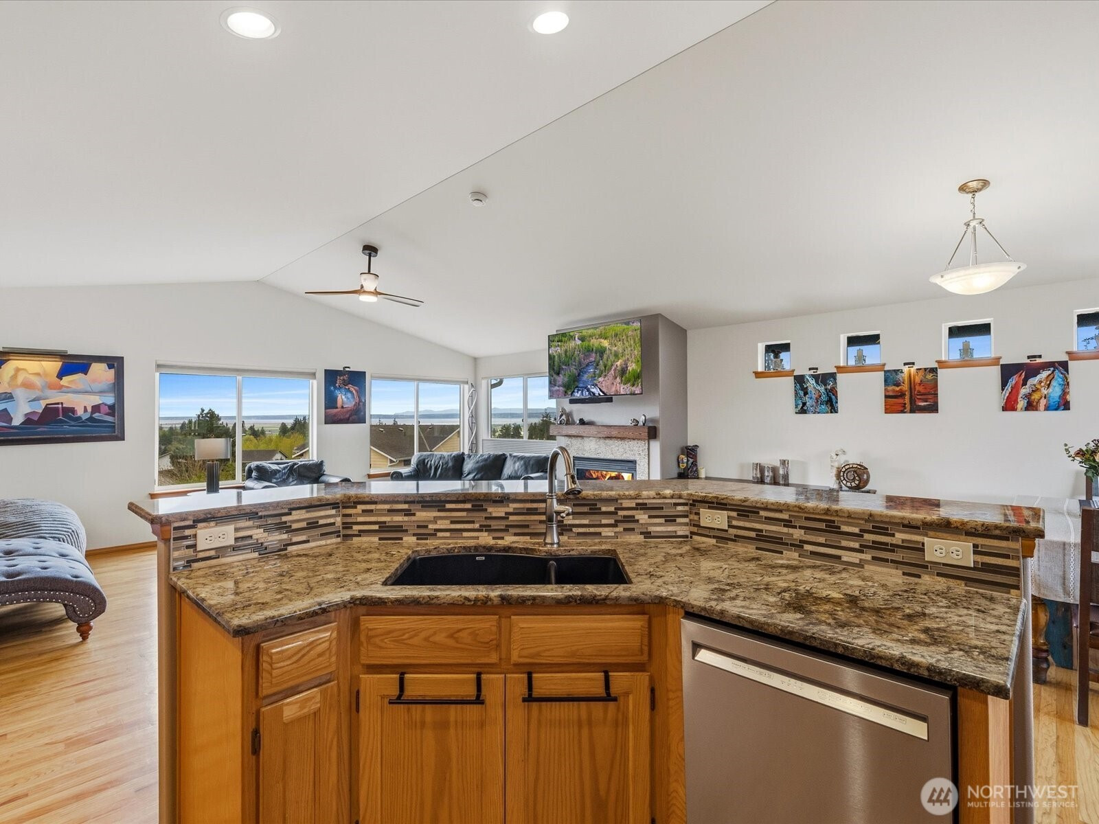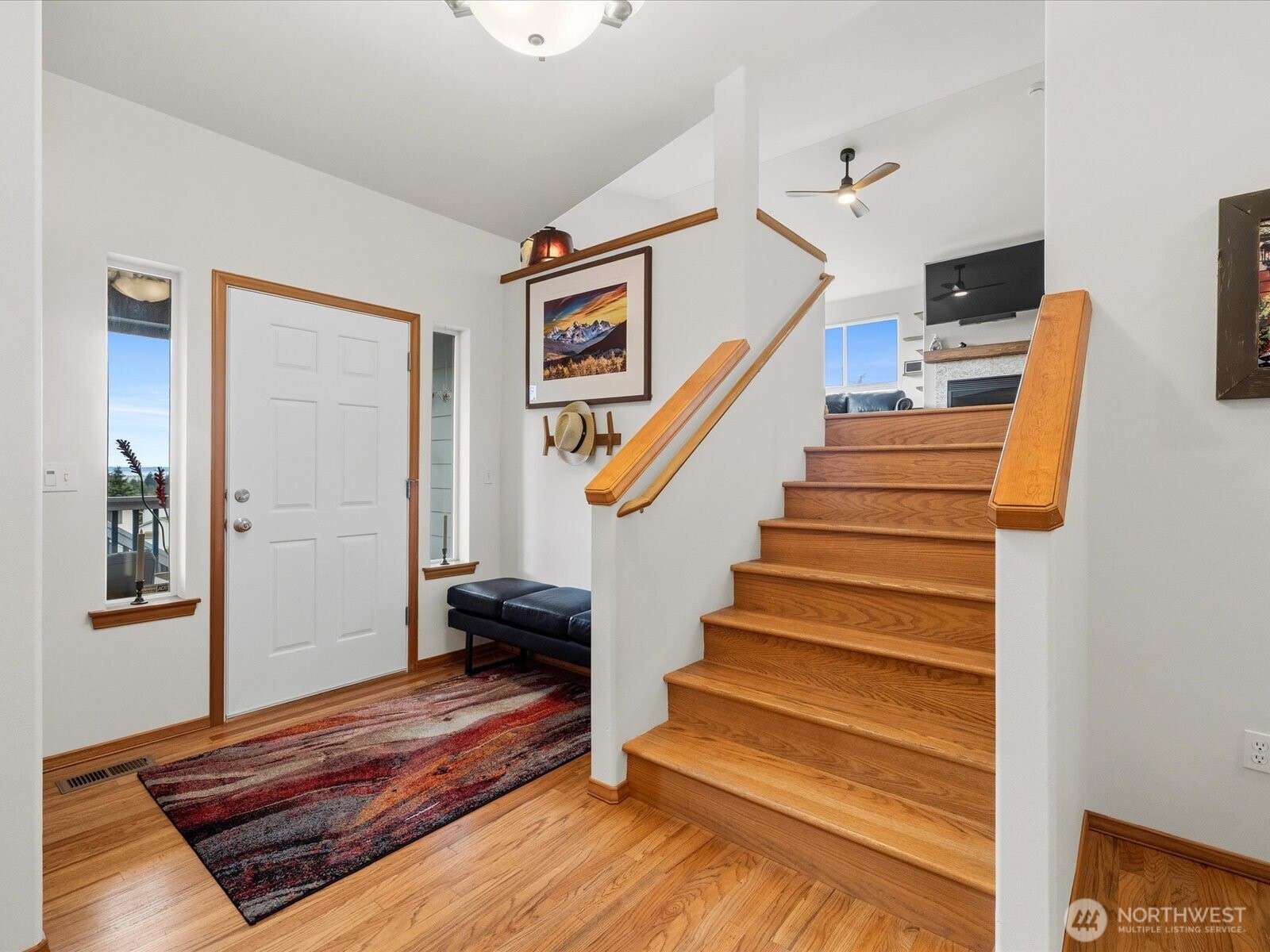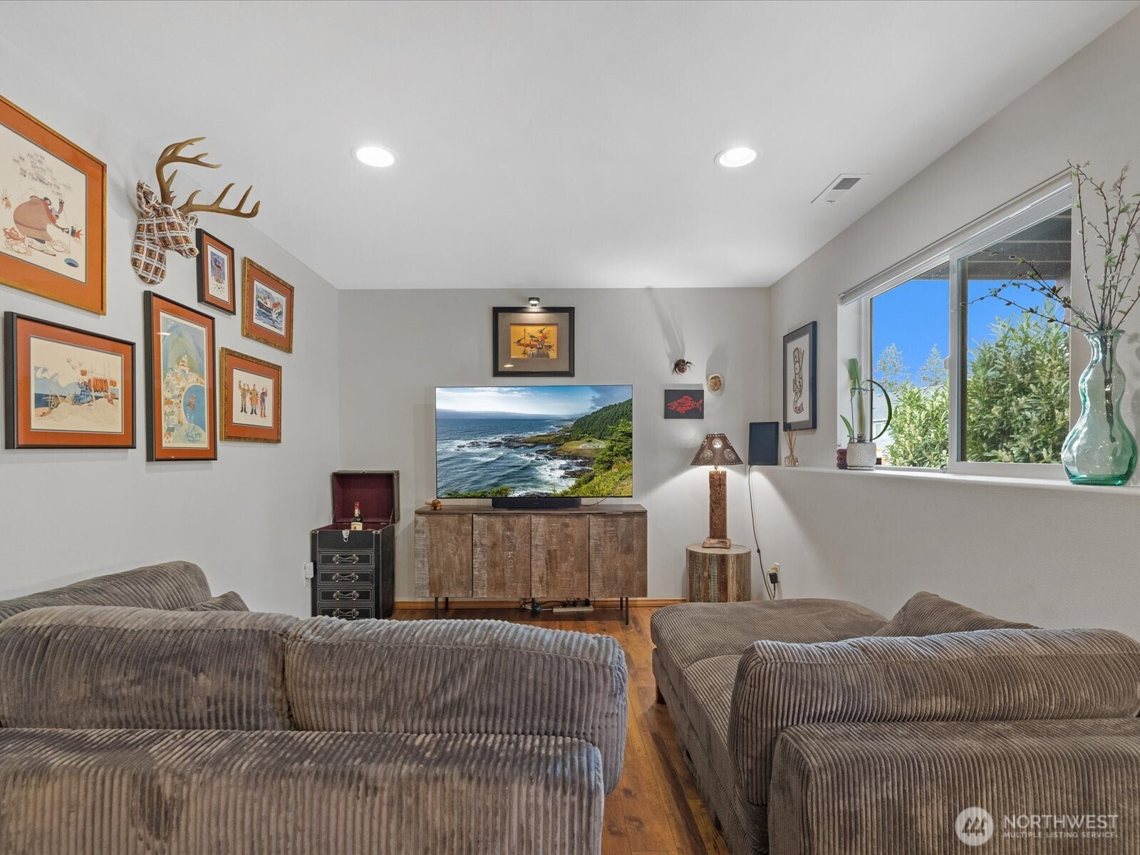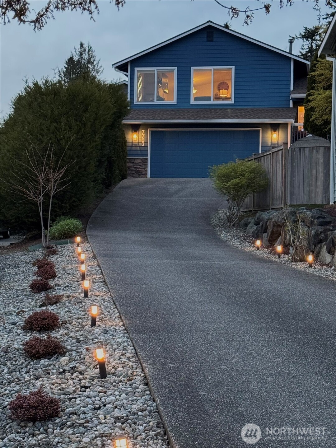 Stunning Views of the Sound(Skagit Bay & Port Susan Bay), the Olympic Mountains, City, Sunsets, & Valley. Be prepared to be impressed by this Tri-Level's quality and condition. Enjoy all the privacy tucked back into a well appointed park like flagpole lot allowing parking for up to 5 additional cars. Soaring ceilings greet you as you enter into the foyer, up a few steps to the kitchen & great room that offer the most spectacular west facing views. Vaulted ceilings, gas fireplace, and lifetime Hunter Douglas dual blinds on windows and slider. The renovated kitchen offers upscale finishes and appliances, upgraded Composite Granite Sink. Enjoy entertaining and privacy on the newer TREX deck off of the dining area. Hardwood and LVT flow throughout the home. The primary suite includes a fully remodeled spa like bath. Two additional bedrooms are serviced by another renovated full bath, The lower level bonus room has endless possibilities and boasts newer LVP flooring. All bedrooms and bathrooms on the main floor. Lower level/great room offers access door to garage. Pride of ownership shines in every aspect of this Well maintained home. Be sure to check out this AMAZING yard with side entertainment covered deck and extraordinary foliage. List of plants, shrubs, and trees in supplements. THIS IS A MUST SEE!