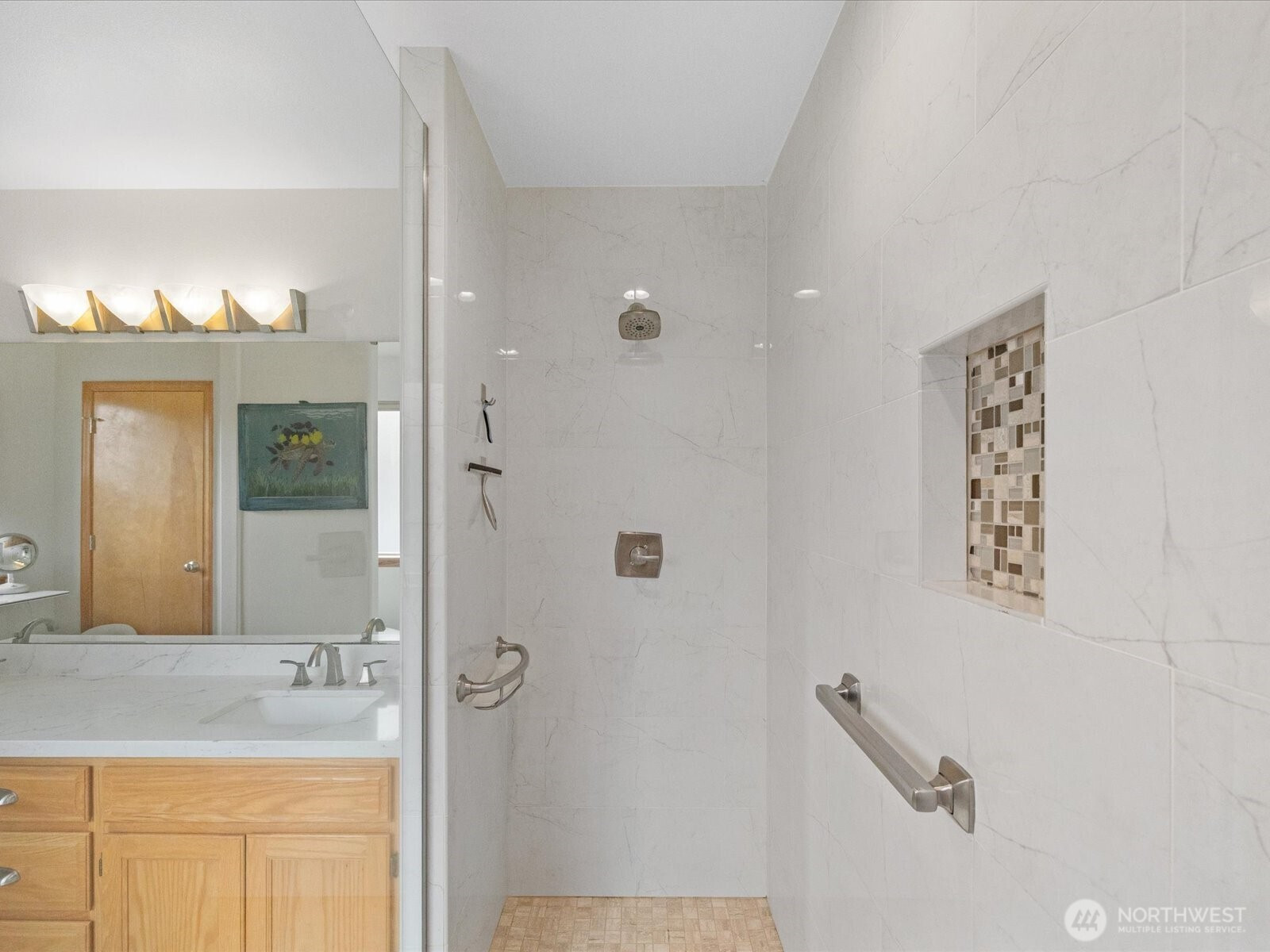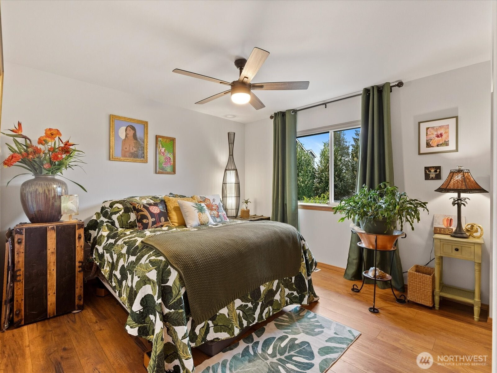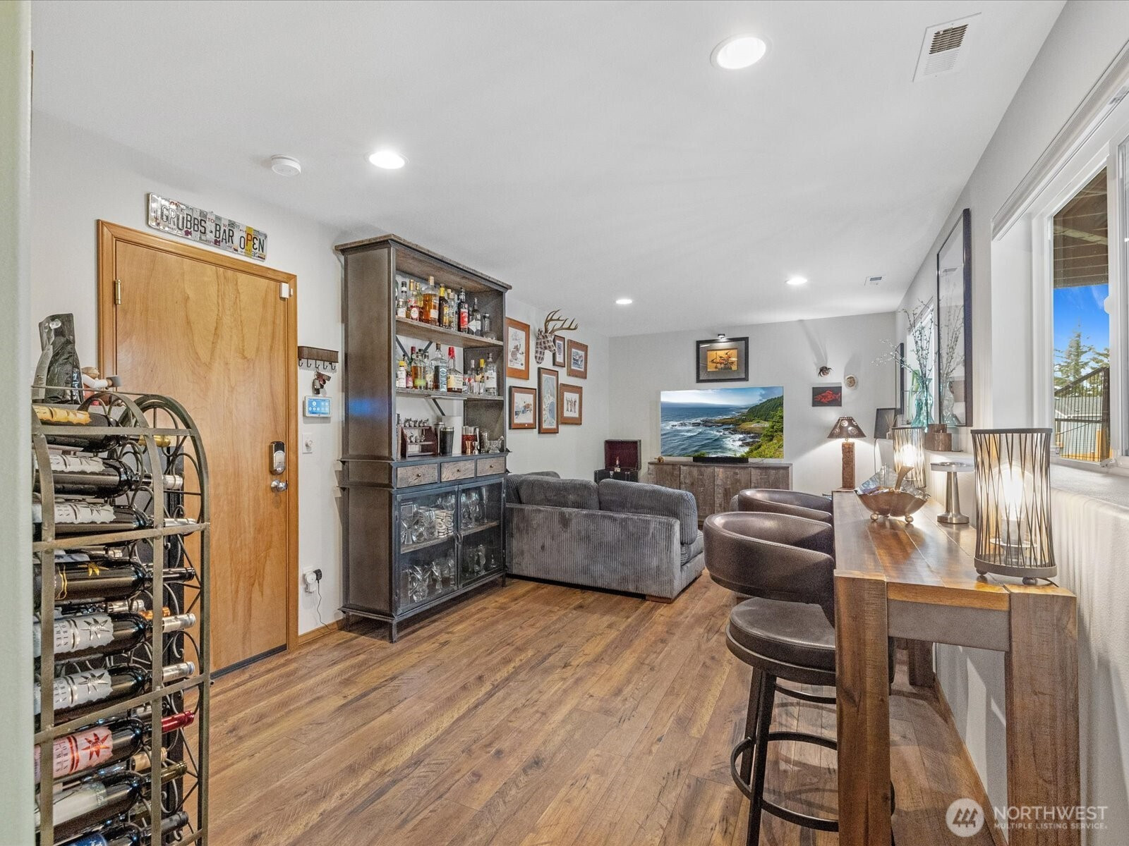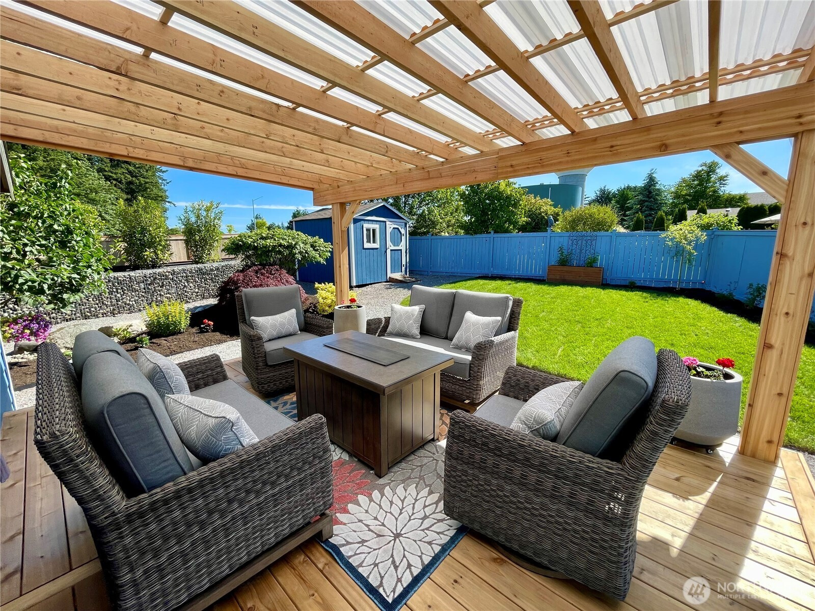 Stunning Views of the Sound(Skagit Bay & Port Susan Bay), the Olympic Mountains, City, Sunsets, & Valley. Be prepared to be impressed by this Tri-Level's quality and condition. Enjoy all the privacy tucked back into a well appointed park like flagpole lot allowing parking for up to 5 additional cars. Soaring ceilings greet you as you enter into the foyer, up a few steps to the kitchen & great room that offer the most spectacular west facing views. Vaulted ceilings, gas fireplace, and lifetime Hunter Douglas dual blinds on windows and slider. The renovated kitchen offers upscale finishes and appliances, upgraded Composite Granite Sink. Enjoy entertaining and privacy on the newer TREX deck off of the dining area. Hardwood and LVT flow throughout the home. The primary suite includes a fully remodeled spa like bath. Two additional bedrooms are serviced by another renovated full bath, The lower level bonus room has endless possibilities and boasts newer LVP flooring. All bedrooms and bathrooms on the main floor. Lower level/great room offers access door to garage. Pride of ownership shines in every aspect of this Well maintained home. Be sure to check out this AMAZING yard with side entertainment covered deck and extraordinary foliage. List of plants, shrubs, and trees in supplements. THIS IS A MUST SEE!
