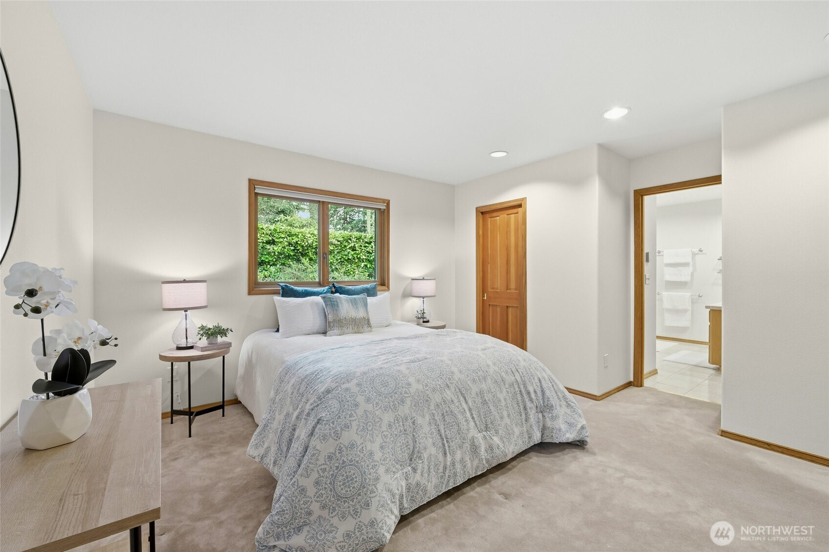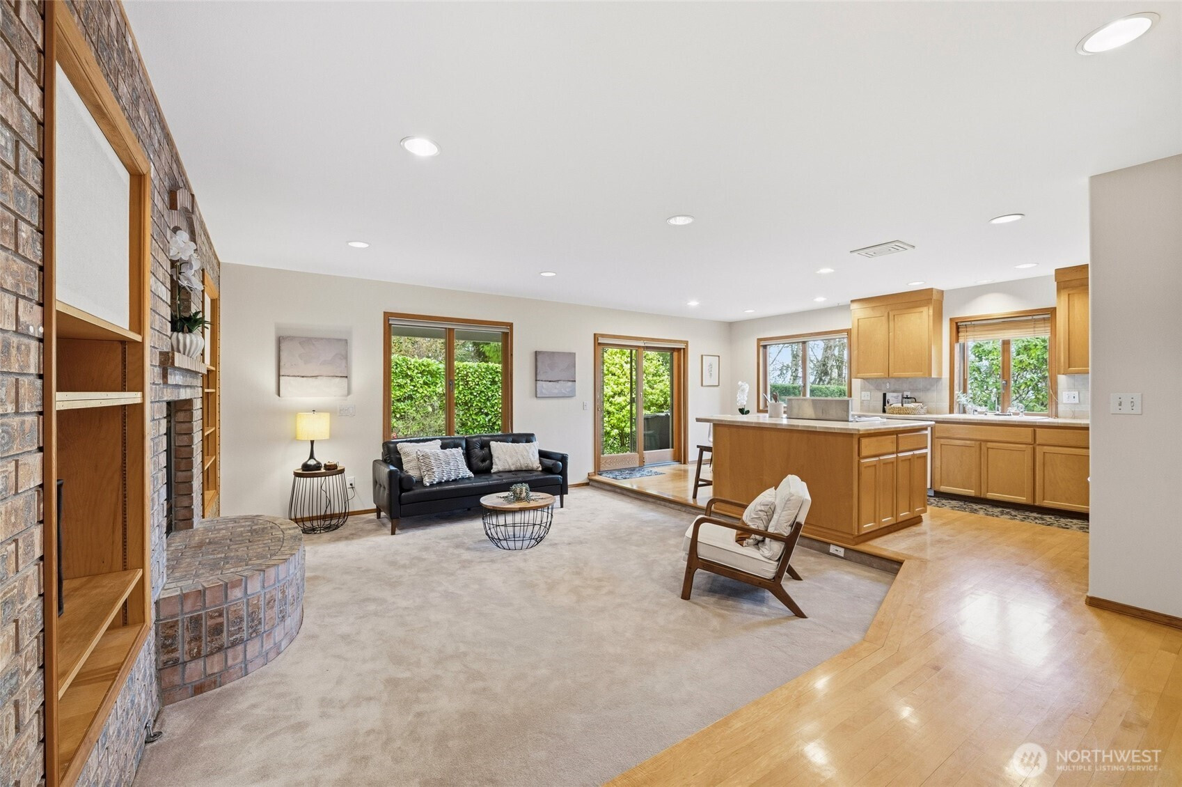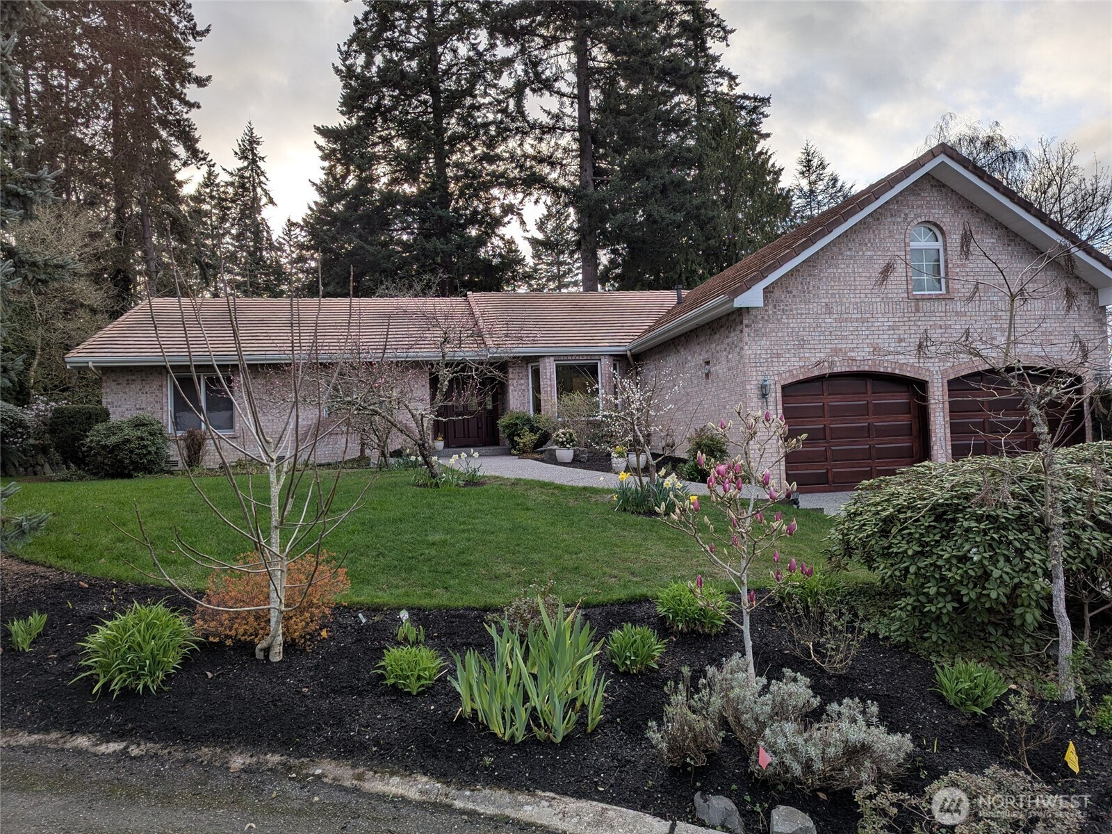 Stately and timeless brick upscale rambler design with more to offer! Enjoy over 1/4 acre of manicured grounds surrounded by nature on a quiet cul-de-sac moments from everything! East-facing windows draw in soft morning sun & fantastic natural light while trees all around provide dappled shade in the summertime. Life flows easily through the functional, open layout w/ maple hardwood floors, Andersen windows, efficient cellular shades & a cozy gas fireplace surrounded by built-ins & a custom brick mantle. Hosting & entertaining is a breeze between the formal dining room & the roomy kitchen, equipped w/ gas cooking, maple cabinetry, an island w/ bar seats & a spacious eating nook w/ a peekaboo Puget Sound view. Versatile layout w/ 4 large bedrooms, including a king-sized primary boasting dual closets & an en suite w/ heated floors & a jetted tub. Upstairs, a large & light-filled bonus room offers endless possibility: a home office, theater, 5th bedroom, play area, or whatever else you can imagine! The covered patio overlooks the lush, private backyard, mature fruit trees & ample space for pets, play & additional gardens (kept watered by a 7-zone sprinkler system). Attached 2-car garage w/ custom redwood doors includes a shop space & storage room for all your projects, gear & hobbies. Quiet & private, this house is located in an amazingly beautiful, peaceful, and walkable neighborhood that has expansive views of Puget Sound, parks, cafes, and shops within strolling distance.