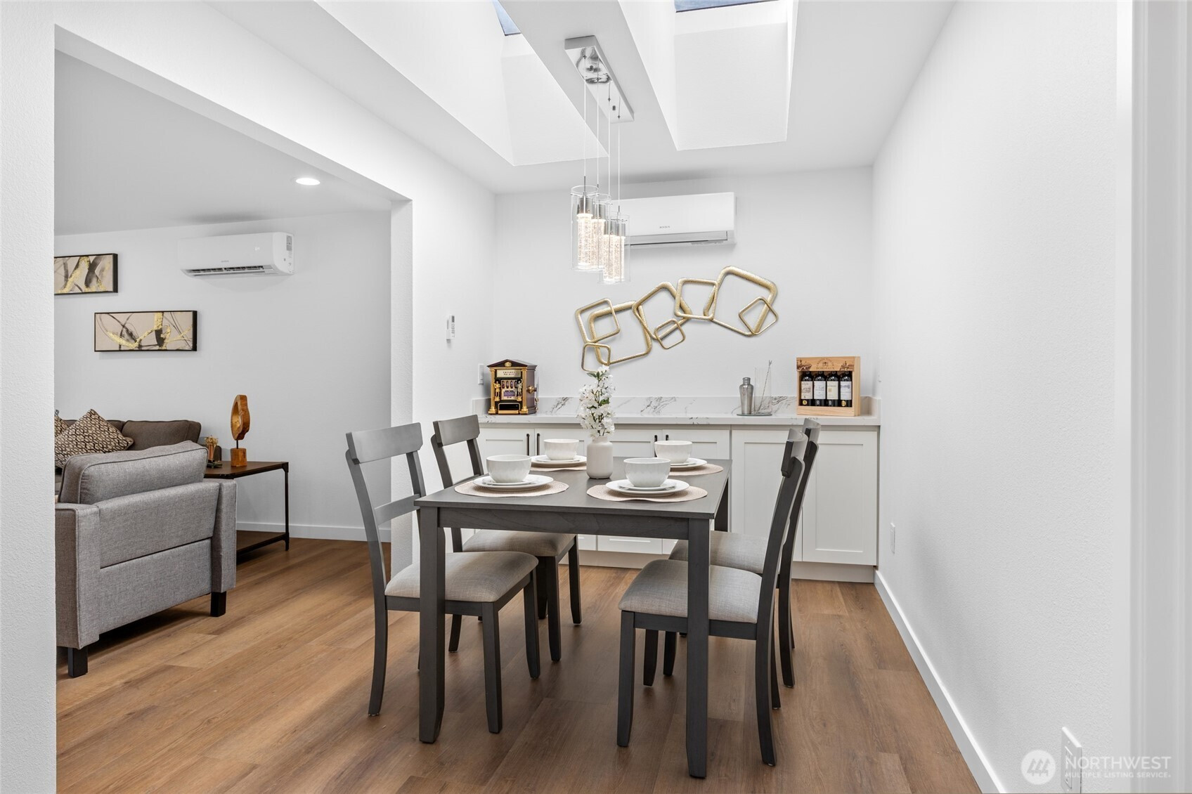 This fully remodeled 1,668 sq ft single-story home in the Edmonds community is situated on a 7,405 sq ft lot and features skylights throughout, creating an inviting atmosphere with abundant natural light. The interior includes new paint, updated flooring, and a dining room with a built-in bar. The updated kitchen provides new countertops, cabinetry, and ample storage, while the bathrooms feature new vanities, hardware, and showers, including a skylight in the guest shower. The primary suite is equipped with a soaking tub, a separate shower, and twin sinks. Extensive infrastructure updates include a new house drain and supply water piping, a ductless HP-mini split system, and a fully protected electrical rough-in with Dual Function (DF) AFCI/GFCI circuit breakers. The exterior is landscaped and includes a fully fenced back yard and a storage shed.