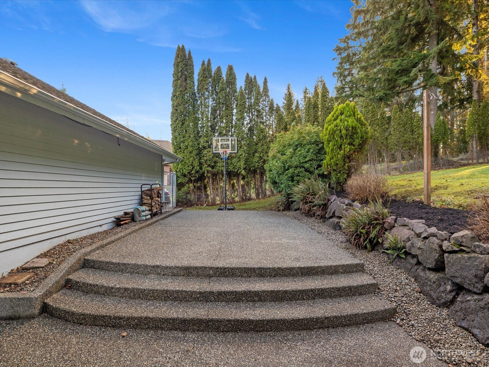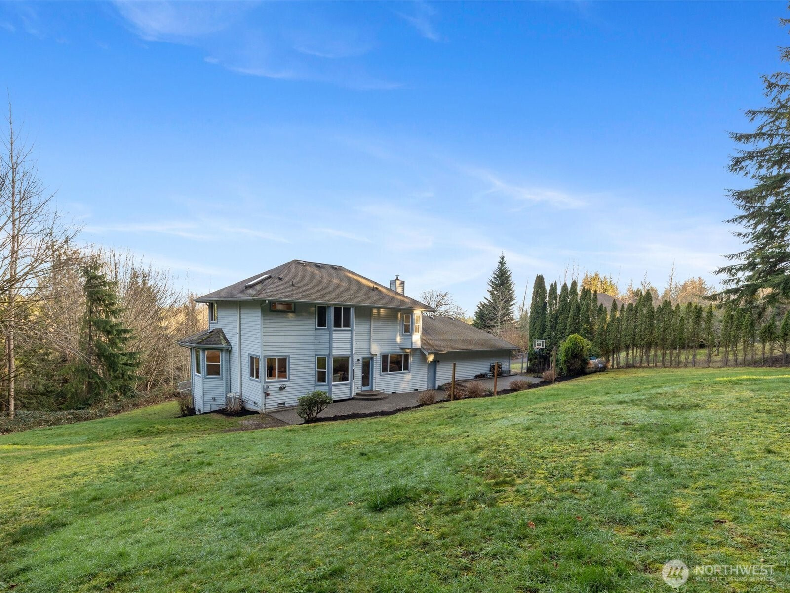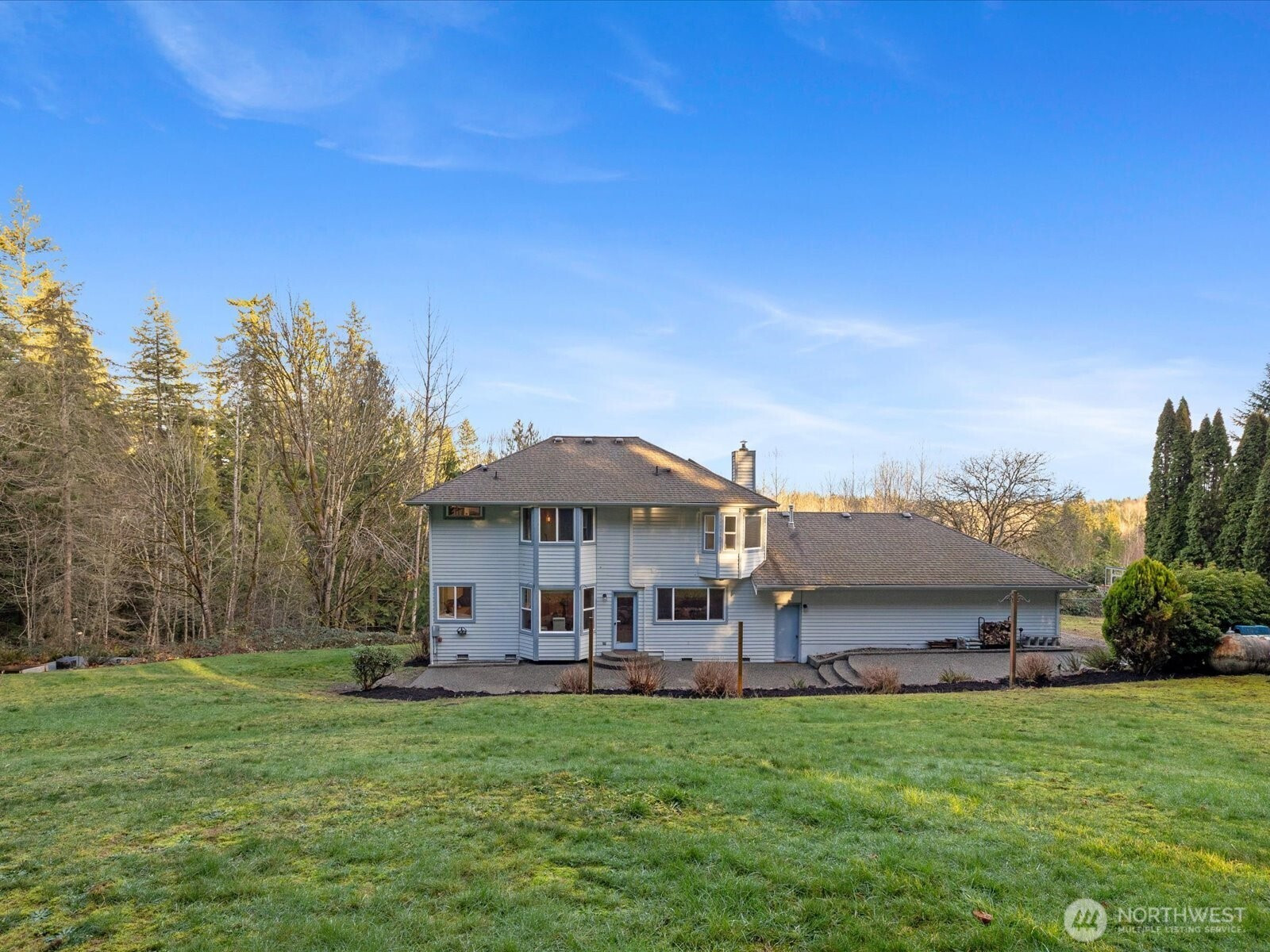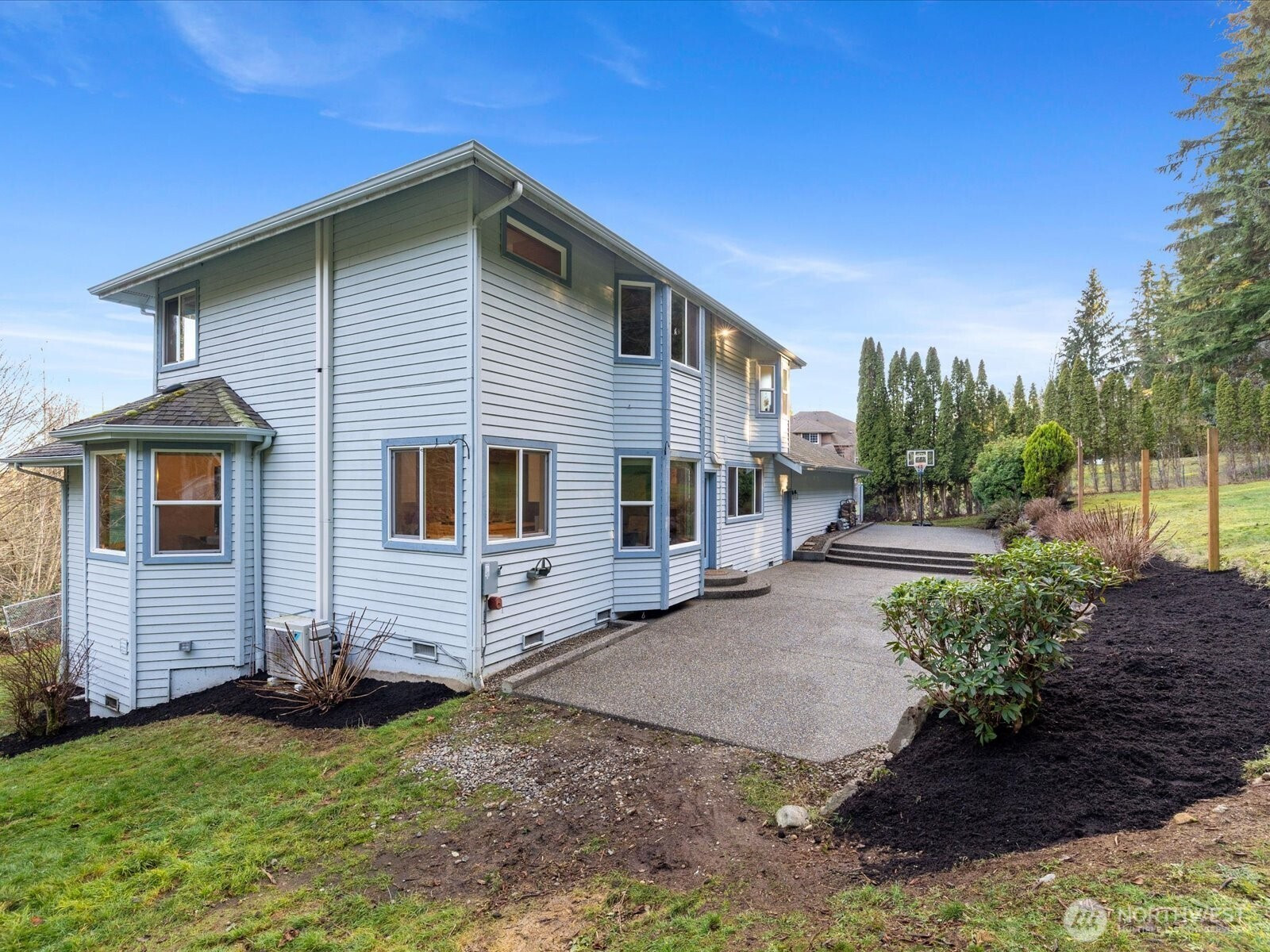 Serene hilltop sanctuary with stunning sunrise views in the desirable Meadow Estates. This graceful home perfectly balances privacy with community living, offering abundant indoor and outdoor entertaining space. Main level features a versatile office/den (4th bedroom), formal living and dining rooms, and a spacious family room with open kitchen, island, and breakfast nook. The crowning jewel is a massive aggregate patio ideal for gatherings, complete with a basketball hoop. The luxurious primary suite boasts a spa-like 5-piece en-suite and a charming bay window reading nook with mountain views. An additional upstairs landing provides the perfect retreat for a study or reading space. Comfort meets efficiency with dual heating systems—a propane furnace and a modern multi-zone ductless heat pump for year-round climate control. The convenient location offers easy access to Snohomish, Monroe, Highway 2, and Highway 522. Nestled on 2.3 private acres, this property requires minimal maintenance while maximizing seclusion. Enjoy raised garden beds for flowers and vegetables, a relaxing deck, and two storage sheds. Ample space for pets to play and explore. Safe, established neighborhood with excellent school access nearby.