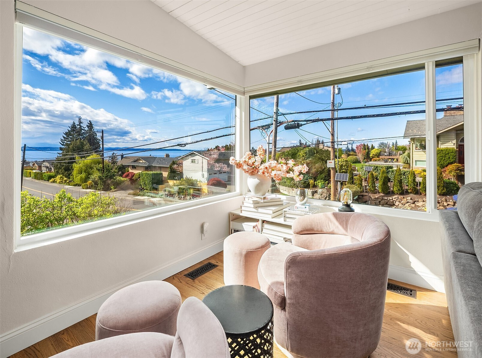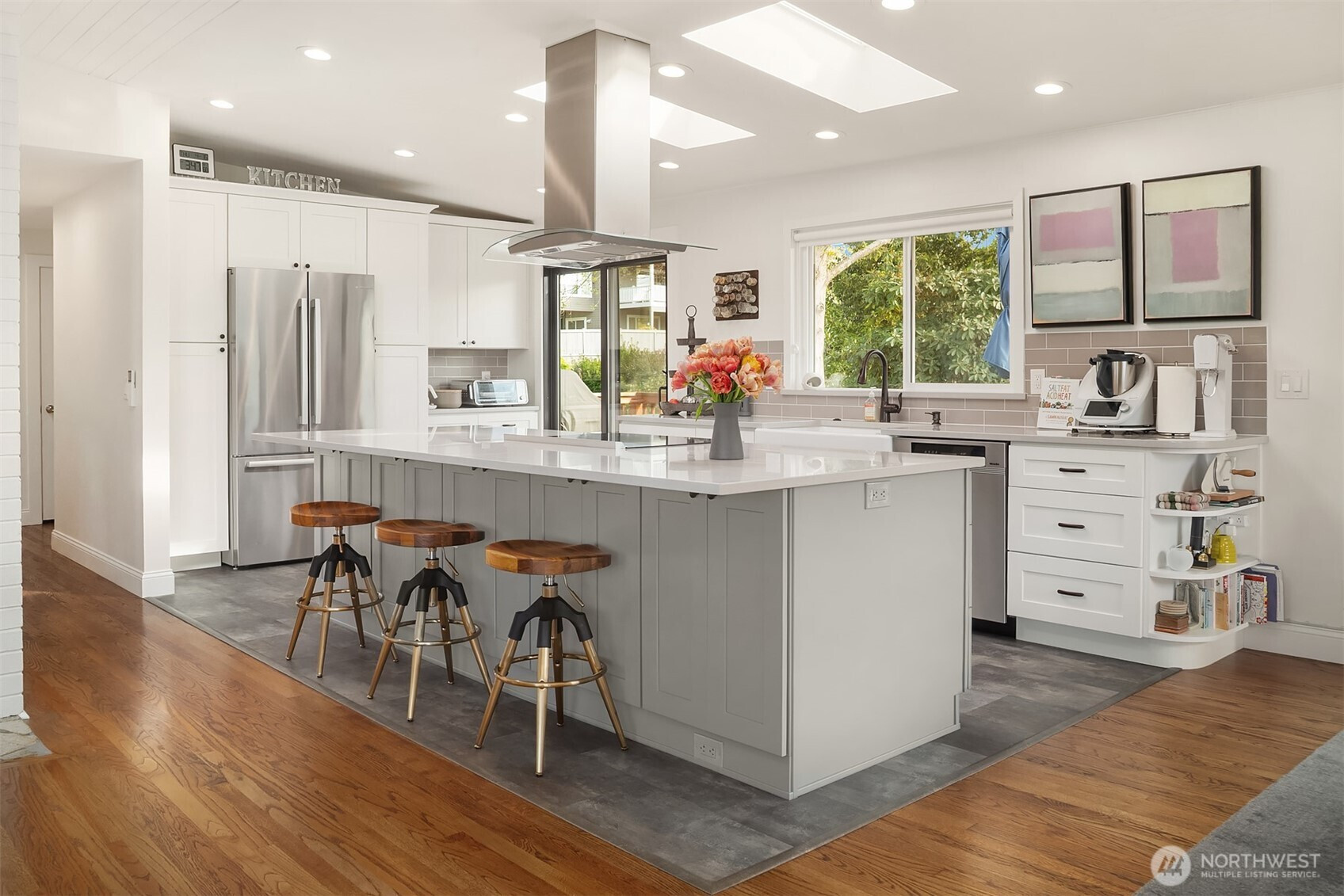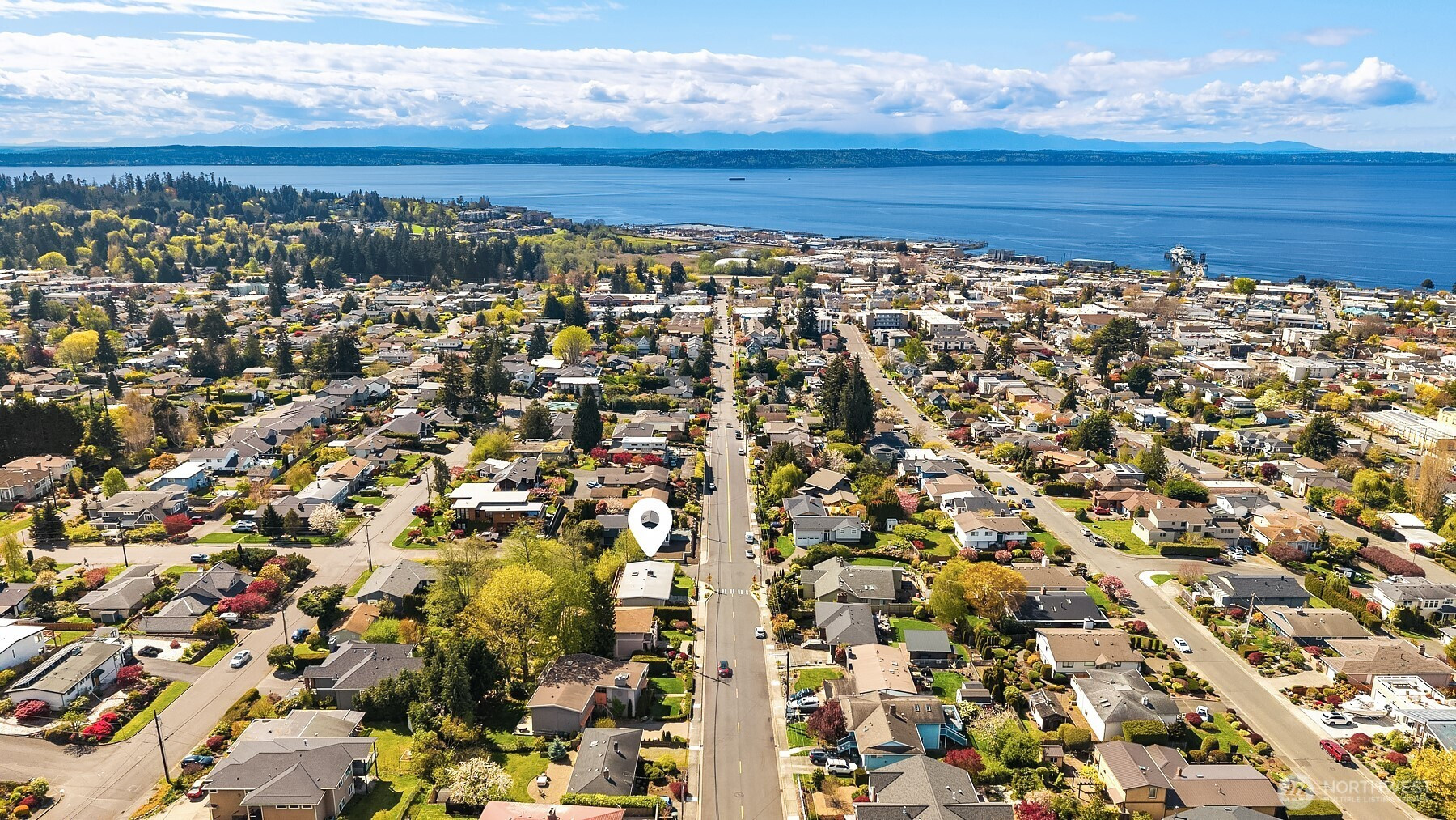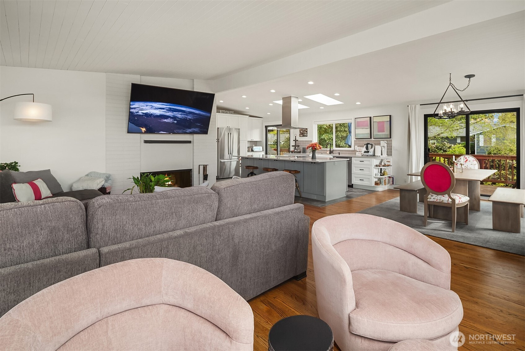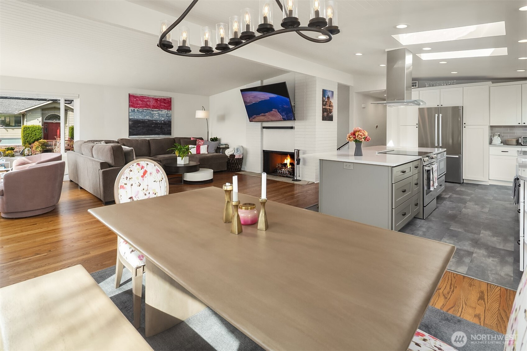 In the heart of Edmonds Bowl offering Olympic Mountain and Puget Sound views, sits this beautifully updated 4-bedroom, 1.75-bath home. The split-entry design welcomes you upstairs to a fully remodeled kitchen featuring grey quartz countertops, a slate grey island with built-in microwave and Bosch electric range, a farmhouse sink, skylights, and walls of windows that fill the space with natural light. The interior has been completely repainted, offering a fresh, move-in-ready feel. Off the kitchen is the dining area and living room with a brick wood-burning fireplace. The primary suite is conveniently located on this floor with a full ensuite bathroom. Two additional bedrooms complete this level. Downstairs features new LVP flooring and a spacious rec room with a stacked stone wood-burning fireplace. A bedroom and ¾ bath along with the laundry room are also conveniently located downstairs. Step outside to an expansive deck ideal for gatherings. Walk down the deck to the patio and enjoy the lush backyard. Unbeatable location with easy access to the ferry, waterfront, and all the shopping and dining that Edmonds has to offer.