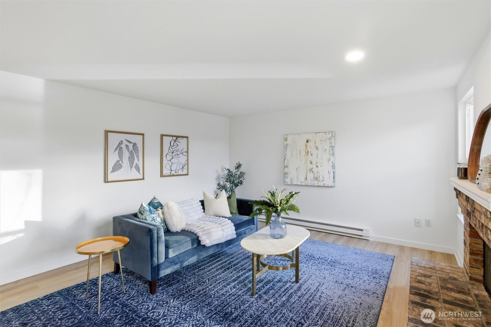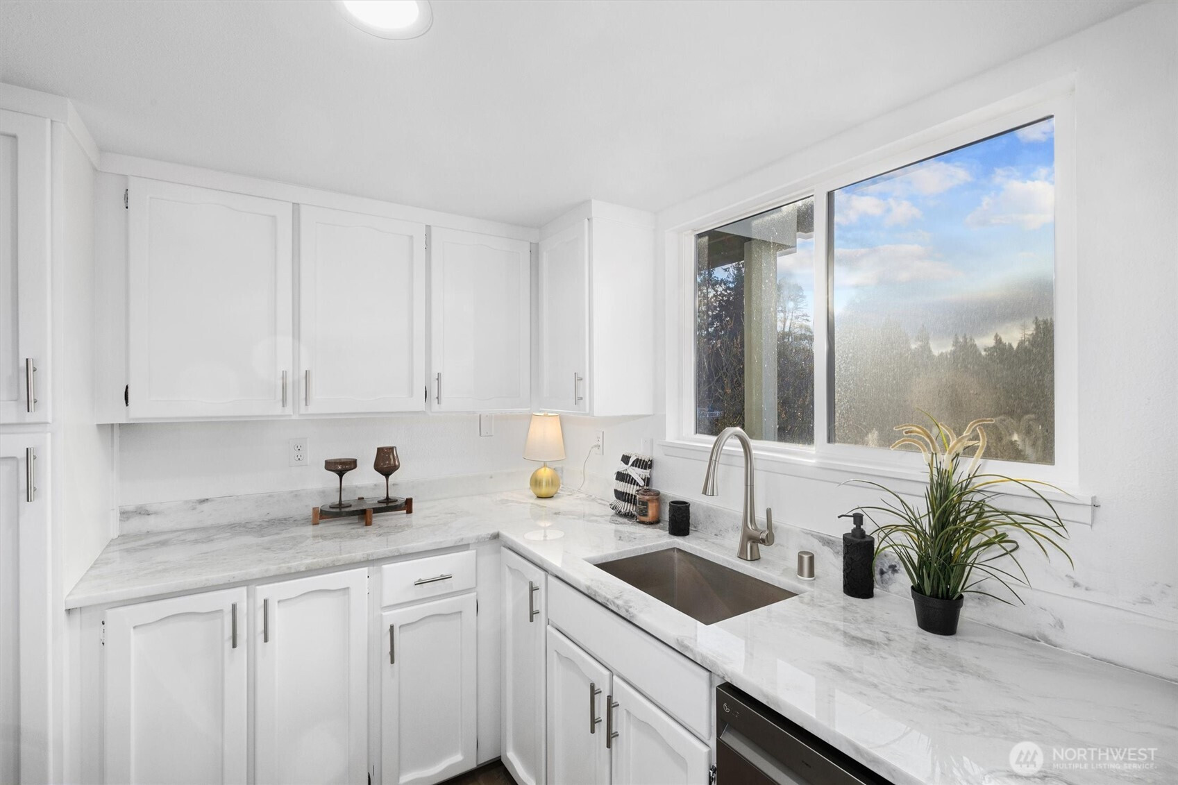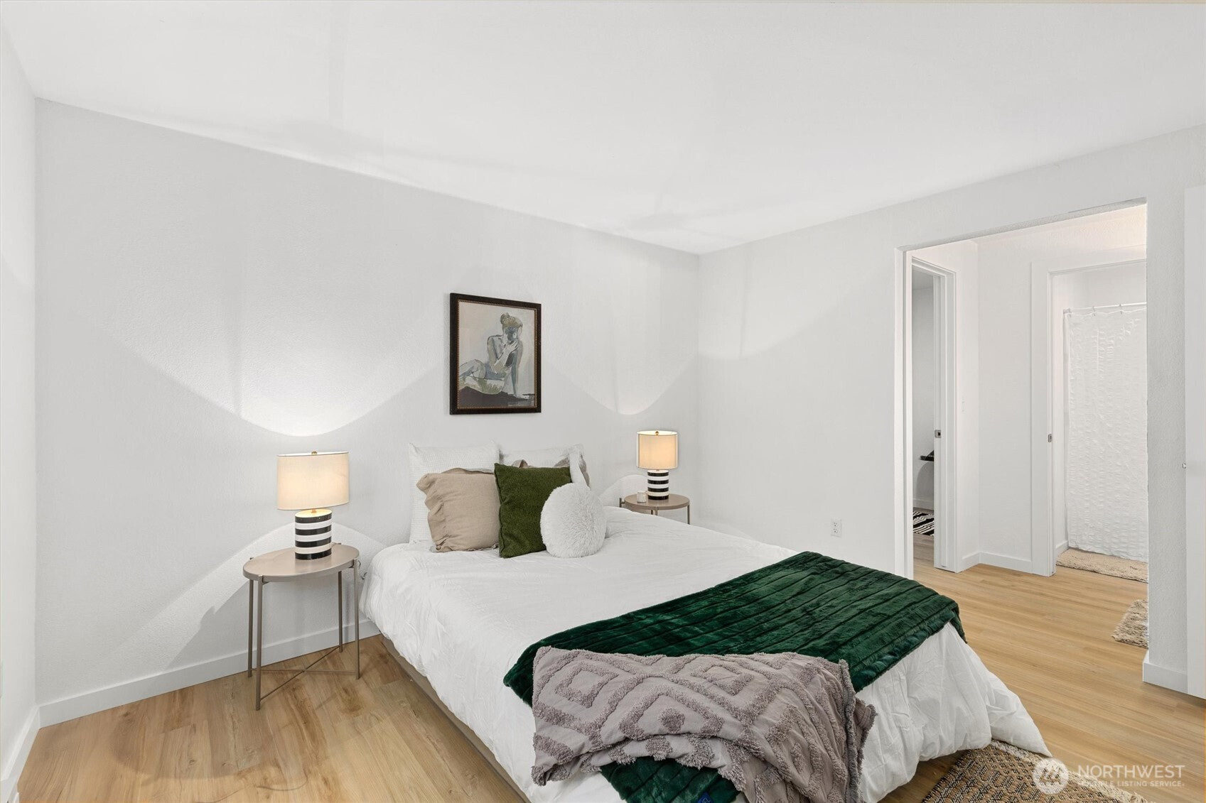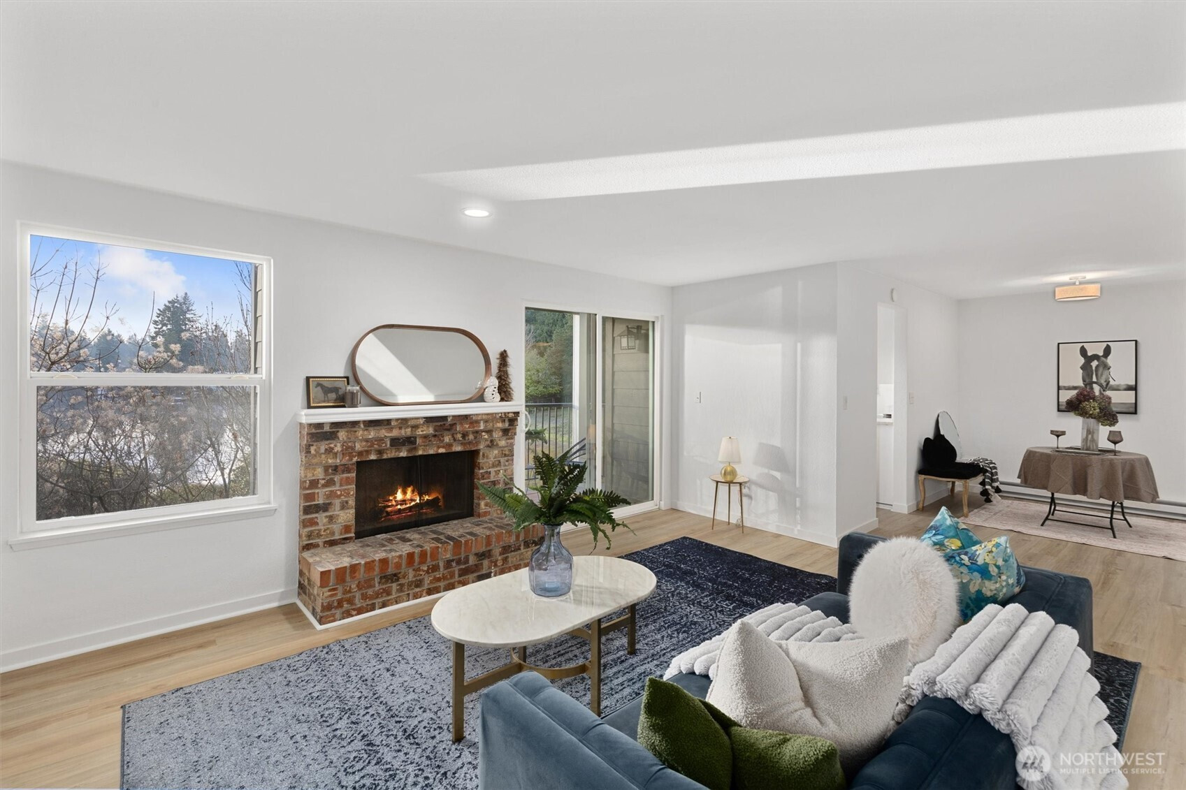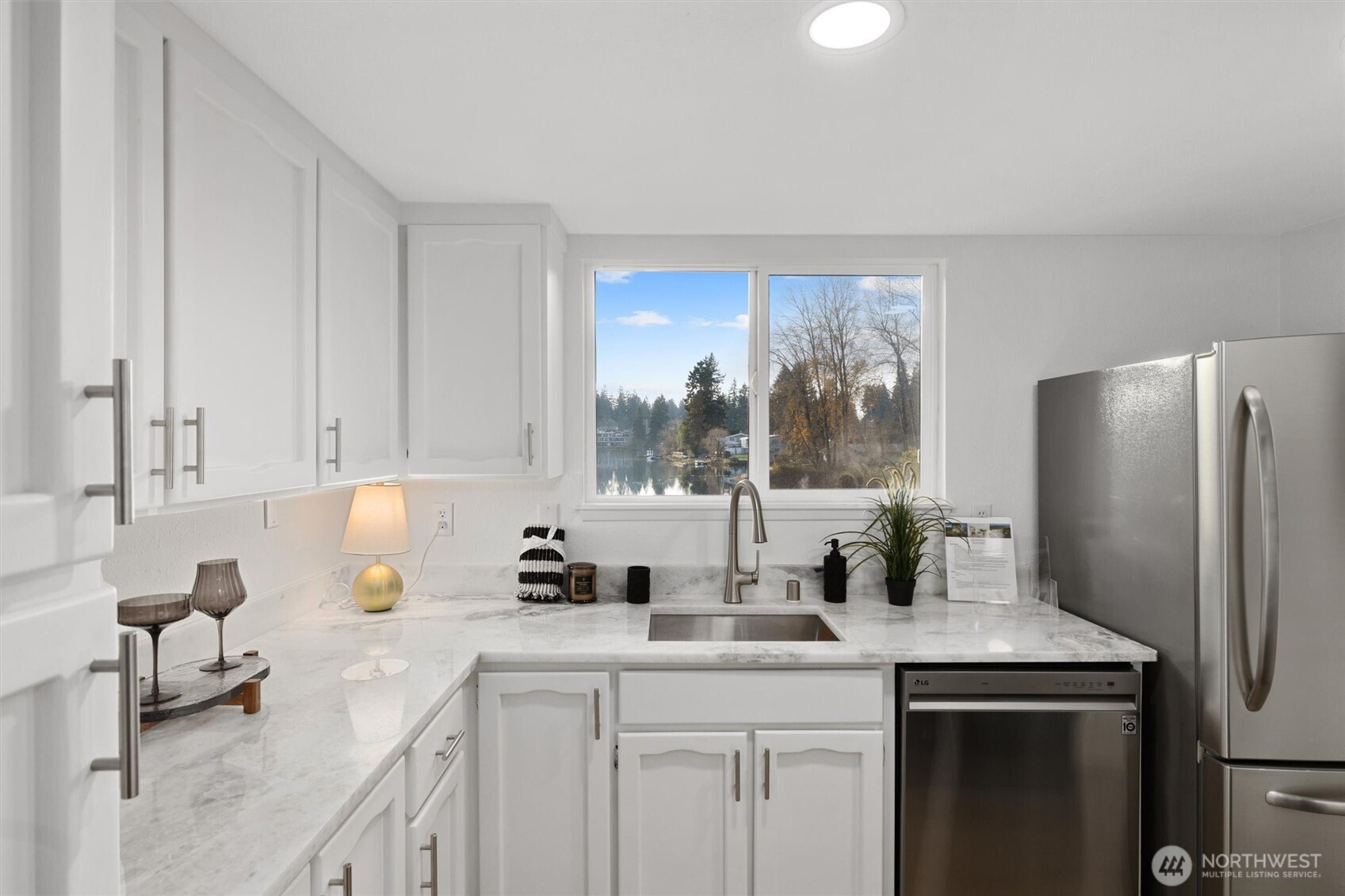 Beautiful Beverly Lake view condo featuring 2 bed and 2 baths. This updated home includes new LVP flooring, fresh interior paint, updated lighting & fireplace in main living area. The kitchen offers Quartzite countertops & modern finishes. A large private deck provides full western exposure and views of Beverly Lake. The primary bedroom includes a walk-in closet and an updated en-suite bath. Additional features include in-unit washer and dryer and one assigned parking space, plus ample guest parking. Community amenities include a pool, hot tub, sauna, tennis courts, clubhouse, and walking trails. HOA dues cover water, sewer, garbage, and common area maintenance. No rental cap. Convenient location close to shopping, Boeing, I-5, and WA-526.