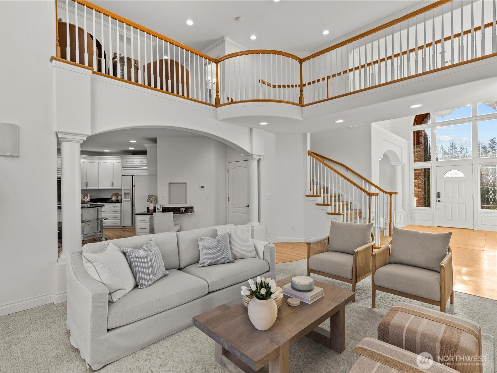 Step inside this elegant and light-filled spacious 3 floor home where timeless design meets everyday comfort. A grand two-story entry welcomes you with rich architectural detail and soaring ceilings that carry into an inviting great room with expansive windows. The light and bright kitchen features crisp white cabinetry, granite countertops and a spacious island that flows seamlessly into the dining and living areas. Ideal for entertaining or a perfect solo retreat, the large deck is framed by a pergola and surrounded by privacy vegetation. The primary ensuite bedroom is conveniently located on the main level and feels like a retreat with soft neutral finishes and direct access to the deck. A private office with custom built-ins completes the main floor. The upper level features a loft space, three spacious bedrooms and one full bathroom. The lower level, ideal for an apartment with its separate entrance, own living space, office, full kitchen, laundry room, bedroom and bathroom. Great for live-in help or additional income opportunity. 2 and 3 car attached garages.