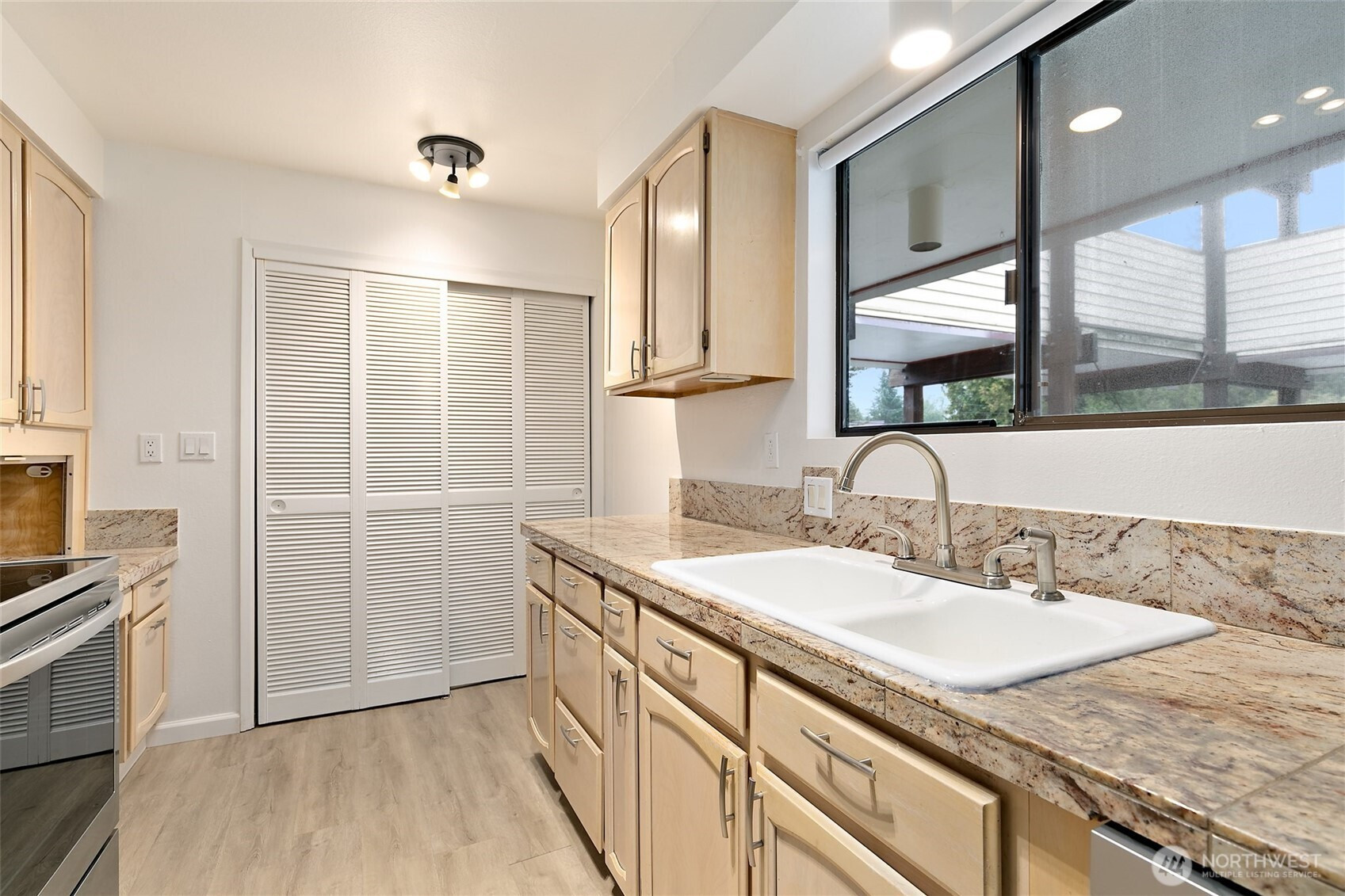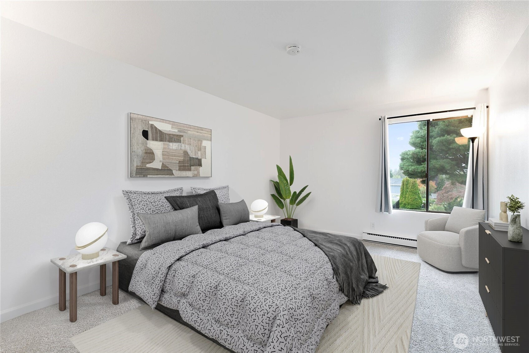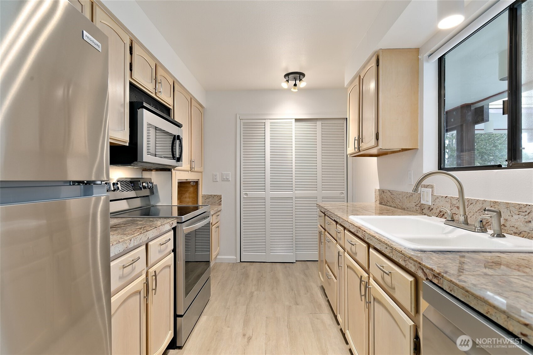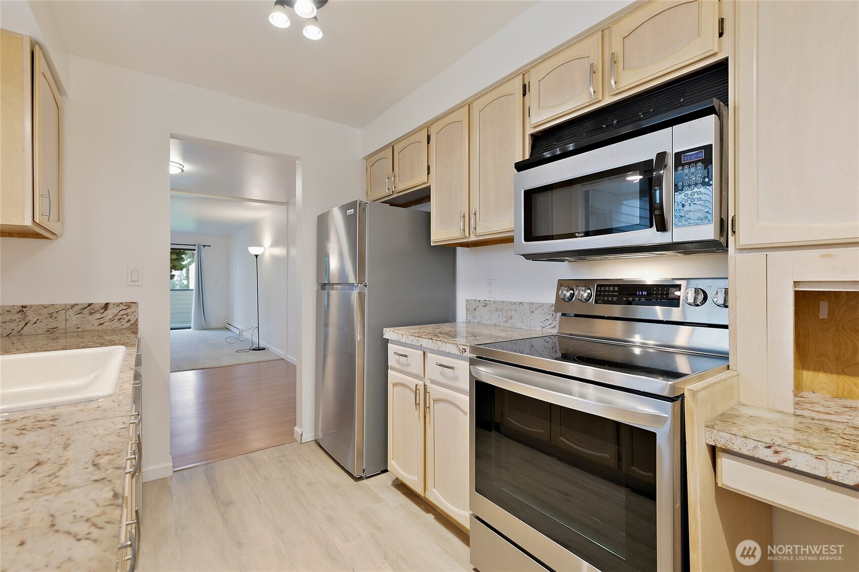 Welcome to this spacious Edmonds condo in a highly desirable community, just moments from the fantastic Edmonds Bowl. Offering 1,089 sq ft with 2 bedrooms and 1.75 baths, this home combines comfort and convenience. Secure entry and elevator access make coming and going easy. Inside, you'll find generous living spaces, including a dining area off the kitchen and a bright living room that opens to a private balcony overlooking the serene courtyard—perfect for enjoying sunsets. The large primary suite features a walk-in closet and stunning super lux ensuite bath. Additional highlights include in-unit laundry, garage parking, storage locker, and access to resort-style amenities such as the pool, sauna, and lush gardens.