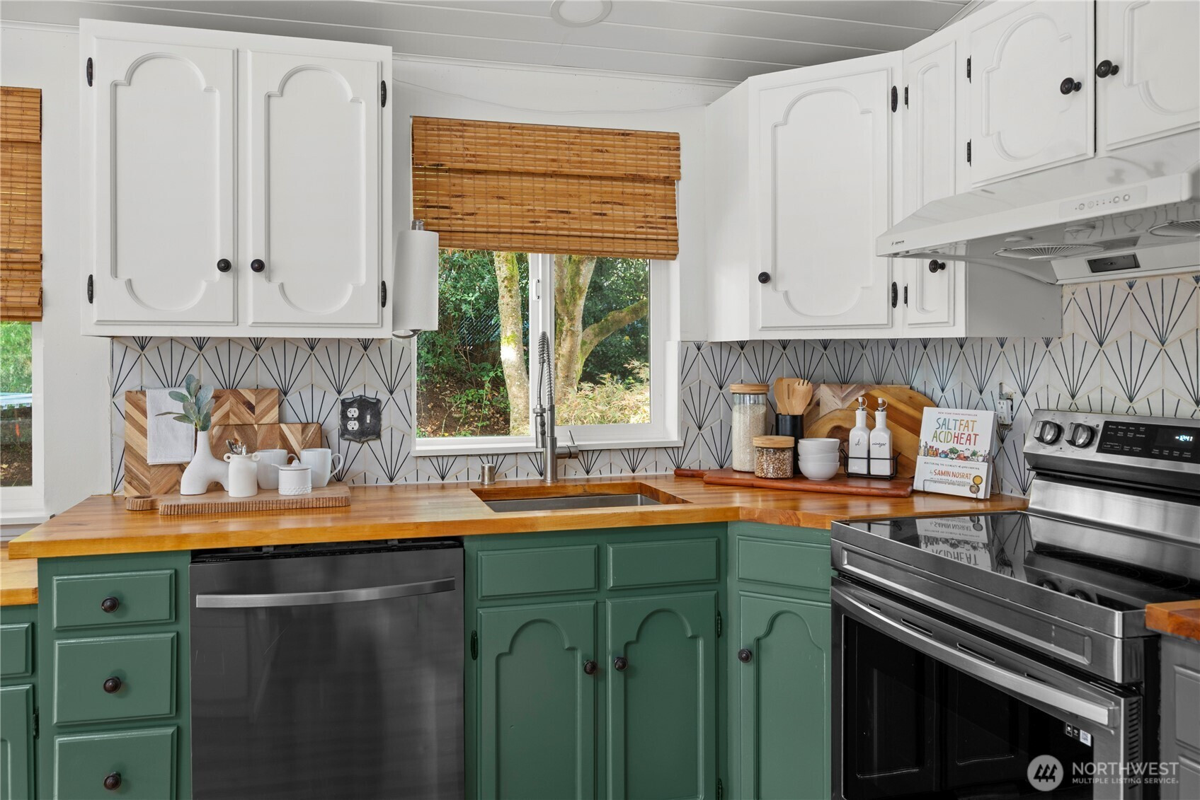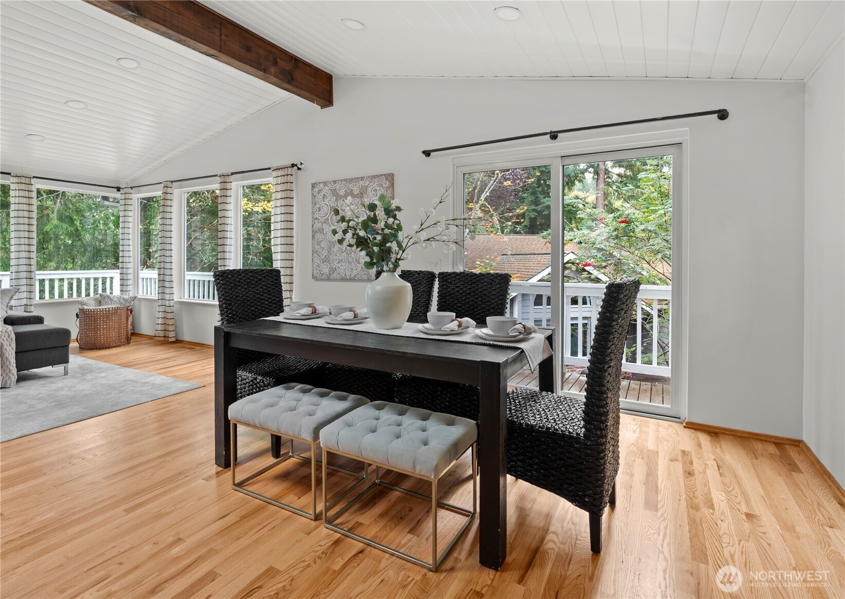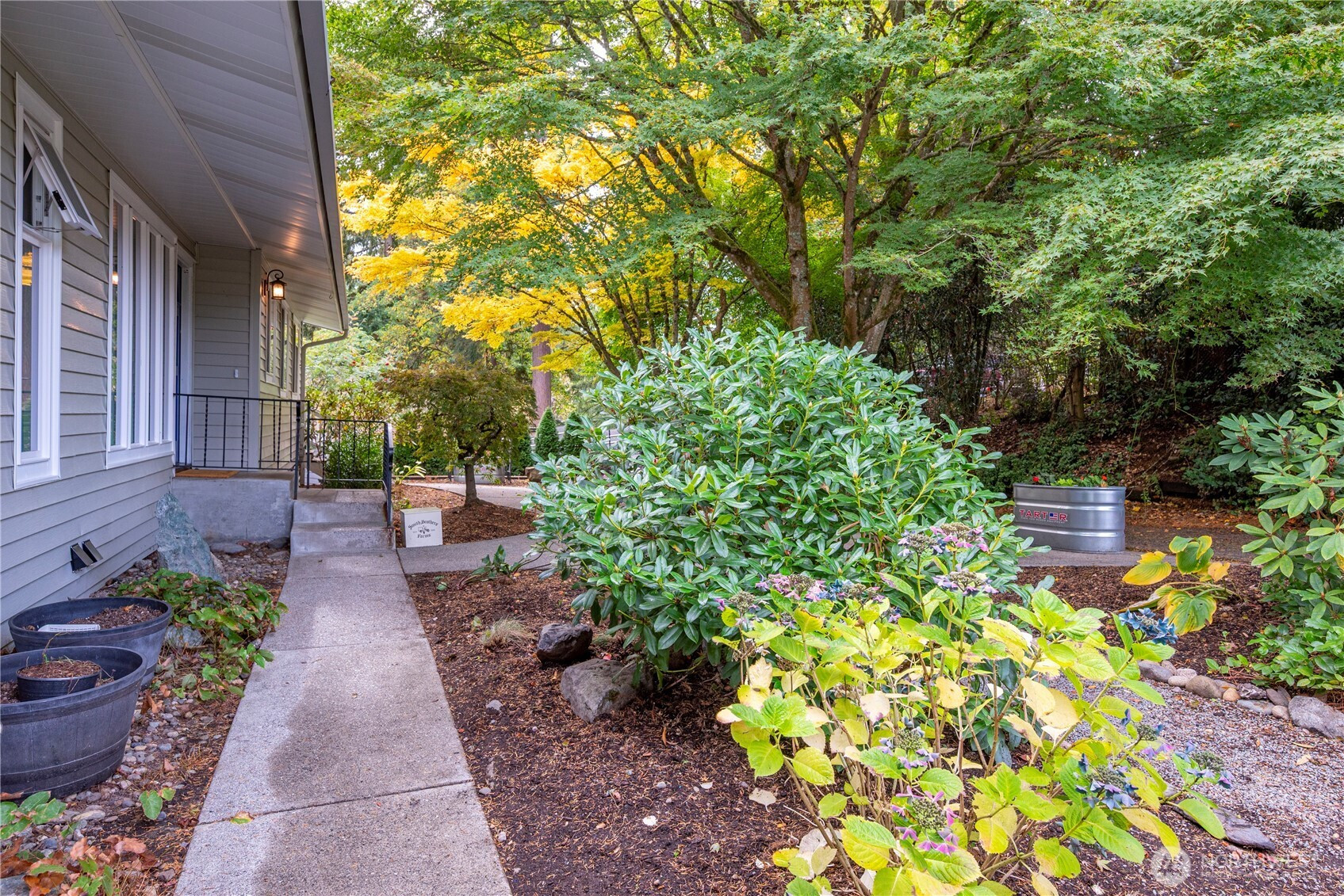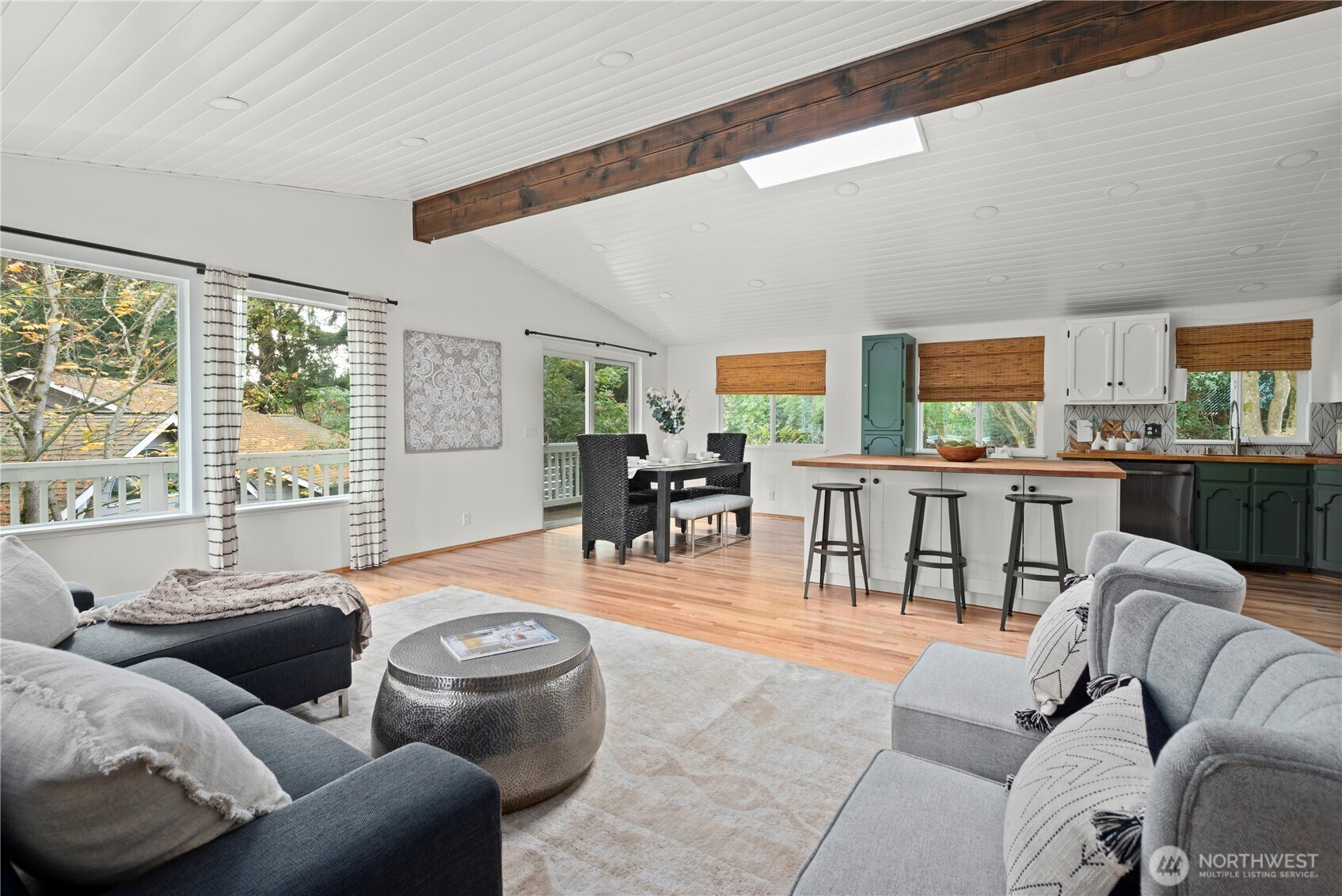 The Edmonds home you've been waiting for! Nestled back away amongst the trees and down a quiet dead end, this daylight rambler offers exceptional privacy. Morning sun pours in from the wall of windows into the great room. Open kitchen, dining and living space all right there, w/ access to the spacious wrap around deck. 3 bedrooms and 2 bathrooms also upstairs. A beautiful and bright lower level with another huge living room, additional 3 bedrooms, bath and laundry. Smart remodel that provides plenty of space for all sort of living options and surrounded by beautiful terraced gardens. Ideal location on the edge of Yost Park, just a few minutes from downtown Edmonds. Large two car garage with spacious driveway parking. Seller Inspected.