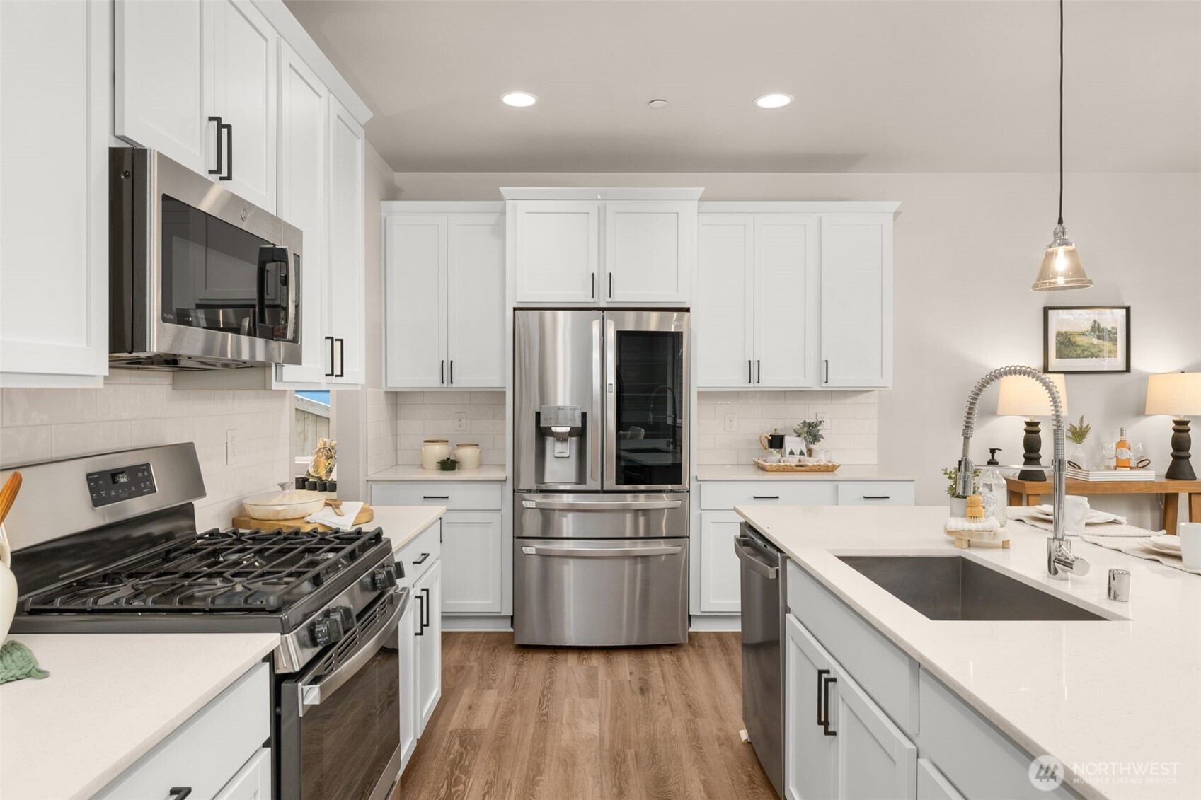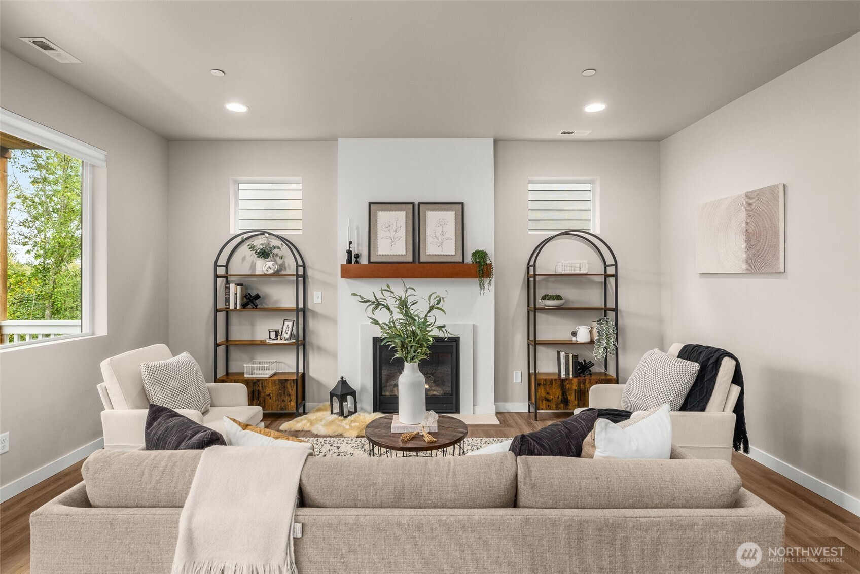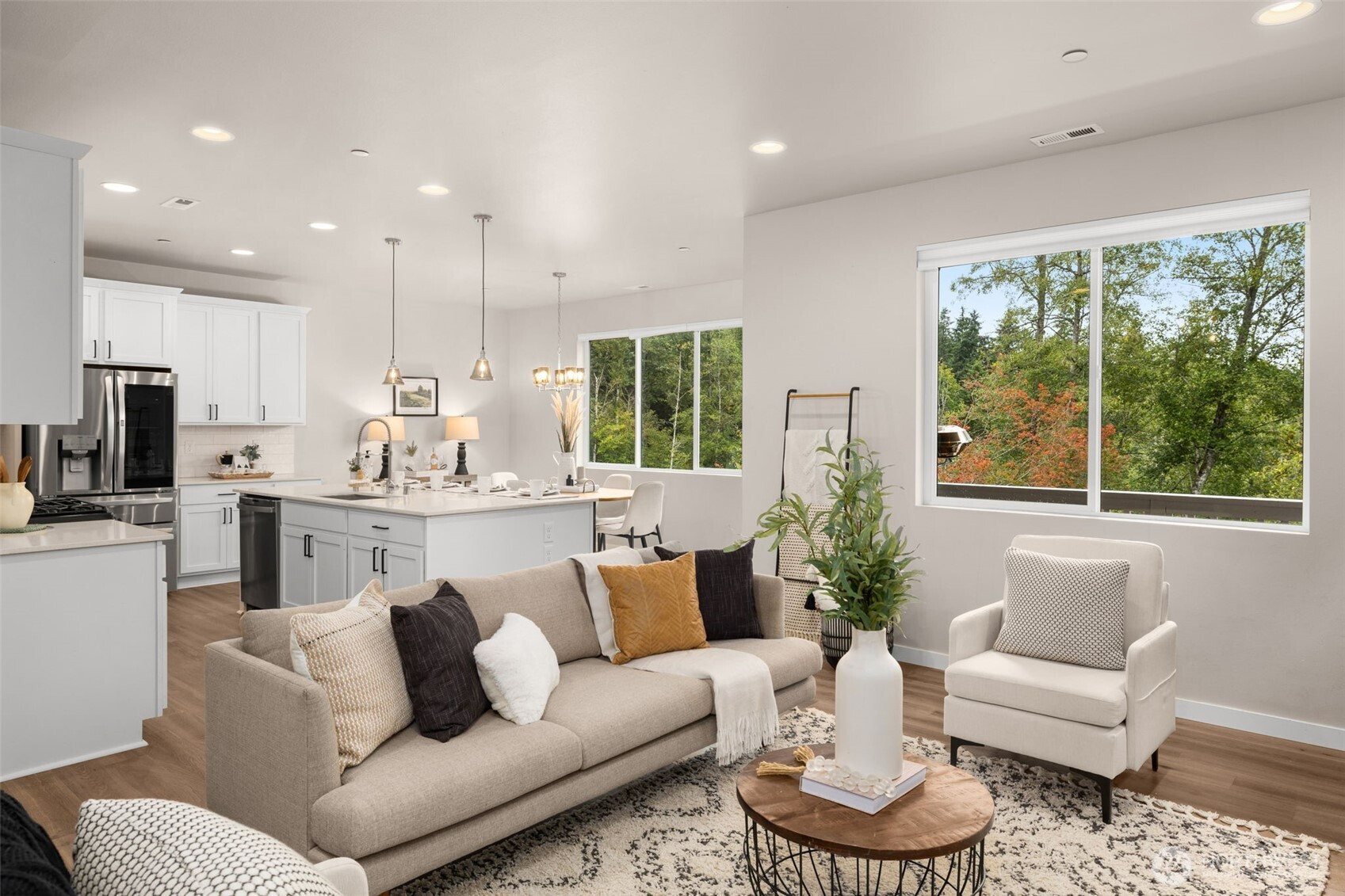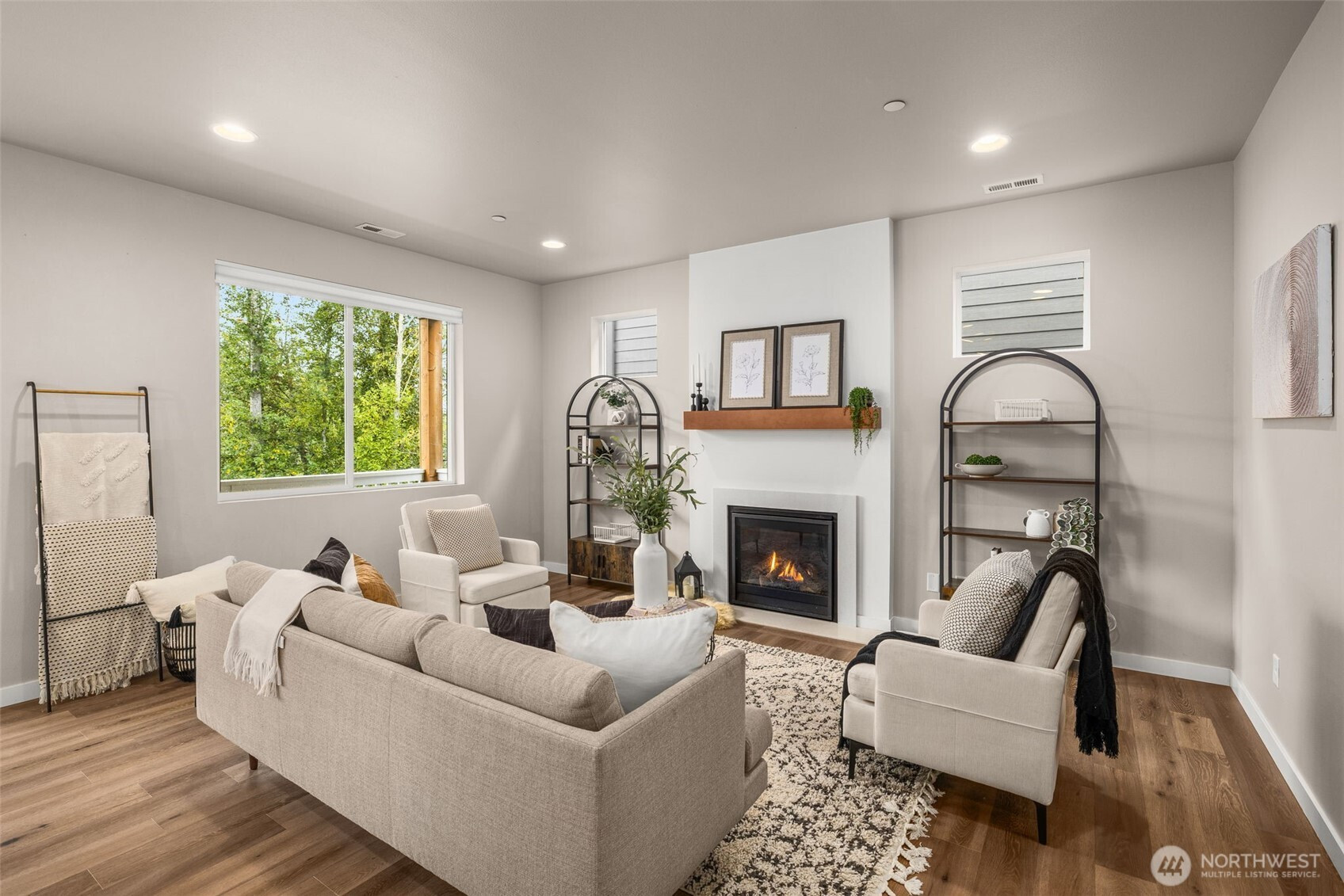 Backing a serene greenbelt in Bella Cresta, this stunning 2 year old, 5BR/3.5BA home blends modern style with light-filled, spacious living & family-friendly design. Open main level features hardwood floors, quartz kitchen with tile backsplash & pantry, dining area, and cozy gas fireplace. Finished basement w/ living area, full bath & walk-in closet is perfect for guests, movie nights, or a home office. Loft, rec room & pocket office offer flexible space. Spa-style primary bath w/ dual showerheads & soaking tub. Covered patio & deck overlook fully fenced yard. Community park, sport court, picnic area & walking paths. Heat pump ensures year-round comfort. Quick access to Hwy 9 & I-5. Style, space & lifestyle just waiting for it's new owner!