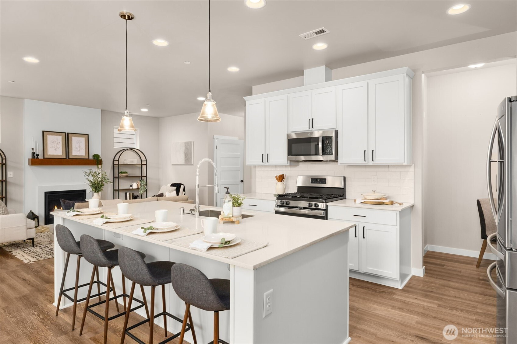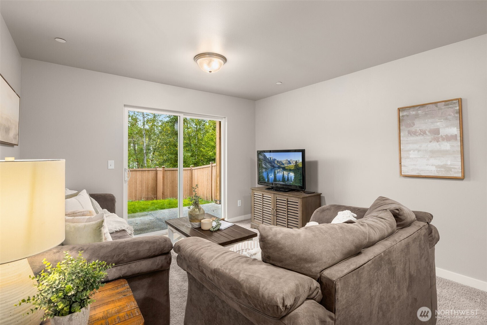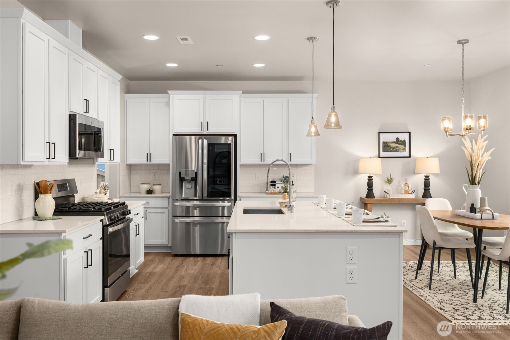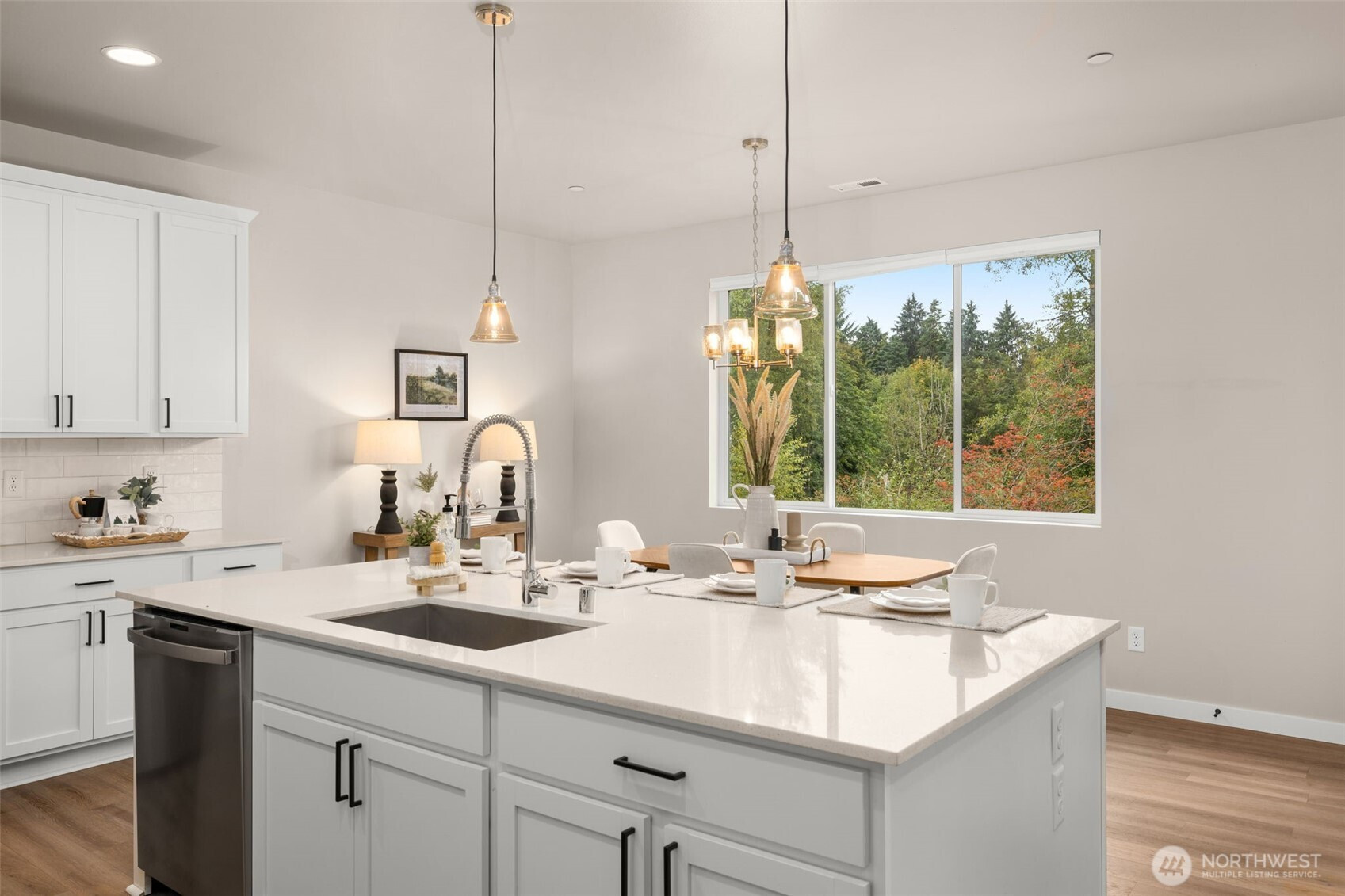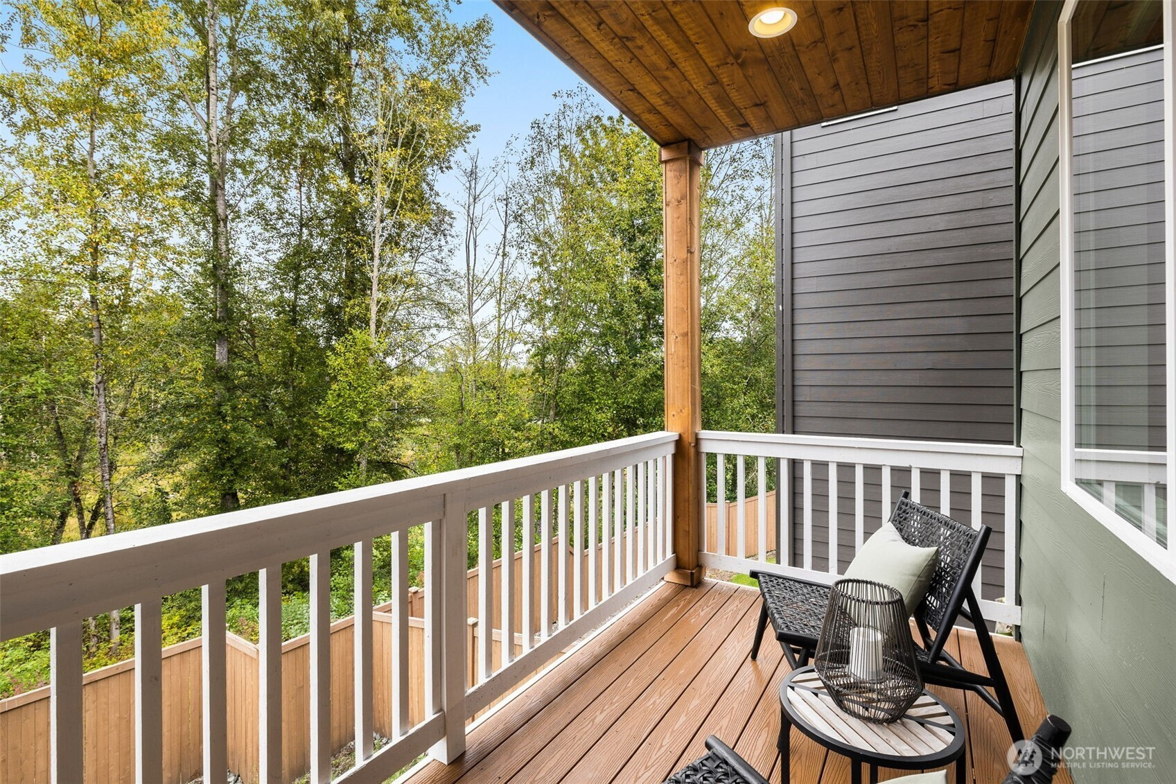 Backing a serene greenbelt in Bella Cresta, this stunning 2 year old, 5BR/3.5BA home blends modern style with light-filled, spacious living & family-friendly design. Open main level features hardwood floors, quartz kitchen with tile backsplash & pantry, dining area, and cozy gas fireplace. Finished basement w/ living area, full bath & walk-in closet is perfect for guests, movie nights, or a home office. Loft, rec room & pocket office offer flexible space. Spa-style primary bath w/ dual showerheads & soaking tub. Covered patio & deck overlook fully fenced yard. Community park, sport court, picnic area & walking paths. Heat pump ensures year-round comfort. Quick access to Hwy 9 & I-5. Style, space & lifestyle just waiting for it's new owner!
