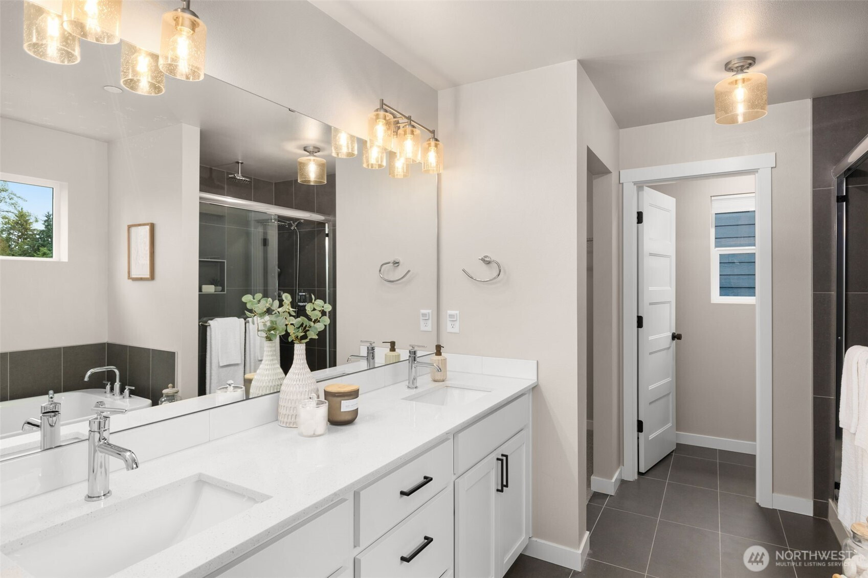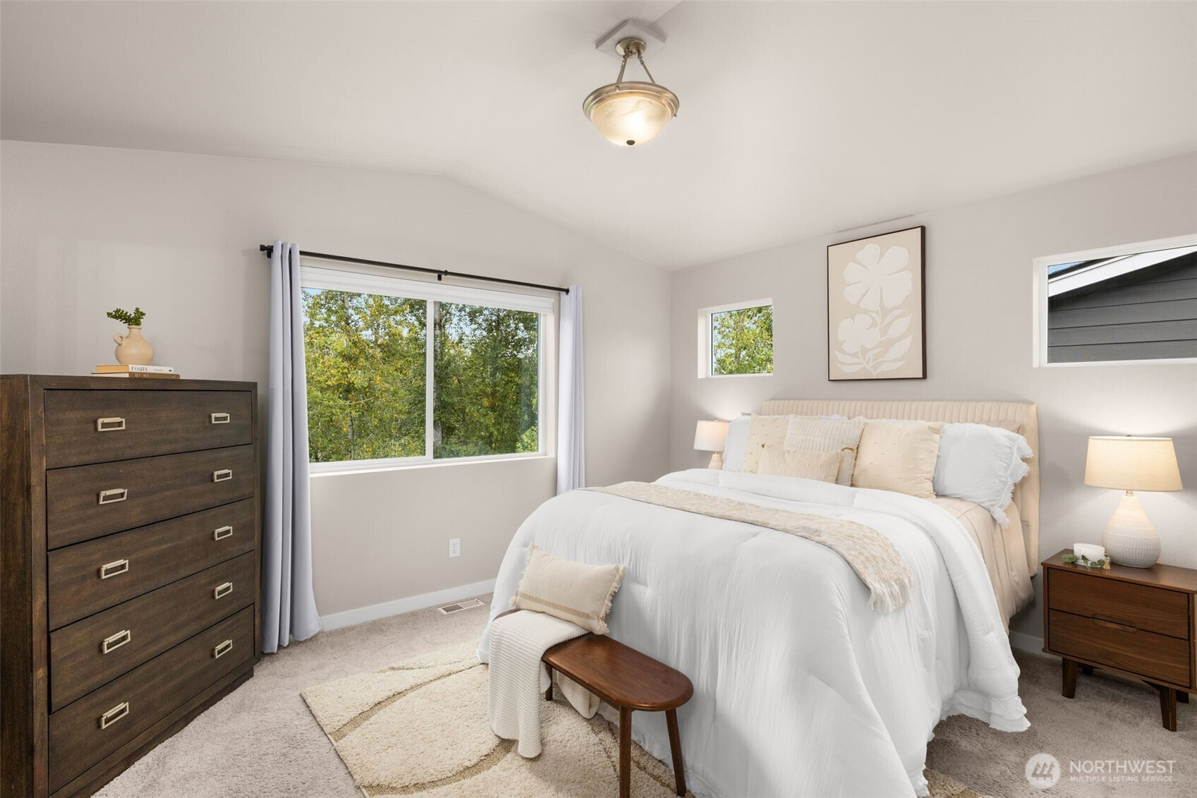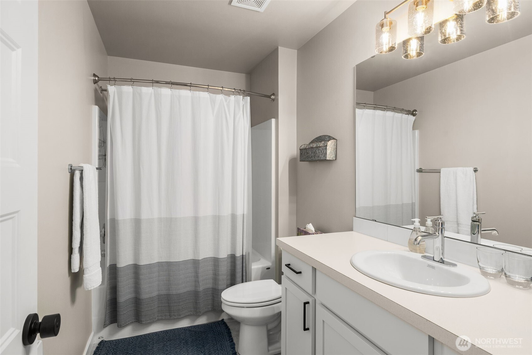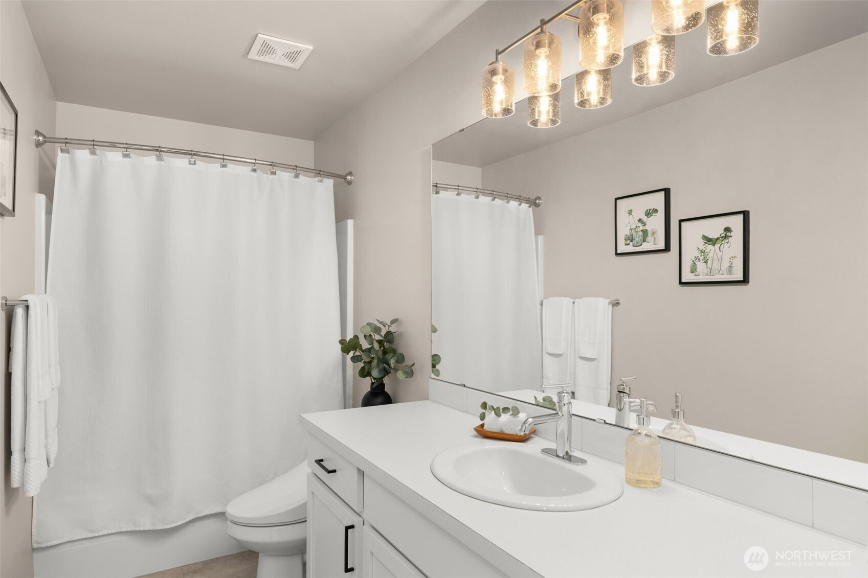 Backing a serene greenbelt in Bella Cresta, this stunning 2 year old, 5BR/3.5BA home blends modern style with light-filled, spacious living & family-friendly design. Open main level features hardwood floors, quartz kitchen with tile backsplash & pantry, dining area, and cozy gas fireplace. Finished basement w/ living area, full bath & walk-in closet is perfect for guests, movie nights, or a home office. Loft, rec room & pocket office offer flexible space. Spa-style primary bath w/ dual showerheads & soaking tub. Covered patio & deck overlook fully fenced yard. Community park, sport court, picnic area & walking paths. Heat pump ensures year-round comfort. Quick access to Hwy 9 & I-5. Style, space & lifestyle just waiting for it's new owner!
