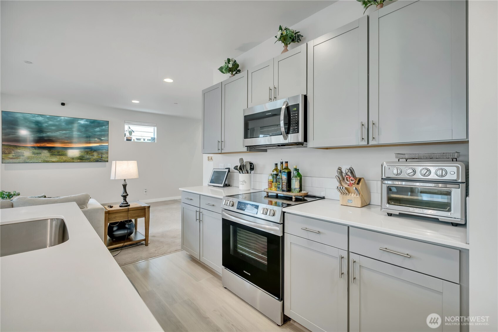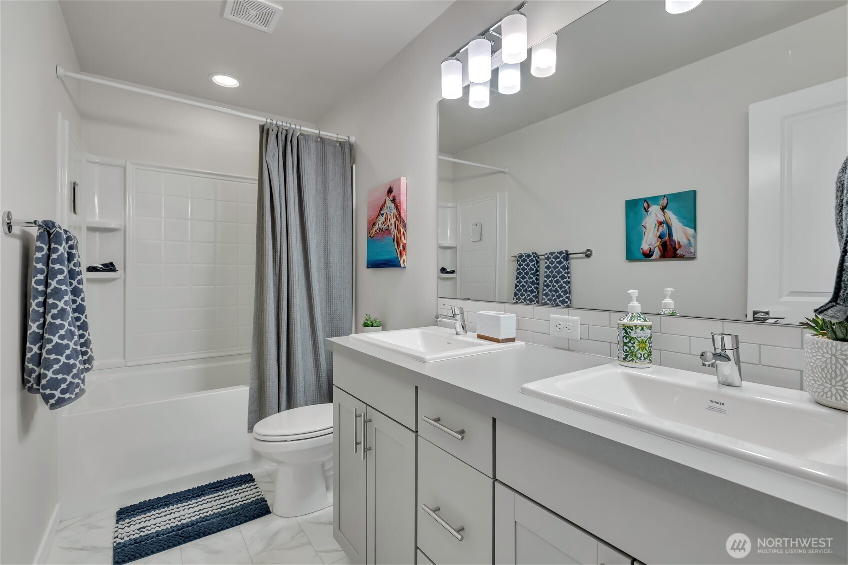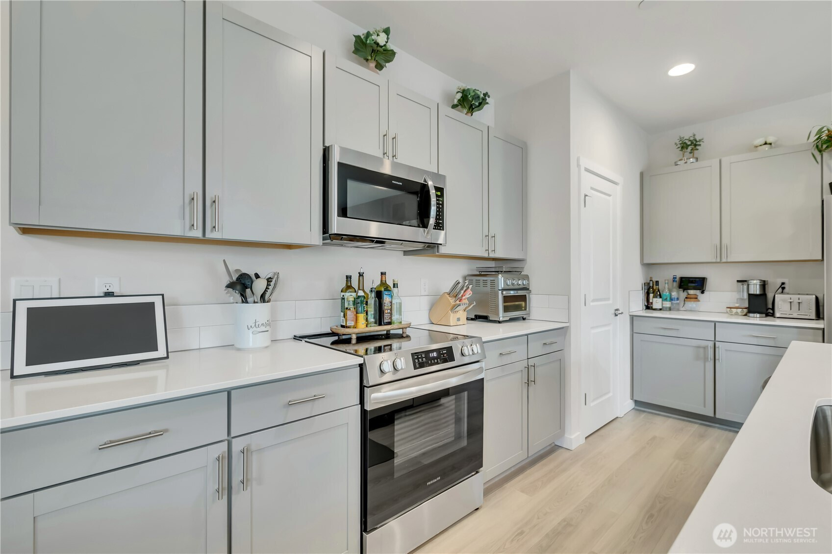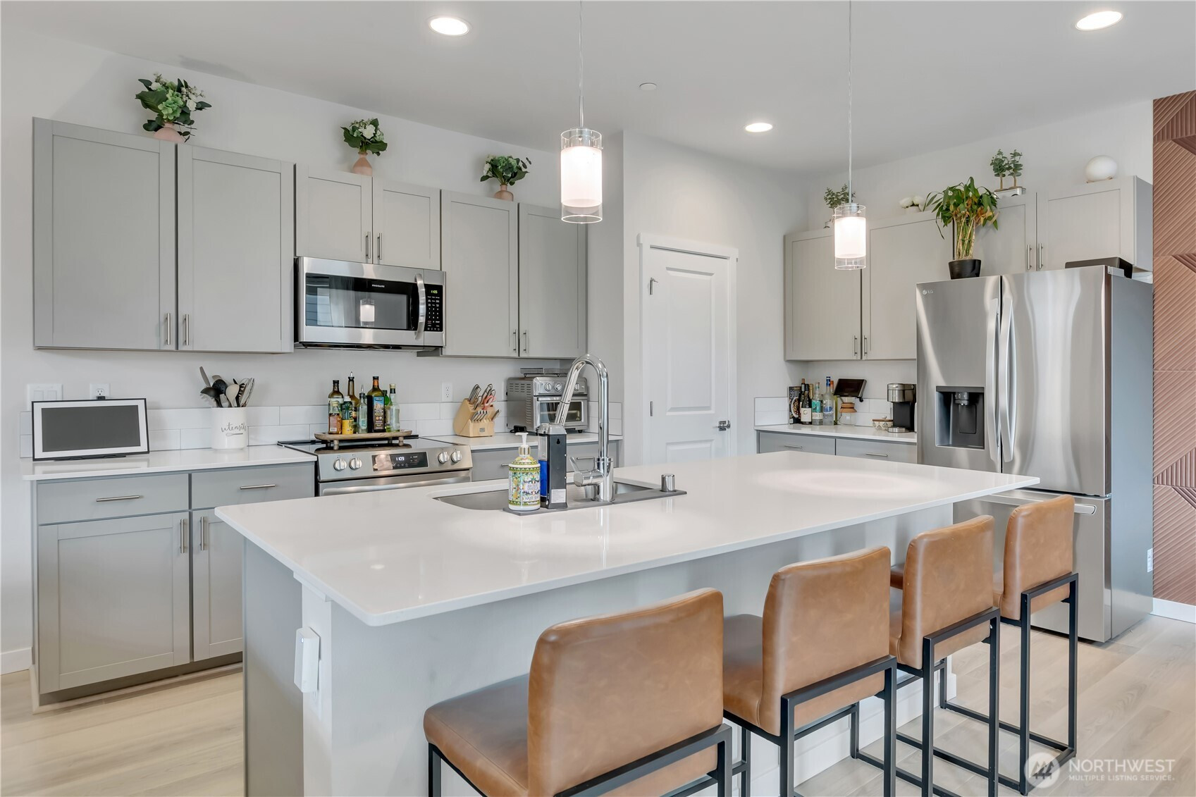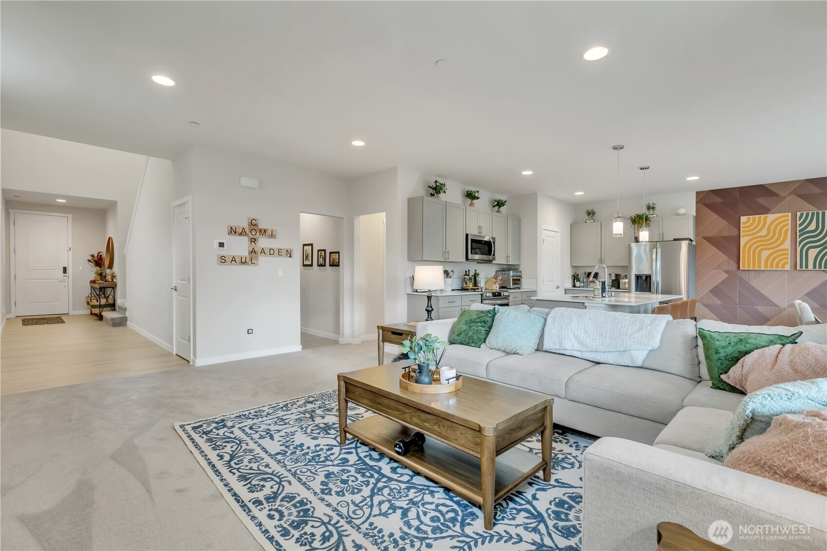 BEAUTIFUL & spacious FIVE bedroom Marysville home just like new! This 2 year old home has a fantastic layout, including soaring ceilings in the long, wide foyer as you enter, a main floor bedroom with a 3/4 bath ~ perfect for a home office OR guest suite! Open concept great room with 9'ceilings, kitchen has stainless steel appliances, a large island w/quartz countertops, eating bar & dining area with wood accent wall with lighting. Lots of counter space & a big pantry! Upstairs is a large bonus room, an office/desk nook, a huge primary bedroom & bath with double sinks, a soaking tub, walk-in shower, & pass-through walk-in closet that's also connected to the laundry room! 3 more nicely sized bedrooms, plus another full bath, this 2600 SF home plan was thoughtfully designed. Covered front & back patios for year-round use, backyard is fully fenced & looks out to the community park with walking trails.