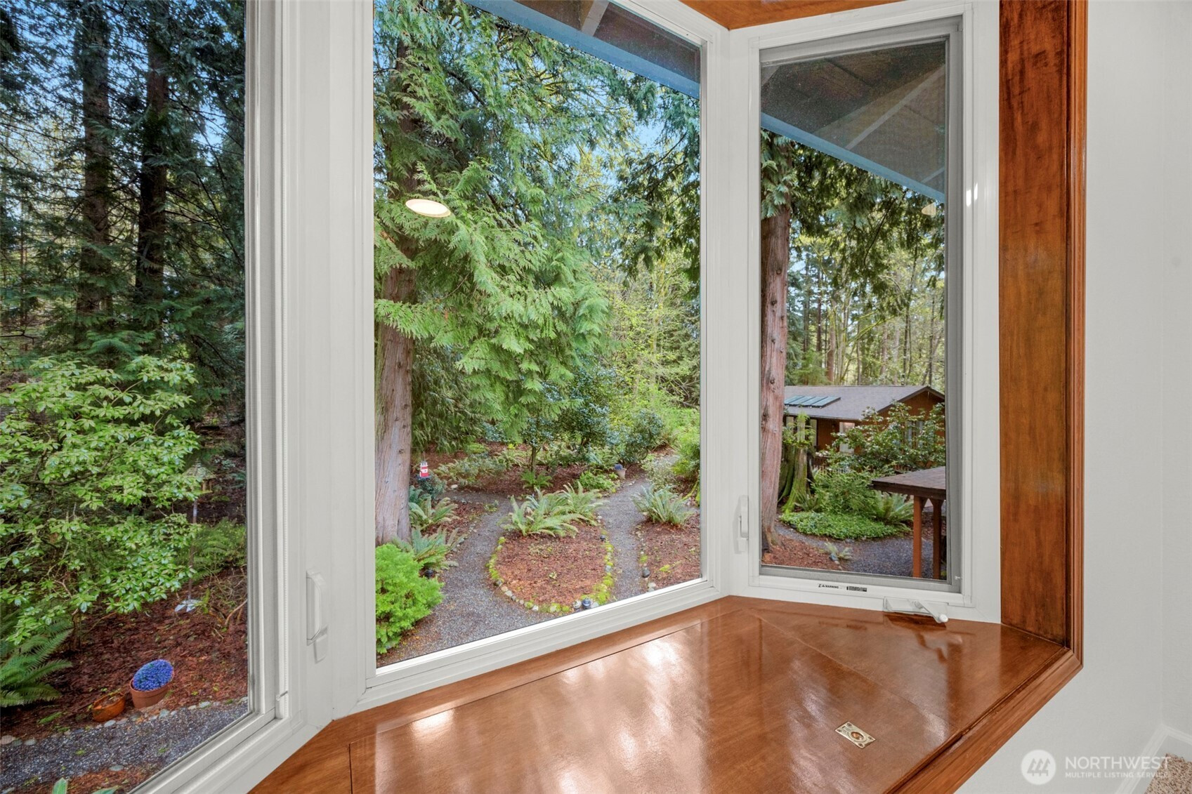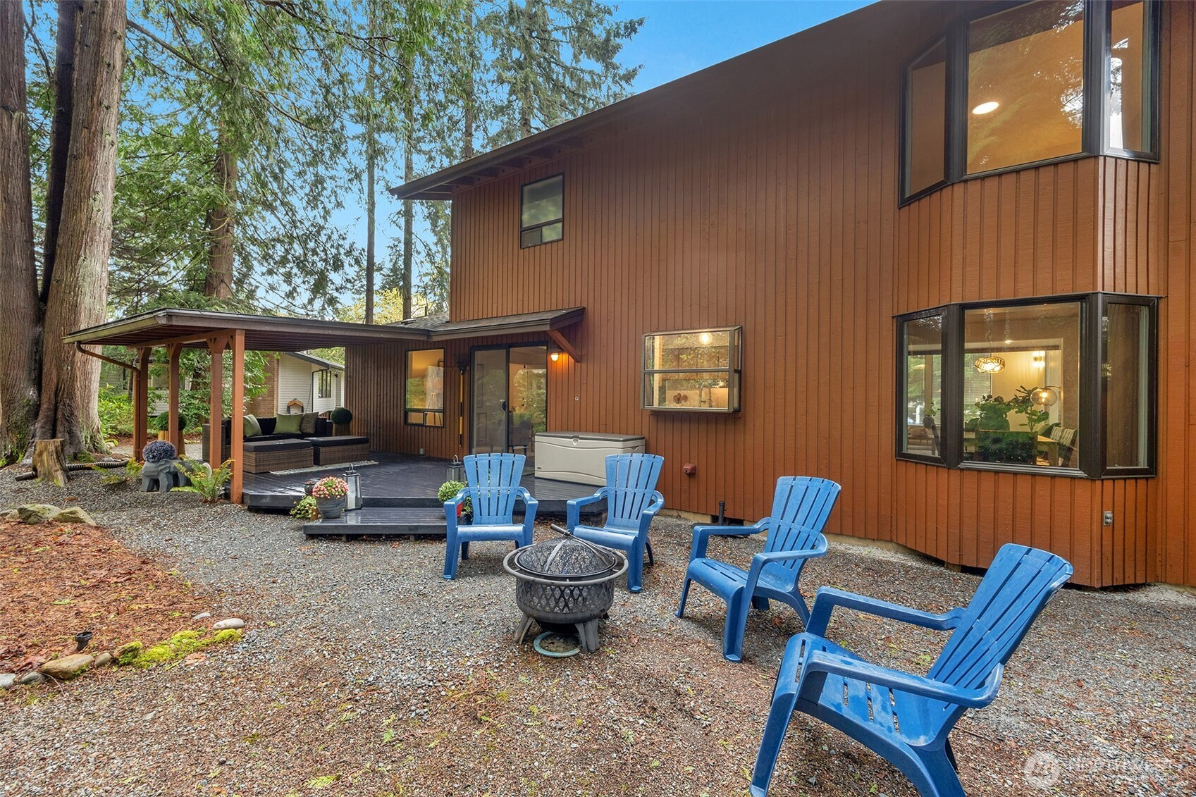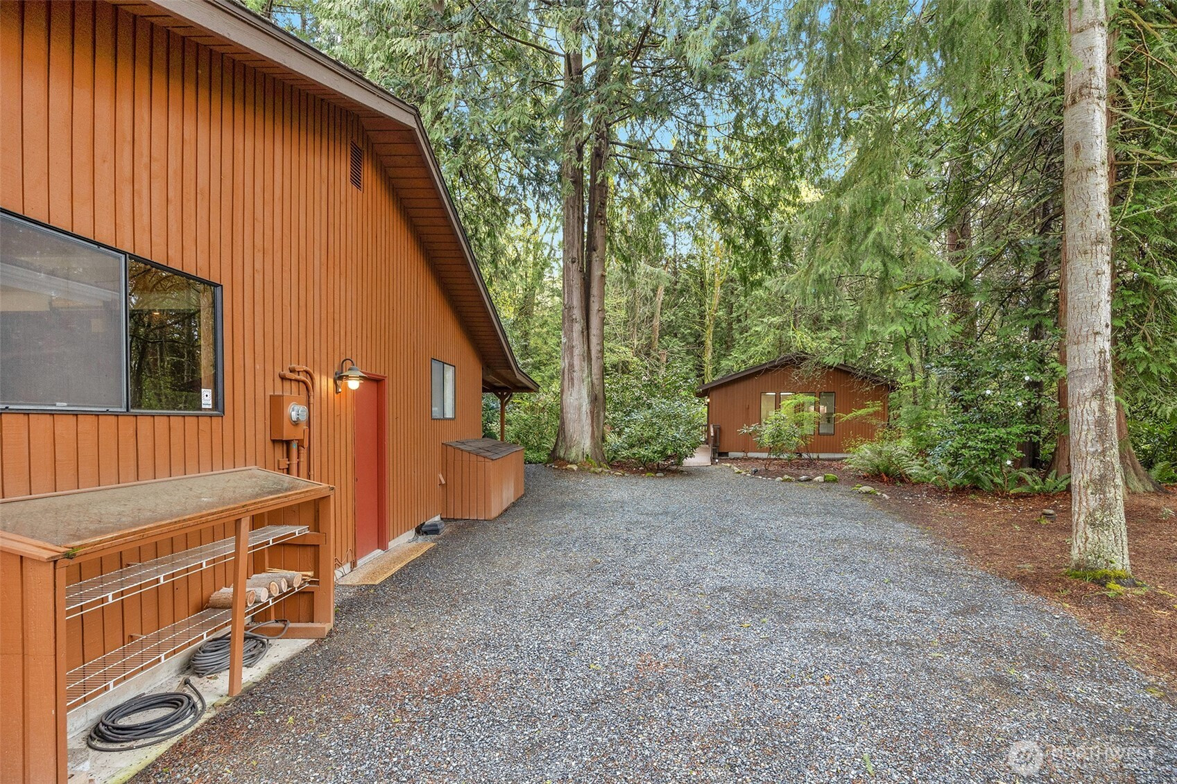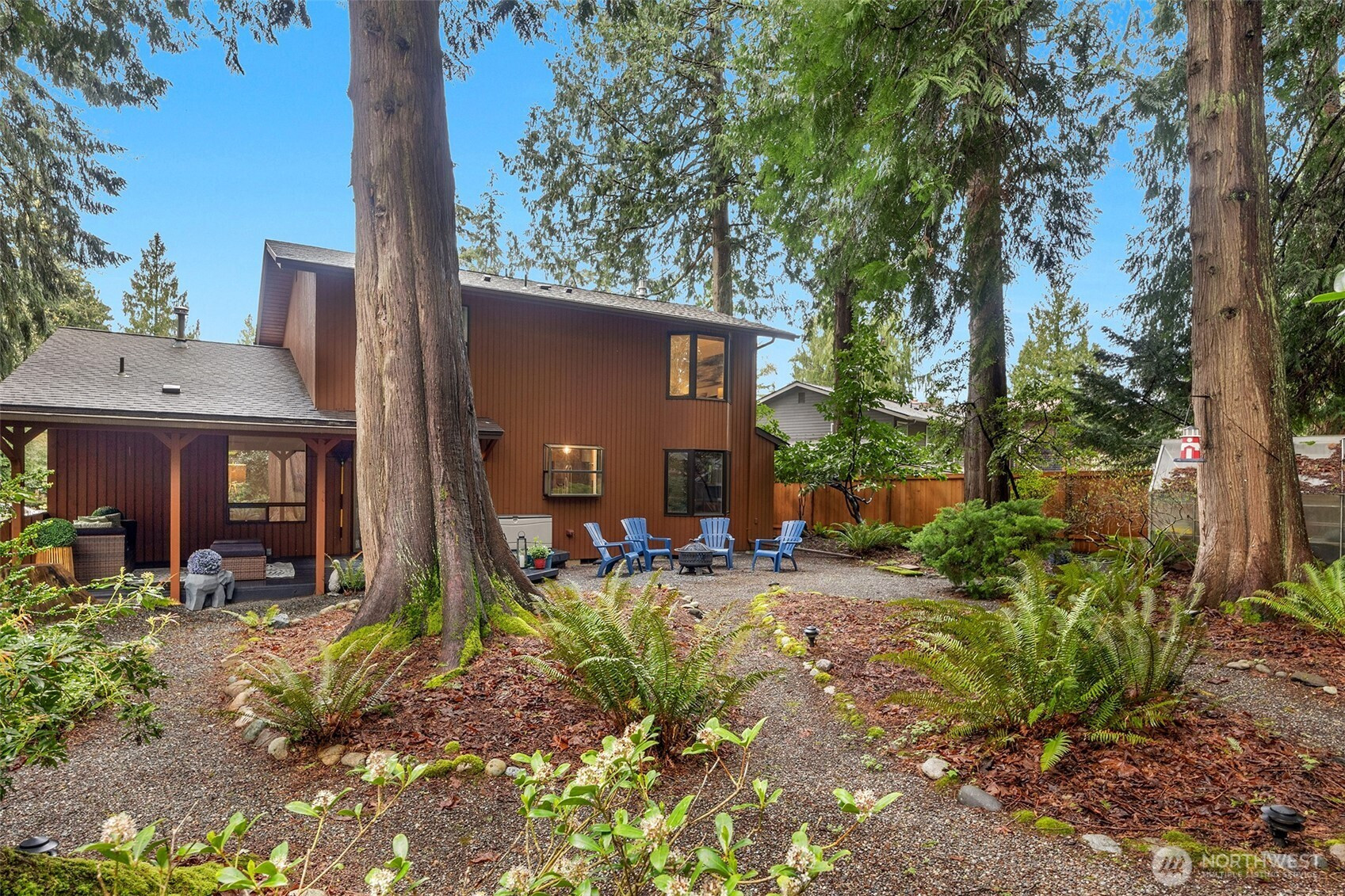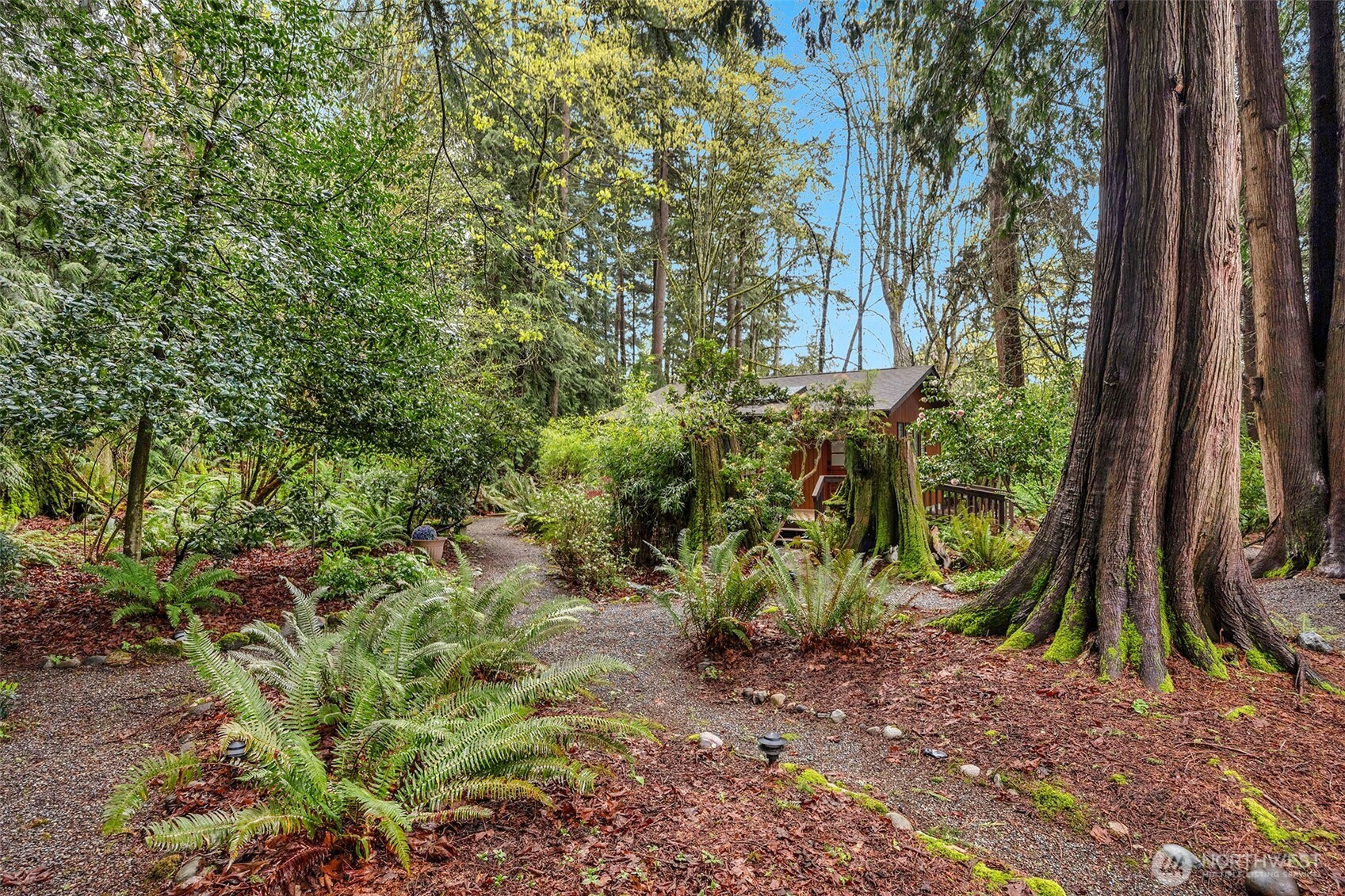 Experience the ultimate Pacific Northwest sanctuary in this stunning Mid-Century Modern masterpiece, perfectly nestled within a private, old-growth forest. The main residence captures the essence of "treehouse living" with soaring vaulted ceilings, exposed architectural beams, and floor-to-ceiling "aquarium" windows that invite the tranquil beauty of the forest into every room. At the heart of the home, a chef-inspired kitchen shines with crisp quartz countertops, high-end stainless appliances, and warm oak cabinetry, flowing seamlessly into an expansive open-concept dining and living area.The crown jewel of this estate is the detached, 500+ square foot studio. Thoughtfully designed with a modern wet bar, half bathroom, skylights, and convenient ramp access, this versatile space is a premier destination for a high-end home gym, creative art gallery, or private guest retreat. Outside, the enchanting grounds are a nature lover’s dream, featuring a seasonal creek with a private wooden bridge, meandering garden trails, and a peaceful fire pit area designed for starlit entertaining.Practical elegance meets timeless character with a light-filled primary suite, updated bathrooms, and a dedicated laundry/mudroom. Located in the heart of Mukilteo, this estate offers rare seclusion without sacrificing convenience. Every detail from the vibrant camellias and lush ferns to the towering cedar canopy, has been curated to offer an unparalleled lifestyle of privacy, peace, and luxury.