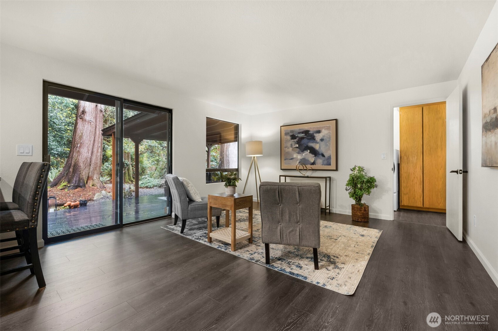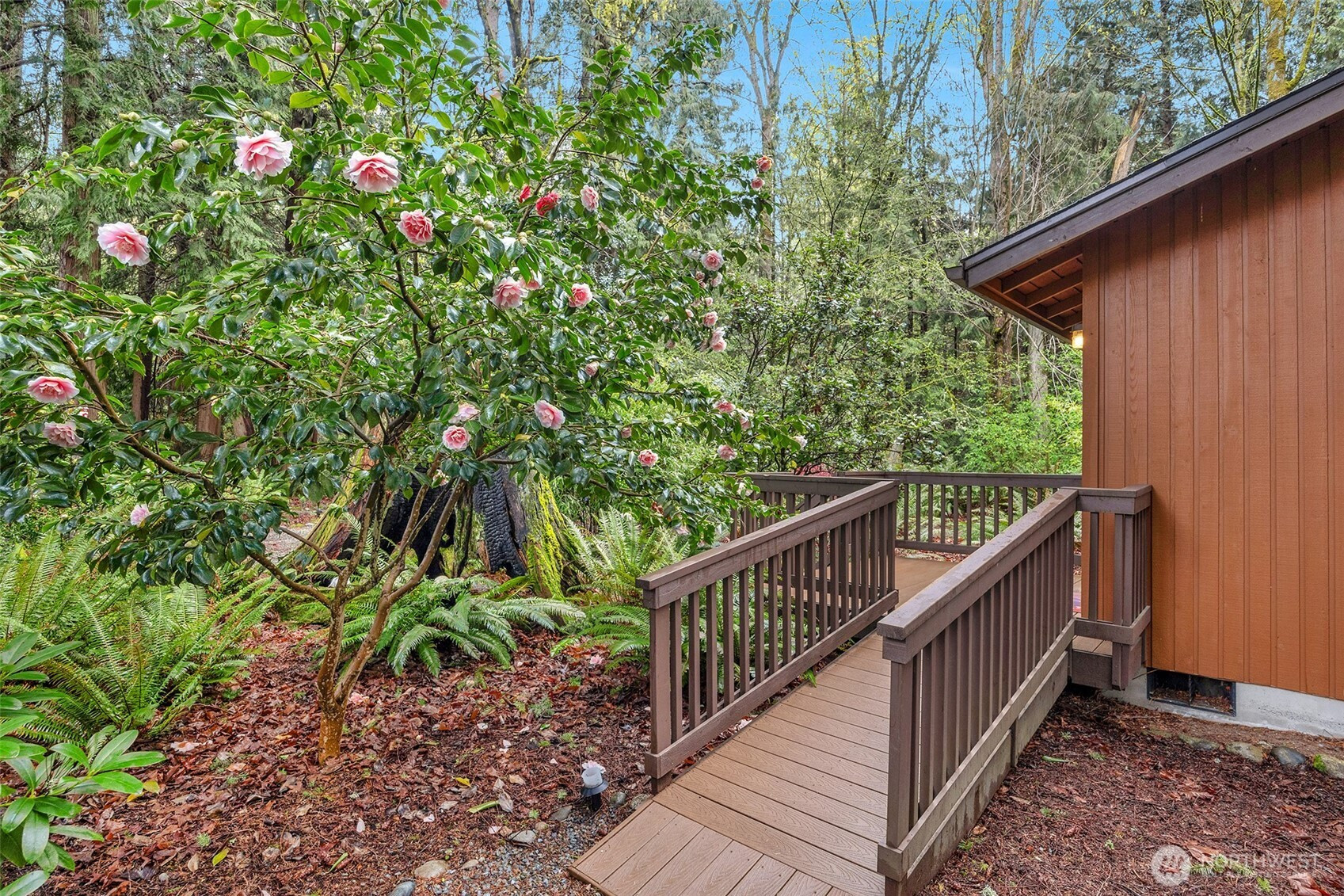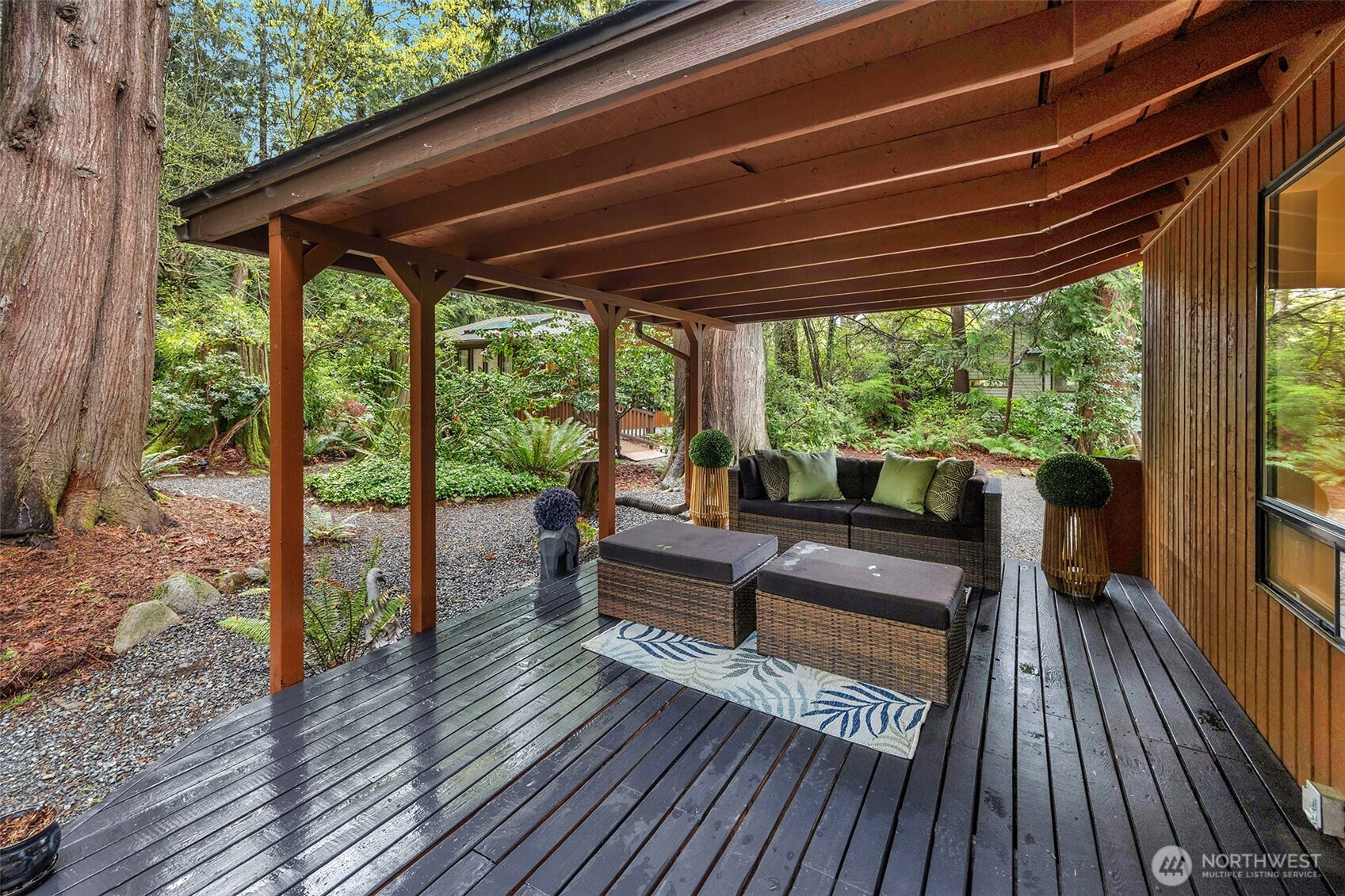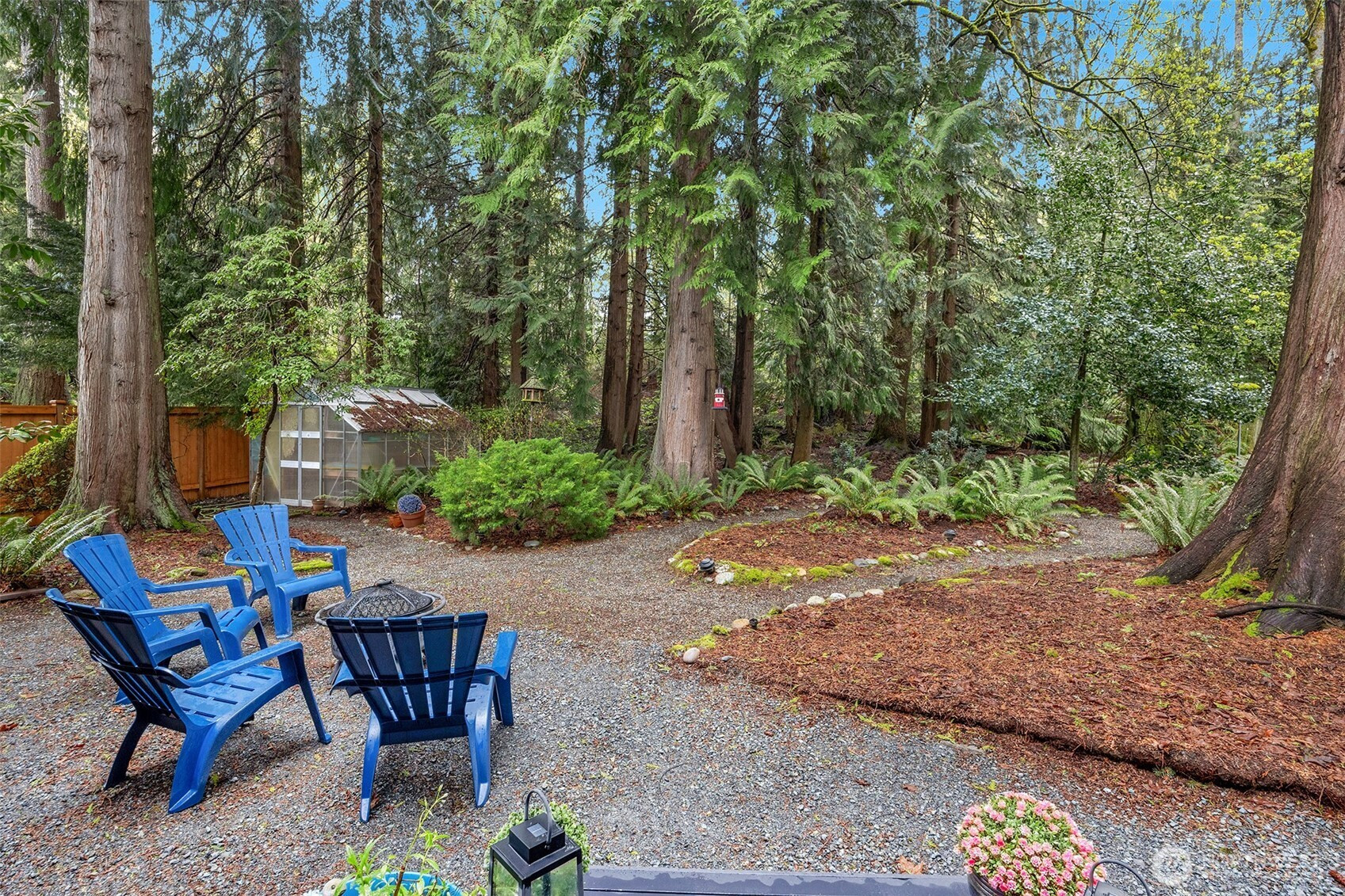 Experience the ultimate Pacific Northwest sanctuary in this stunning Mid-Century Modern masterpiece, perfectly nestled within a private, old-growth forest. The main residence captures the essence of "treehouse living" with soaring vaulted ceilings, exposed architectural beams, and floor-to-ceiling "aquarium" windows that invite the tranquil beauty of the forest into every room. At the heart of the home, a chef-inspired kitchen shines with crisp quartz countertops, high-end stainless appliances, and warm oak cabinetry, flowing seamlessly into an expansive open-concept dining and living area.The crown jewel of this estate is the detached, 500+ square foot studio. Thoughtfully designed with a modern wet bar, half bathroom, skylights, and convenient ramp access, this versatile space is a premier destination for a high-end home gym, creative art gallery, or private guest retreat. Outside, the enchanting grounds are a nature lover’s dream, featuring a seasonal creek with a private wooden bridge, meandering garden trails, and a peaceful fire pit area designed for starlit entertaining.Practical elegance meets timeless character with a light-filled primary suite, updated bathrooms, and a dedicated laundry/mudroom. Located in the heart of Mukilteo, this estate offers rare seclusion without sacrificing convenience. Every detail from the vibrant camellias and lush ferns to the towering cedar canopy, has been curated to offer an unparalleled lifestyle of privacy, peace, and luxury.