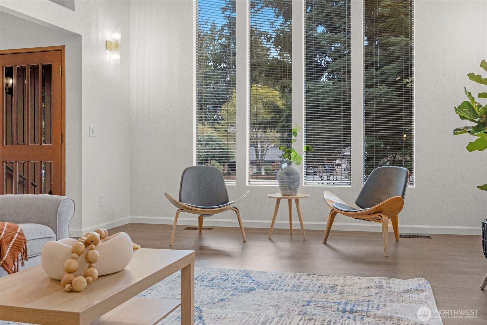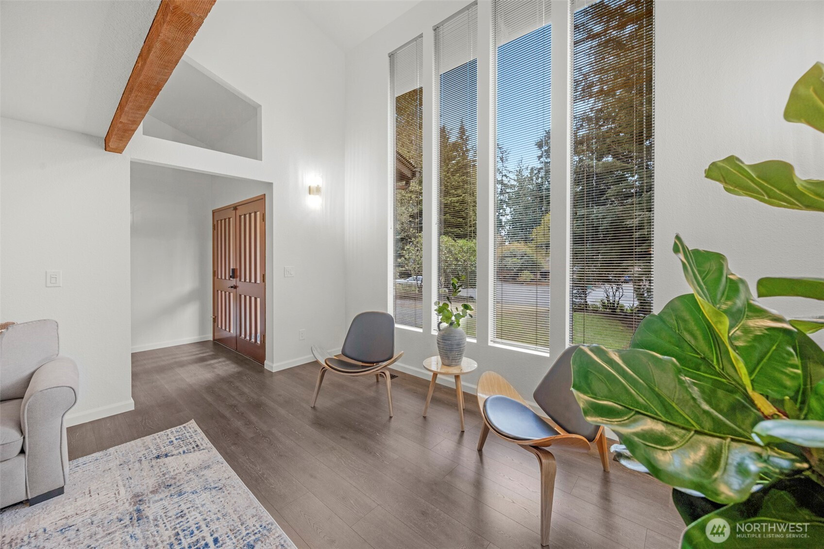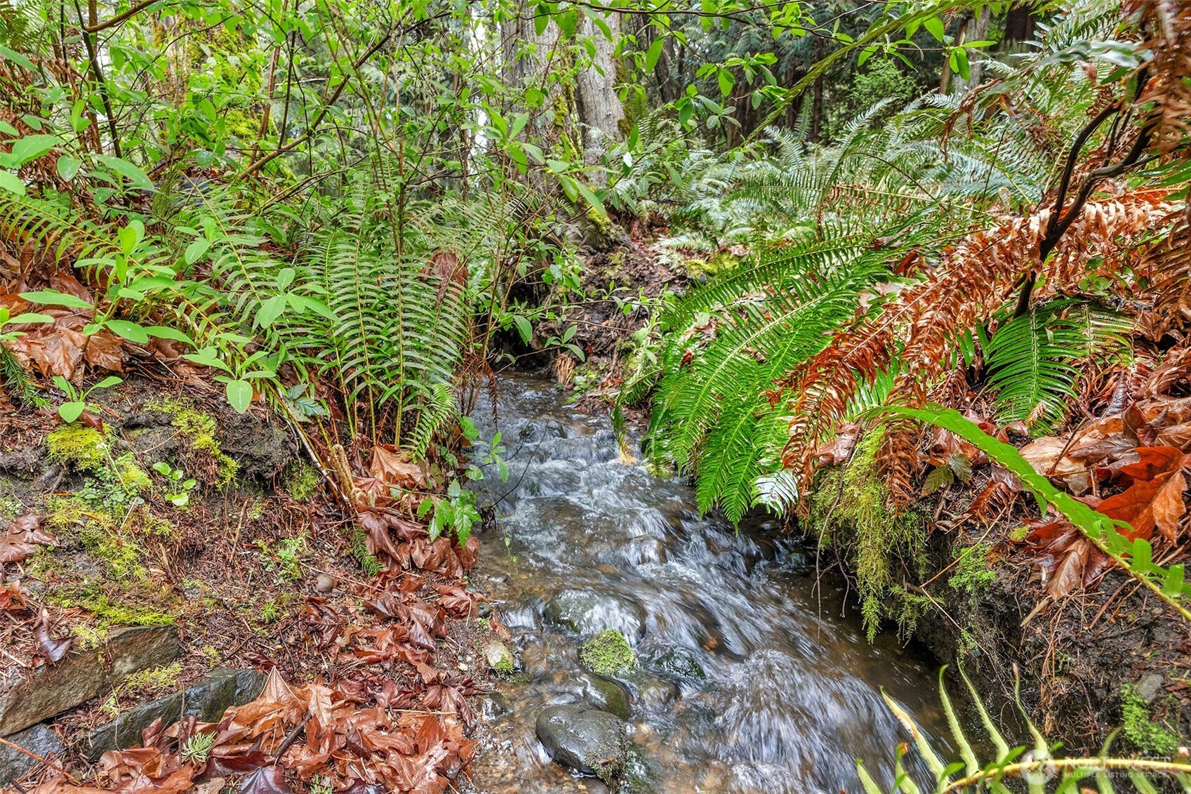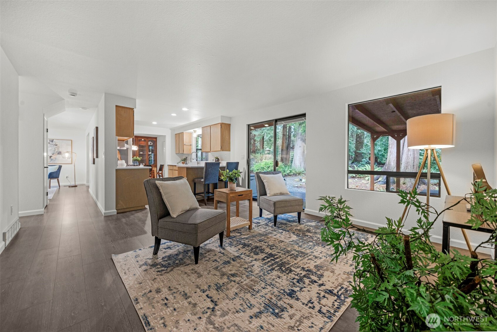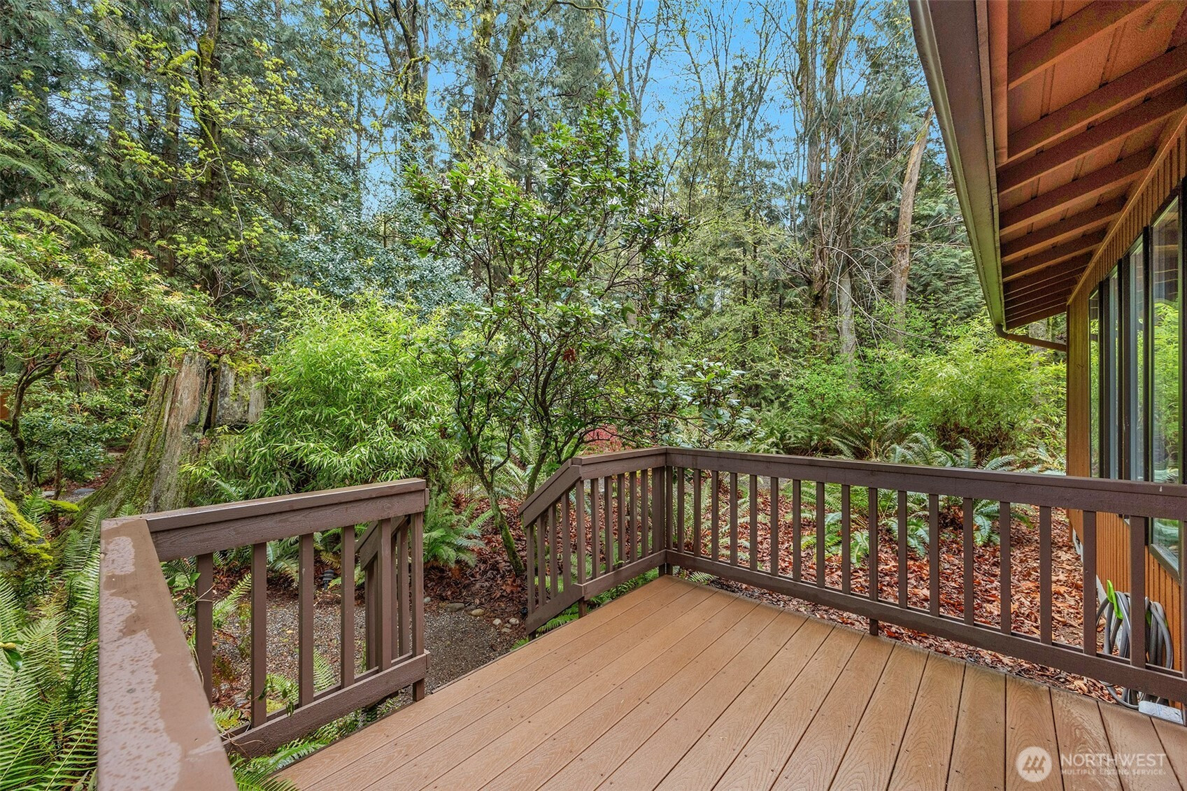Experience the ultimate Pacific Northwest sanctuary in this stunning Mid-Century Modern masterpiece, perfectly nestled within a private, old-growth forest. The main residence captures the essence of "treehouse living" with soaring vaulted ceilings, exposed architectural beams, and floor-to-ceiling "aquarium" windows that invite the tranquil beauty of the forest into every room. At the heart of the home, a chef-inspired kitchen shines with crisp quartz countertops, high-end stainless appliances, and warm oak cabinetry, flowing seamlessly into an expansive open-concept dining and living area.The crown jewel of this estate is the detached, 500+ square foot studio. Thoughtfully designed with a modern wet bar, half bathroom, skylights, and convenient ramp access, this versatile space is a premier destination for a high-end home gym, creative art gallery, or private guest retreat. Outside, the enchanting grounds are a nature lover’s dream, featuring a seasonal creek with a private wooden bridge, meandering garden trails, and a peaceful fire pit area designed for starlit entertaining.Practical elegance meets timeless character with a light-filled primary suite, updated bathrooms, and a dedicated laundry/mudroom. Located in the heart of Mukilteo, this estate offers rare seclusion without sacrificing convenience. Every detail from the vibrant camellias and lush ferns to the towering cedar canopy, has been curated to offer an unparalleled lifestyle of privacy, peace, and luxury.