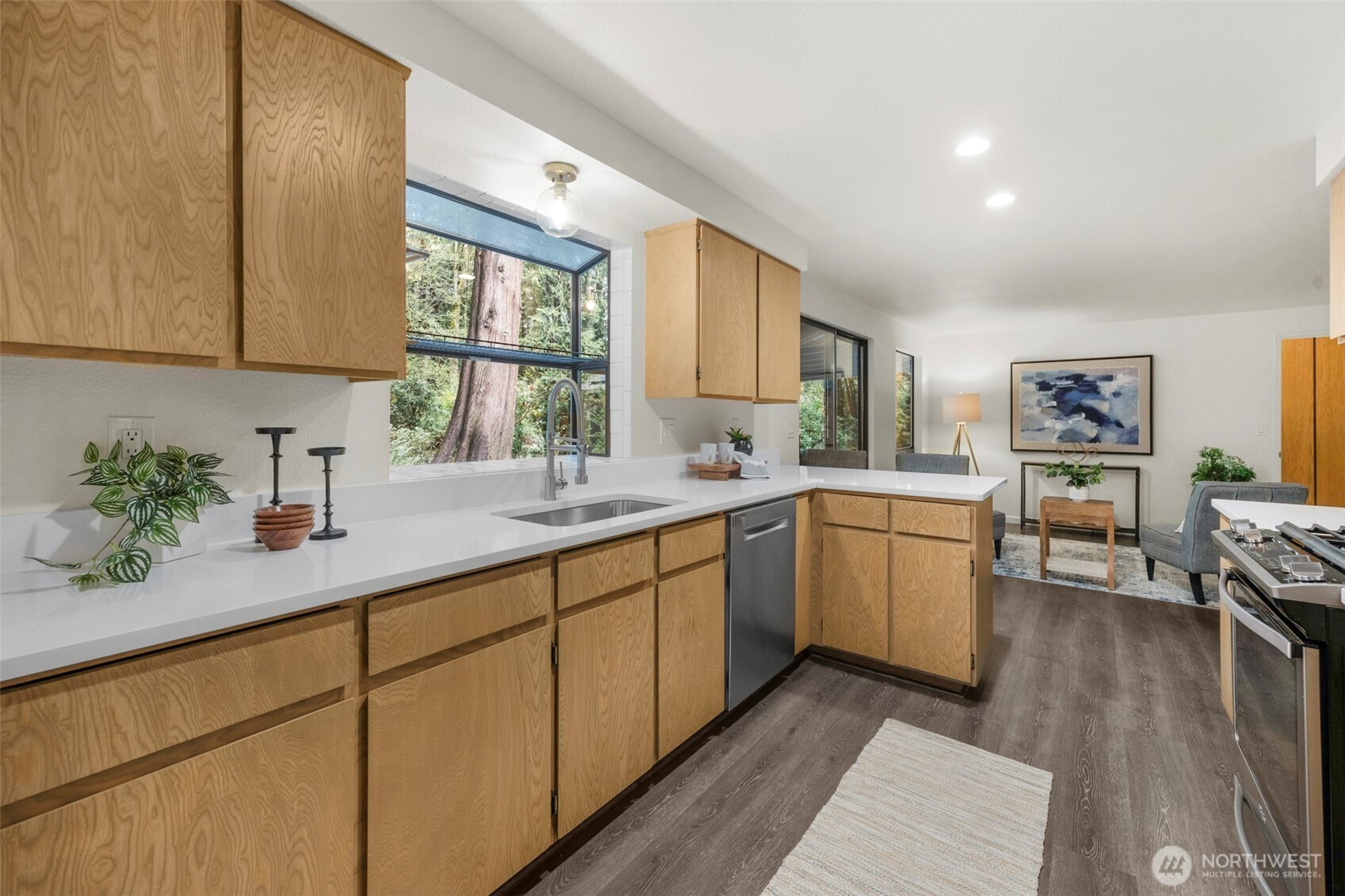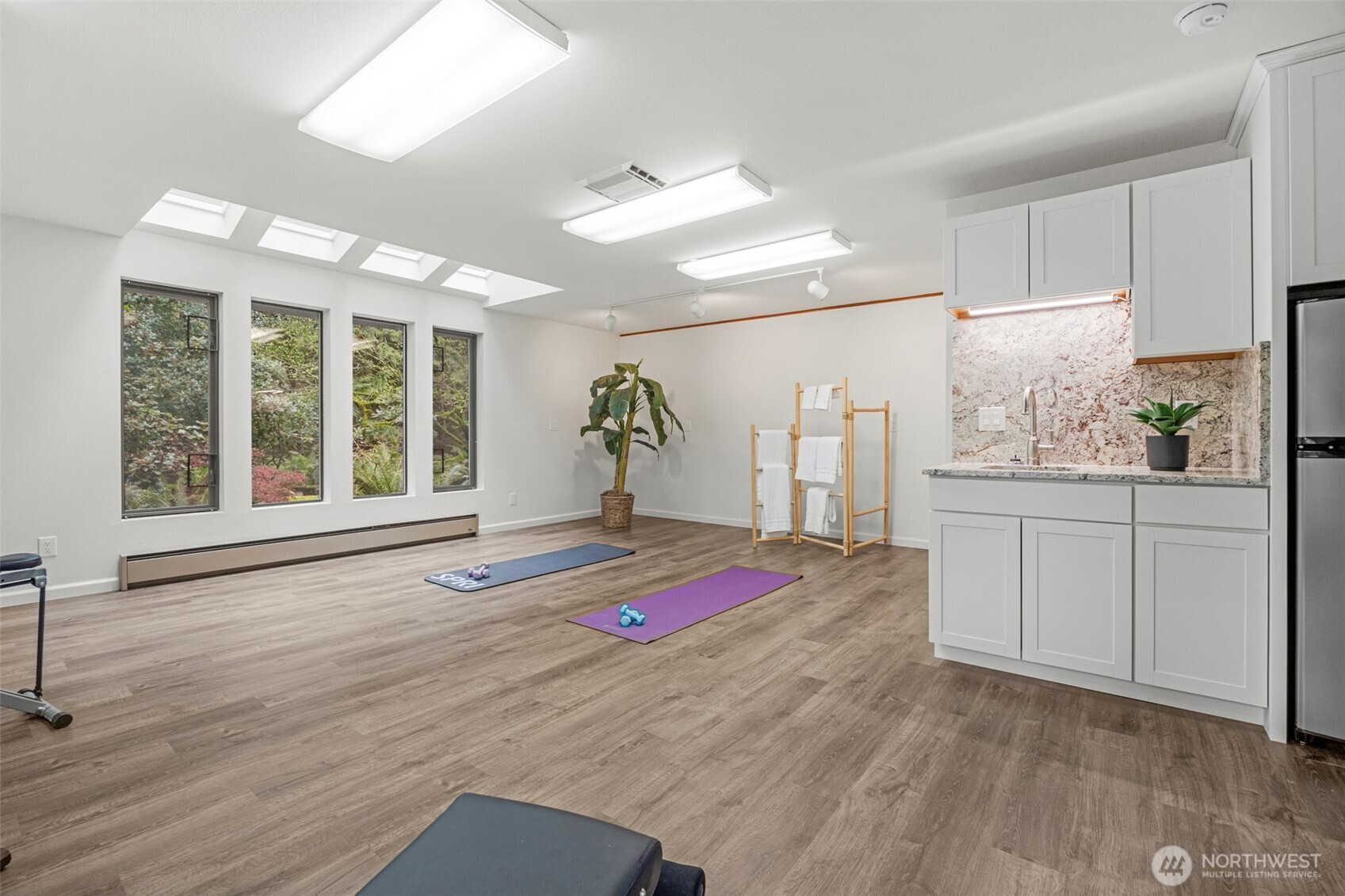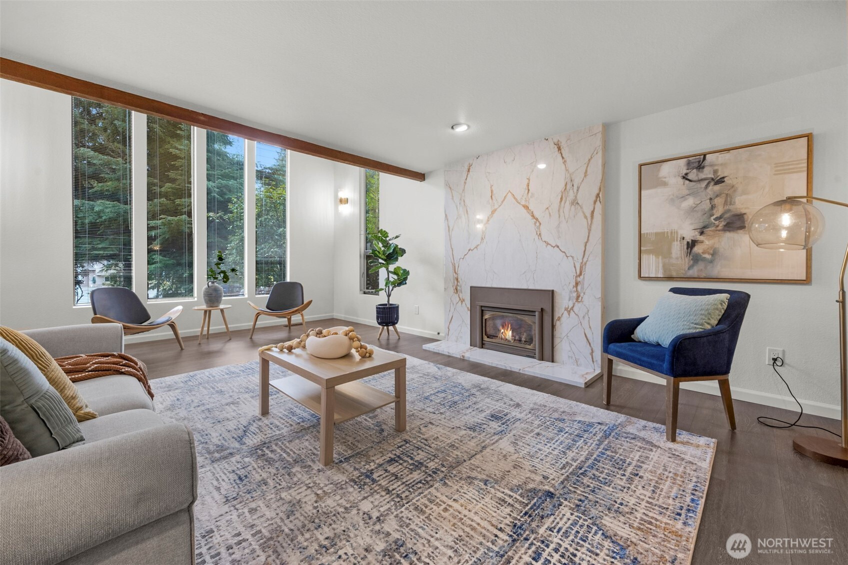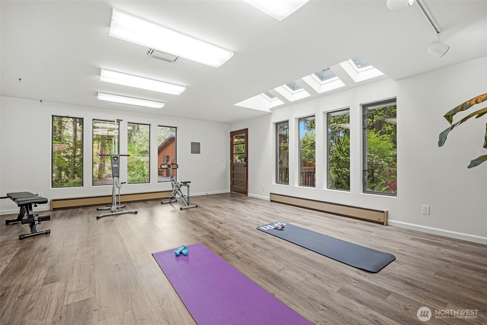 Experience the ultimate Pacific Northwest sanctuary in this stunning Mid-Century Modern masterpiece, perfectly nestled within a private, old-growth forest. The main residence captures the essence of "treehouse living" with soaring vaulted ceilings, exposed architectural beams, and floor-to-ceiling "aquarium" windows that invite the tranquil beauty of the forest into every room. At the heart of the home, a chef-inspired kitchen shines with crisp quartz countertops, high-end stainless appliances, and warm oak cabinetry, flowing seamlessly into an expansive open-concept dining and living area.The crown jewel of this estate is the detached, 500+ square foot studio. Thoughtfully designed with a modern wet bar, half bathroom, skylights, and convenient ramp access, this versatile space is a premier destination for a high-end home gym, creative art gallery, or private guest retreat. Outside, the enchanting grounds are a nature lover’s dream, featuring a seasonal creek with a private wooden bridge, meandering garden trails, and a peaceful fire pit area designed for starlit entertaining.Practical elegance meets timeless character with a light-filled primary suite, updated bathrooms, and a dedicated laundry/mudroom. Located in the heart of Mukilteo, this estate offers rare seclusion without sacrificing convenience. Every detail from the vibrant camellias and lush ferns to the towering cedar canopy, has been curated to offer an unparalleled lifestyle of privacy, peace, and luxury.