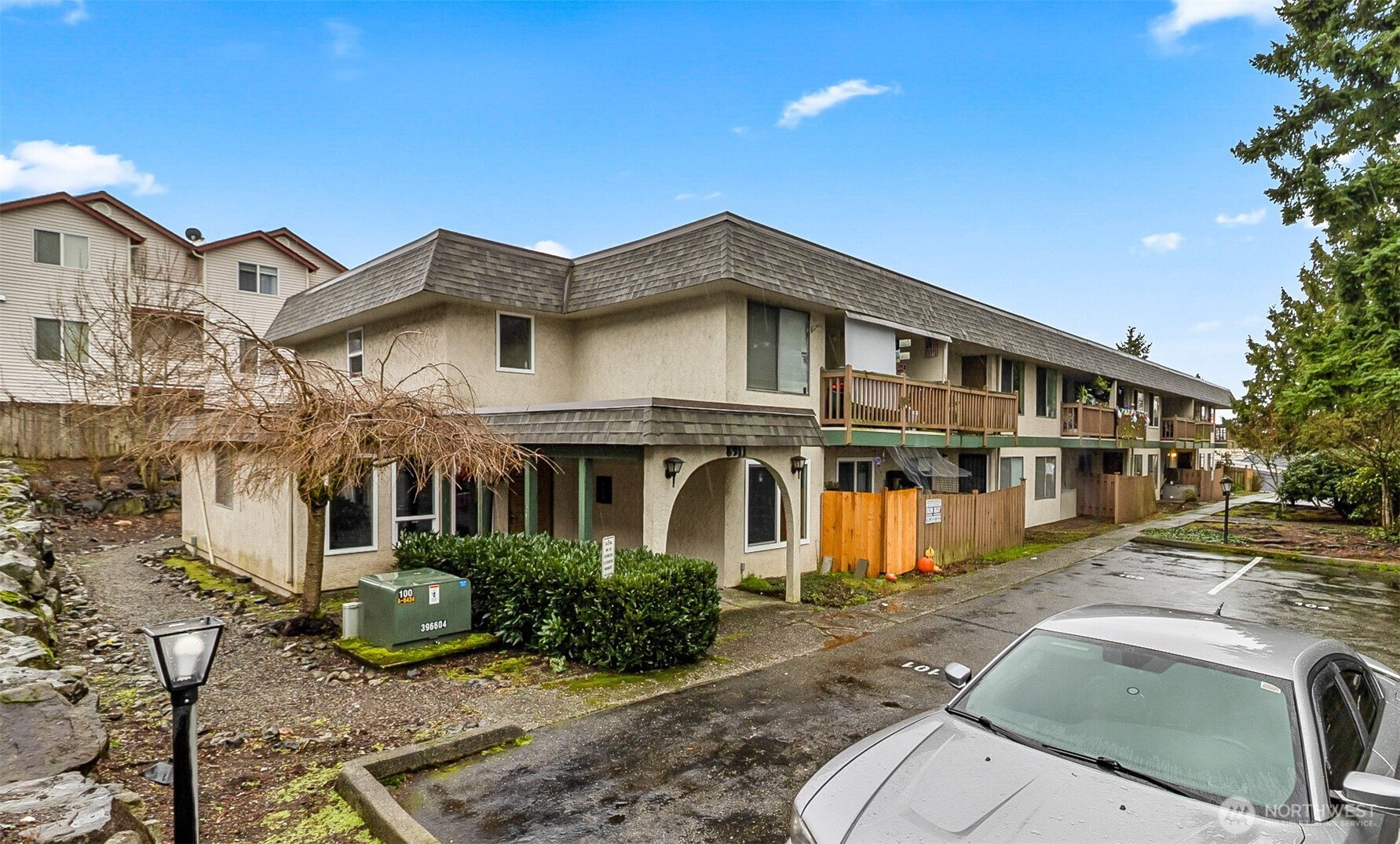 Conveniently located in South Everett’s Holly Gardens, this ground-floor 1-bedroom, 1-bath condo offers zero-step entry and move-in-ready living. Features include laminate flooring in the living and dining areas, carpeted bedroom, 2024 water heater, and full-size in-unit washer and dryer. Enjoy a private deck and the option to purchase fully furnished and well stocked. Secure building with private lobby, locking mailboxes, storage locker, and one assigned parking space near the entrance. Well-managed 28-unit complex with newer roof, no rental cap, and no special assessments. HOA of $350 covers water, sewer, and garbage. Ideal for homeowners or investors. Close to Boeing, dining, and shopping. This is a must see!