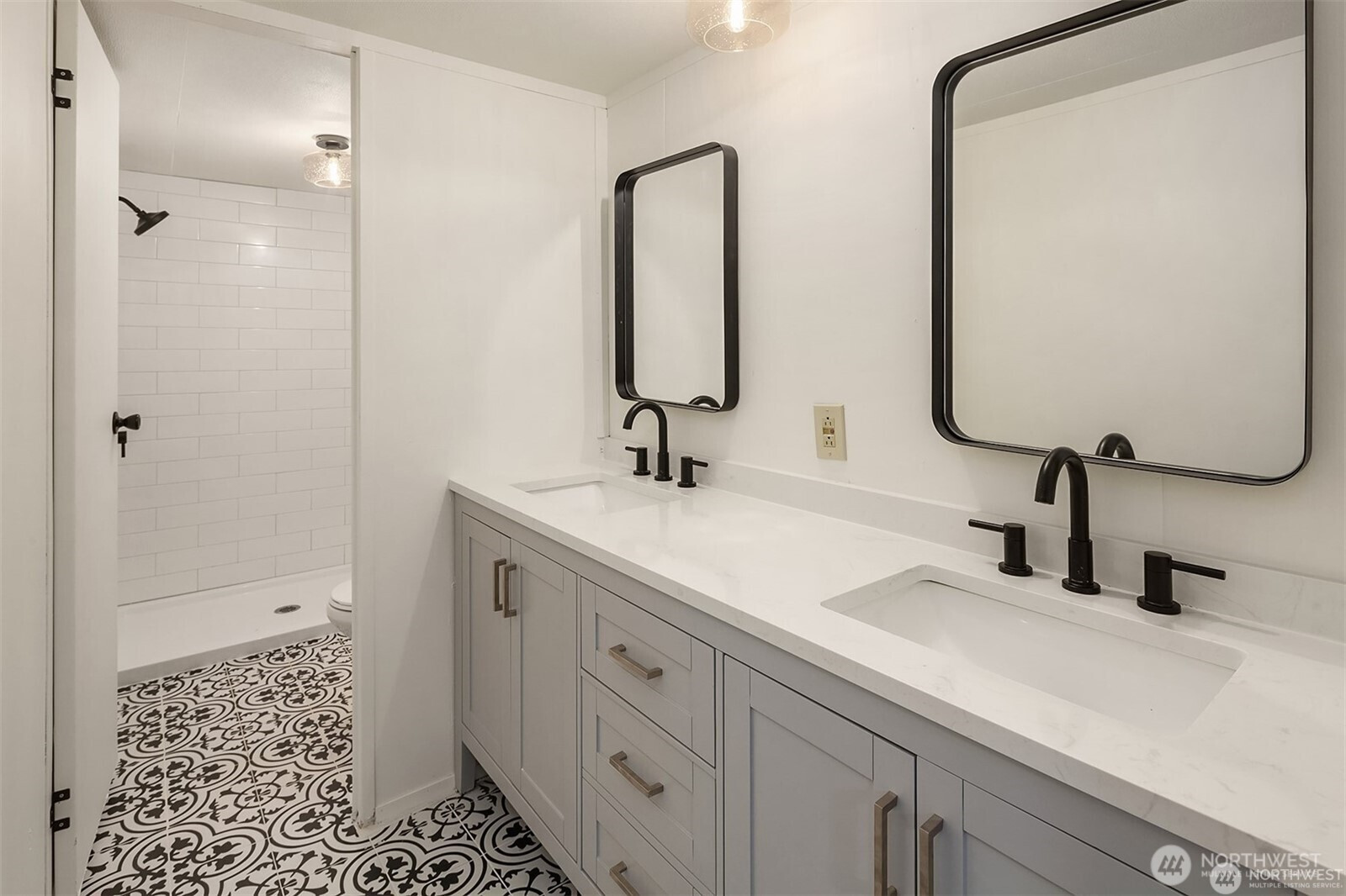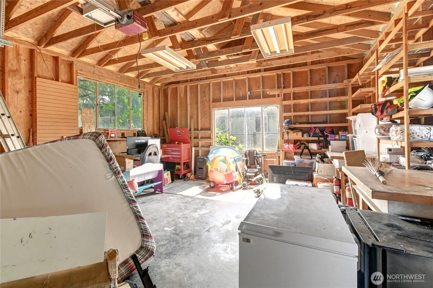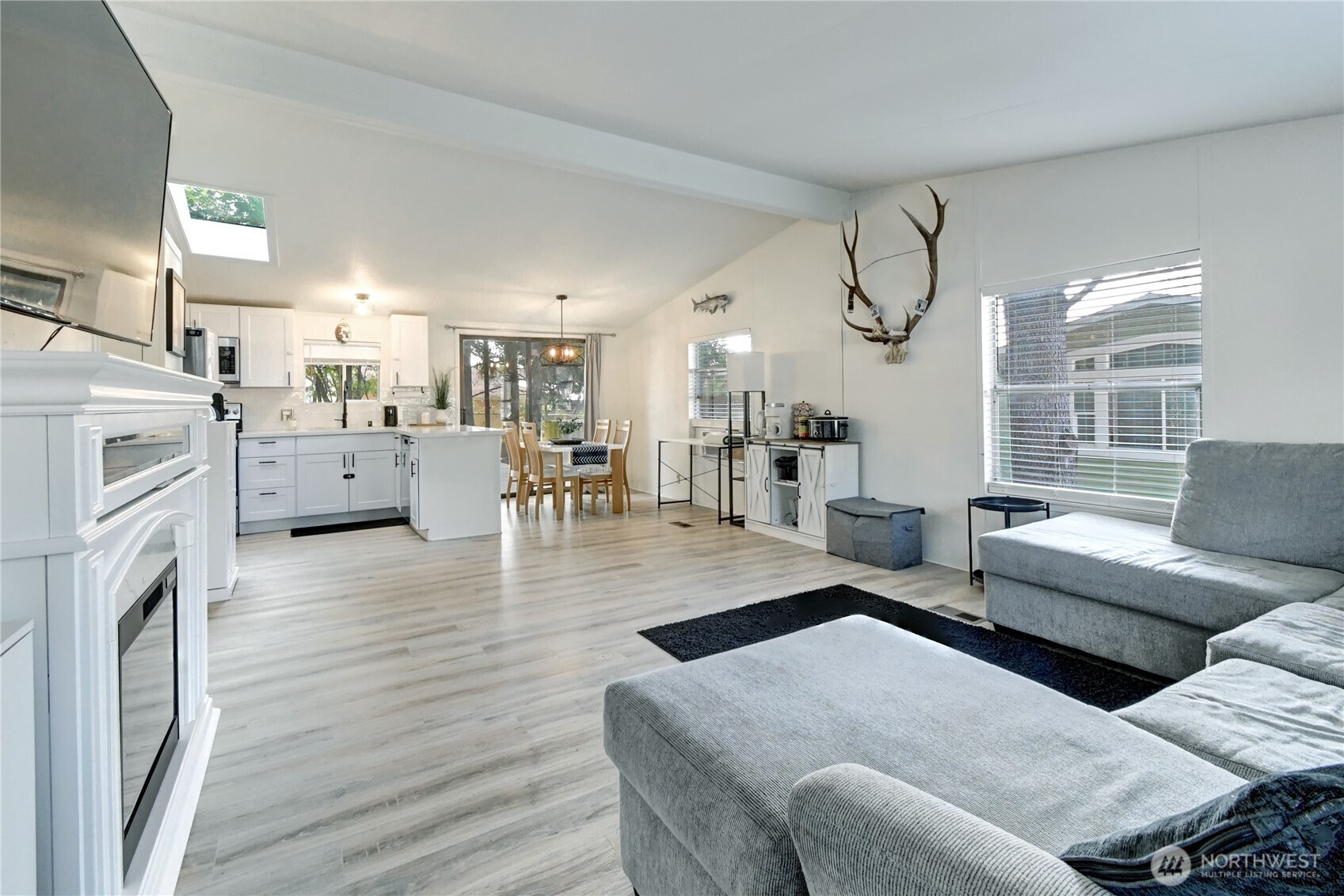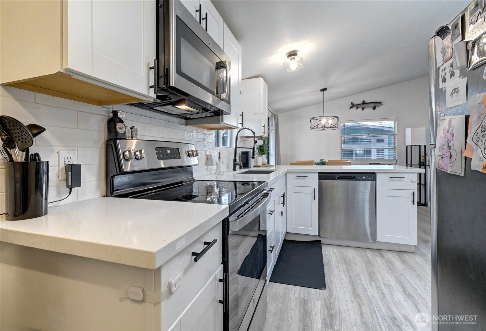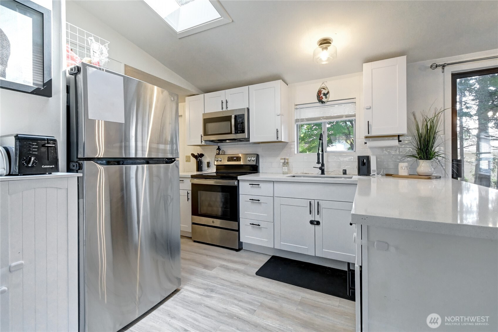 Updated Lake Stevens Home with NEW ROOF, Enormous 480sf Garage/Shop, No HOA & RV/Boat Parking! Walk to Lake Stevens Schools, parks, restaurants and shopping! Large Private Lot with Large Backyard & Deck. Chef's Kitchen boasts New Cabinets, Beautiful Quartz Counters, Pergo Portfolio Waterproof Flooring, full height back splash & Stainless Steel Appliances. Bathrooms with tile shower surrounds, tile flooring and updated hardware. Vaulted Ceilings, Skylights and Large Windows fill this home with light while the trees offer privacy and shade outside. Room to entertain, enjoy hobbies, or just relax on the back deck. Massive detached shop/garage plus long driveway. New PEX plumbing & crawl space insulation in 2023. Washer & Dryer stay