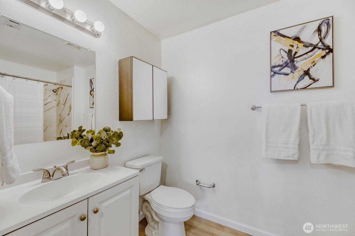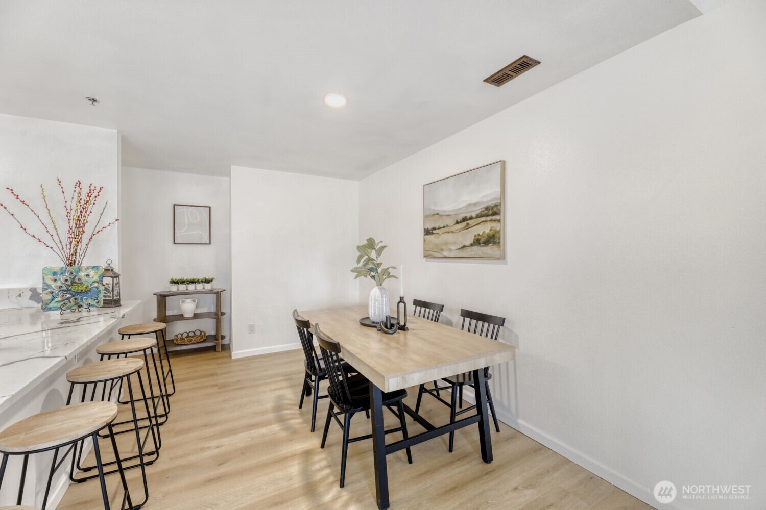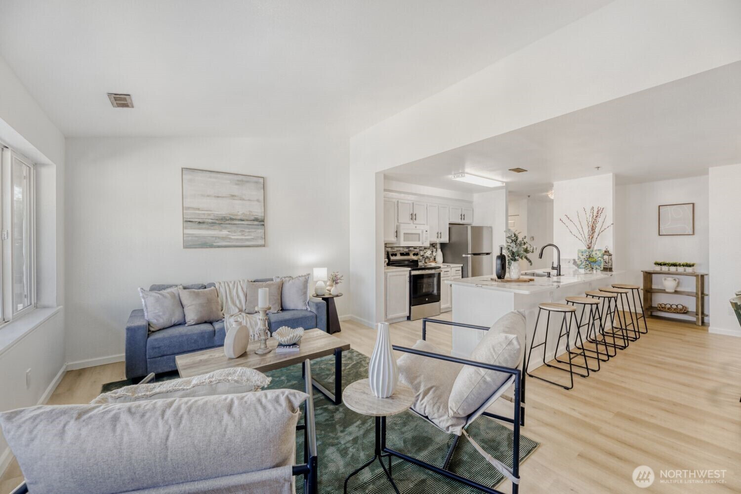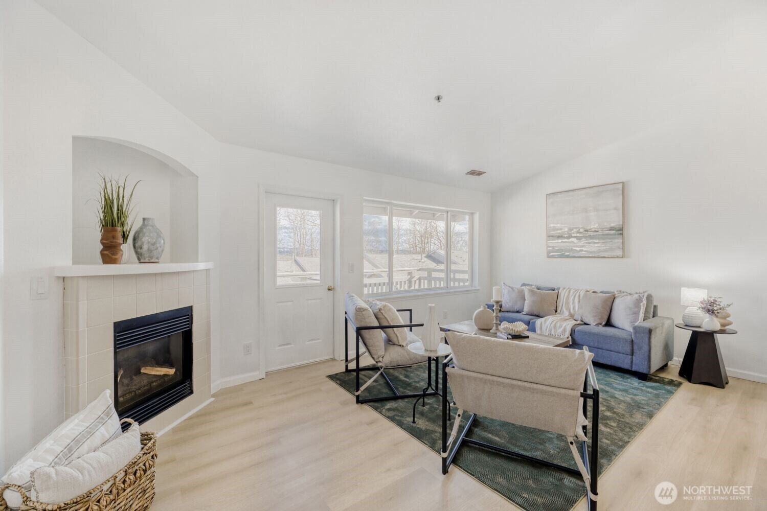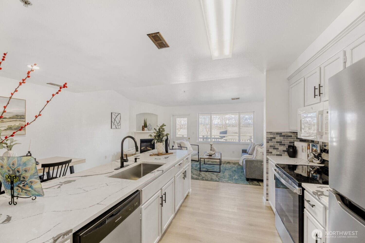 Welcome home to this stylishly remodeled, move-in-ready condo offering easy one-level living with accessible, level entry and no stairs! The open layout feels bright and inviting with soaring vaulted ceilings, a cozy gas fireplace, and gorgeous new luxury vinyl plank flooring throughout.The updated kitchen shines with quartz countertops, designer tile backsplash, and a deep stainless steel sinkâperfect for cooking, entertaining, or morning coffee before work. The spacious primary suite features a private full bath, plus a second full bathroom ideal for guests or roommates.Enjoy the convenience of an attached 1-car garage, large deck with views of the city and mountains, guest parking right out front, and a prime location close to Boeing, major freeways, shopping, dining, and all that Everett has to offer.Low-maintenance living, modern upgrades, and an unbeatable locationâthis one is fun, fresh, and ready for you!