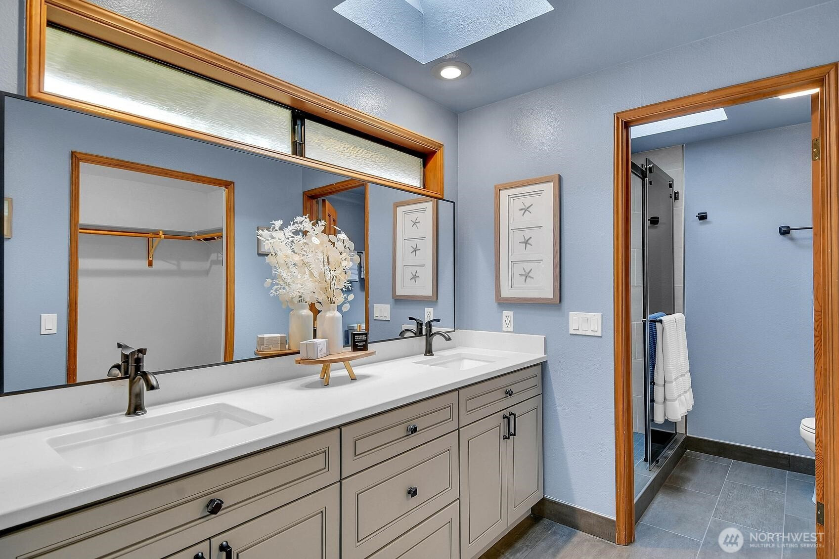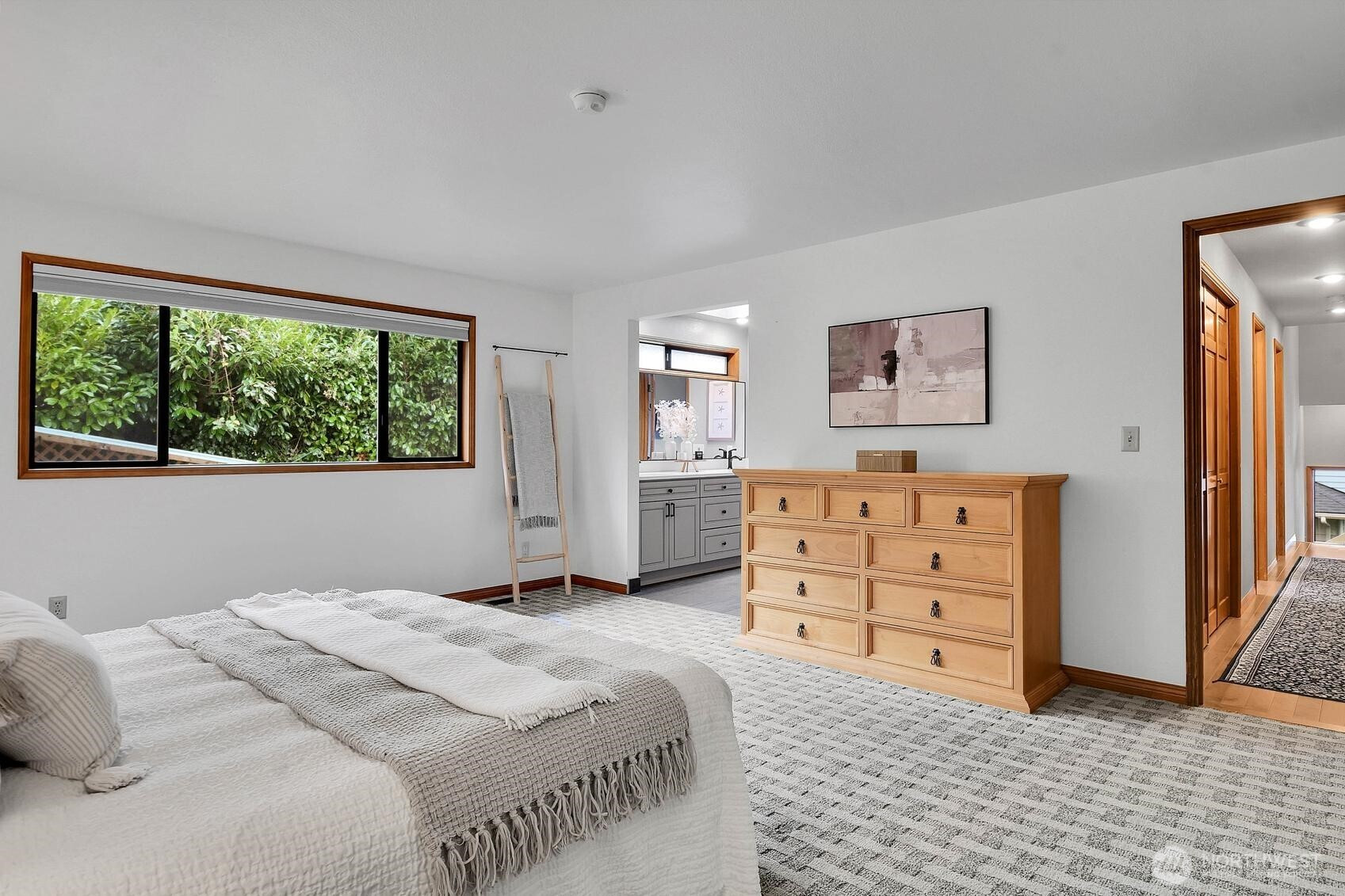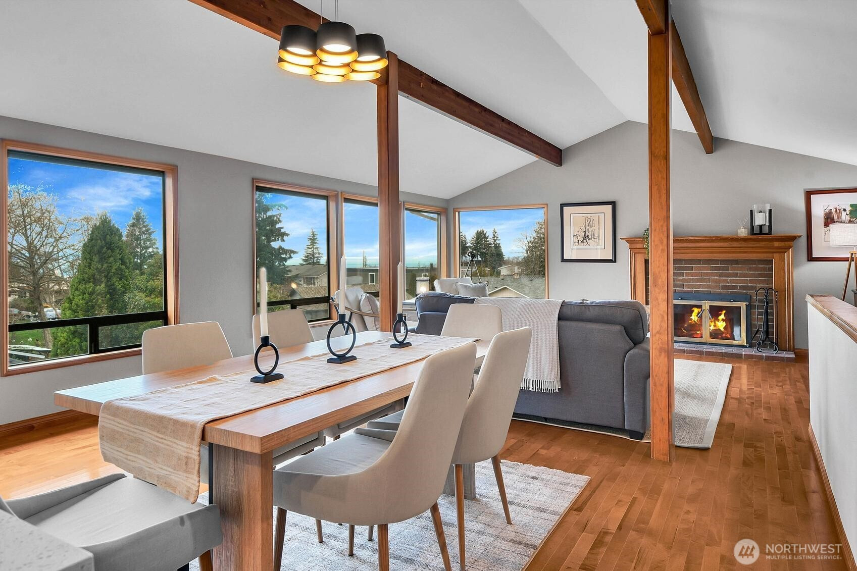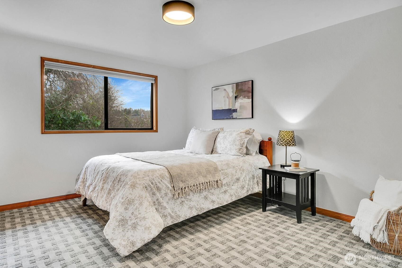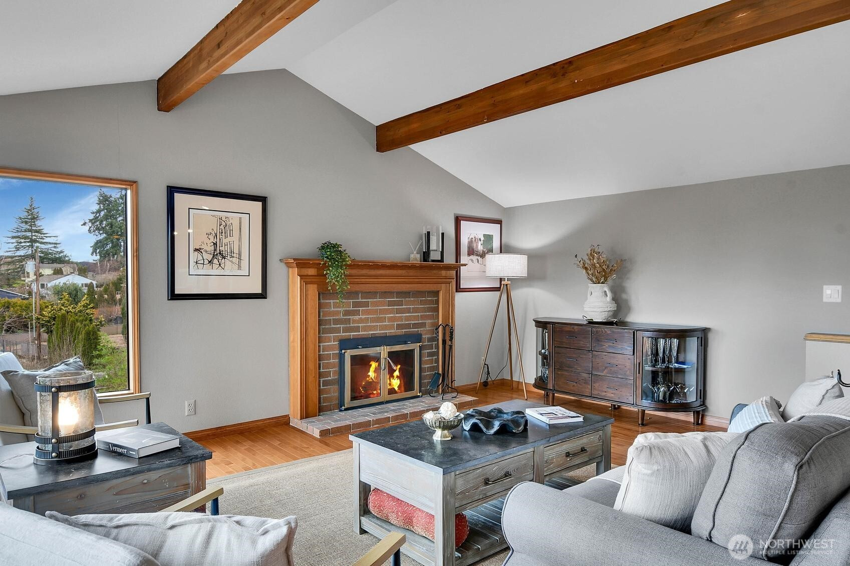 4-bed walkable Edmonds Bowl home privately tucked on 7th Ave. Top floor great room w/ vaulted beamed ceilings & details. Oversized windows w/ views of the Puget Sound & Olympics. Wood-burning fireplace. Updated kitchen w/ shaker-style maple cabinetry, slab quartz countertops, & all SS appliances. Hardwoods throughout. 3-beds on main including the generous Primary Suite w/ ¾ en suite bath featuring dual sinks, large walk-in shower with glass barn-style door & skylight. Walk-in closet. Huge lower-level bonus w/ built-in media cabinet & gas fireplace. Front & back decks extend entertaining outdoors. Tankless water heater. Turnkey & meticulously maintained. Walk to farmer’s market, shopping, coffee, & eats.