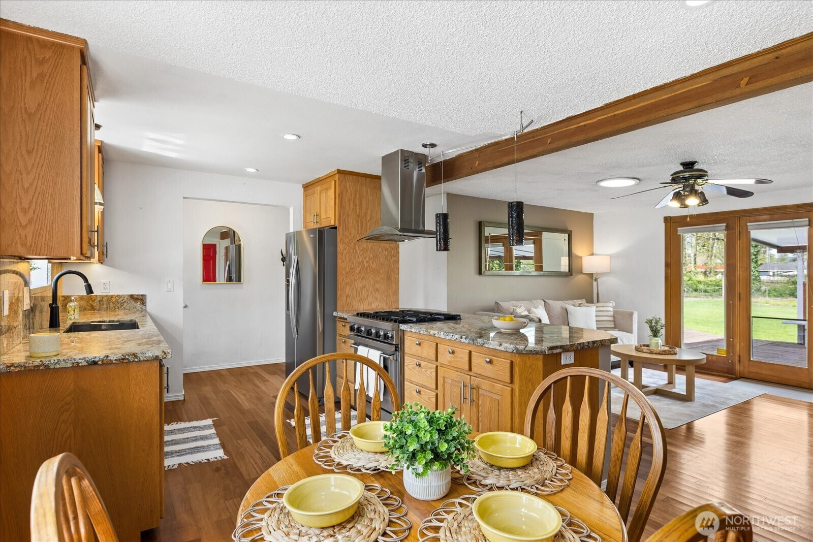 Lovely Sultan rambler on shy half acre lot, plus a large shop! The cozy living room is anchored by a pellet stove, and adjoins the updated kitchen and dining space. French doors from the living room to the covered deck! Light filled kitchen with a Viking gas range and hood, granite counters, garden window and bar seating. Built-in buffet storage or extra pantry cabinet in the dining area. Two bedrooms and a full bath down the hall. The extra large primary room has vaulted ceilings, a walk-in closet, ensuite bath with large walk-in shower (dual shower heads), and doors out to the deck! Large laundry room with plenty of work space separates the primary from the other side of the home, adding extra privacy. Huge partially covered back deck with a gas fire pit. Fresh exterior paint, newer roof and newer hot water heater! Fully fenced, level backyard with plenty of room for hobbies, gardens or animals! In addition to the attached 2 car garage, there is a 990 SF shop!! Shop has a roll up door and is on a separate sub panel- includes a 60 gallon compressor, 30 amp plug, heat fan and loft space. Additional 840 SF covered pole building! RV hookups! Tons of parking and endless possibilities! Located in a quiet cul-de-sac, this community has river access and a playground. NO HOA!! Close to town and HWY 2, with quick access to recreation- Stevens Pass, fishing, hiking, kayaking and more! Make this great property your own!