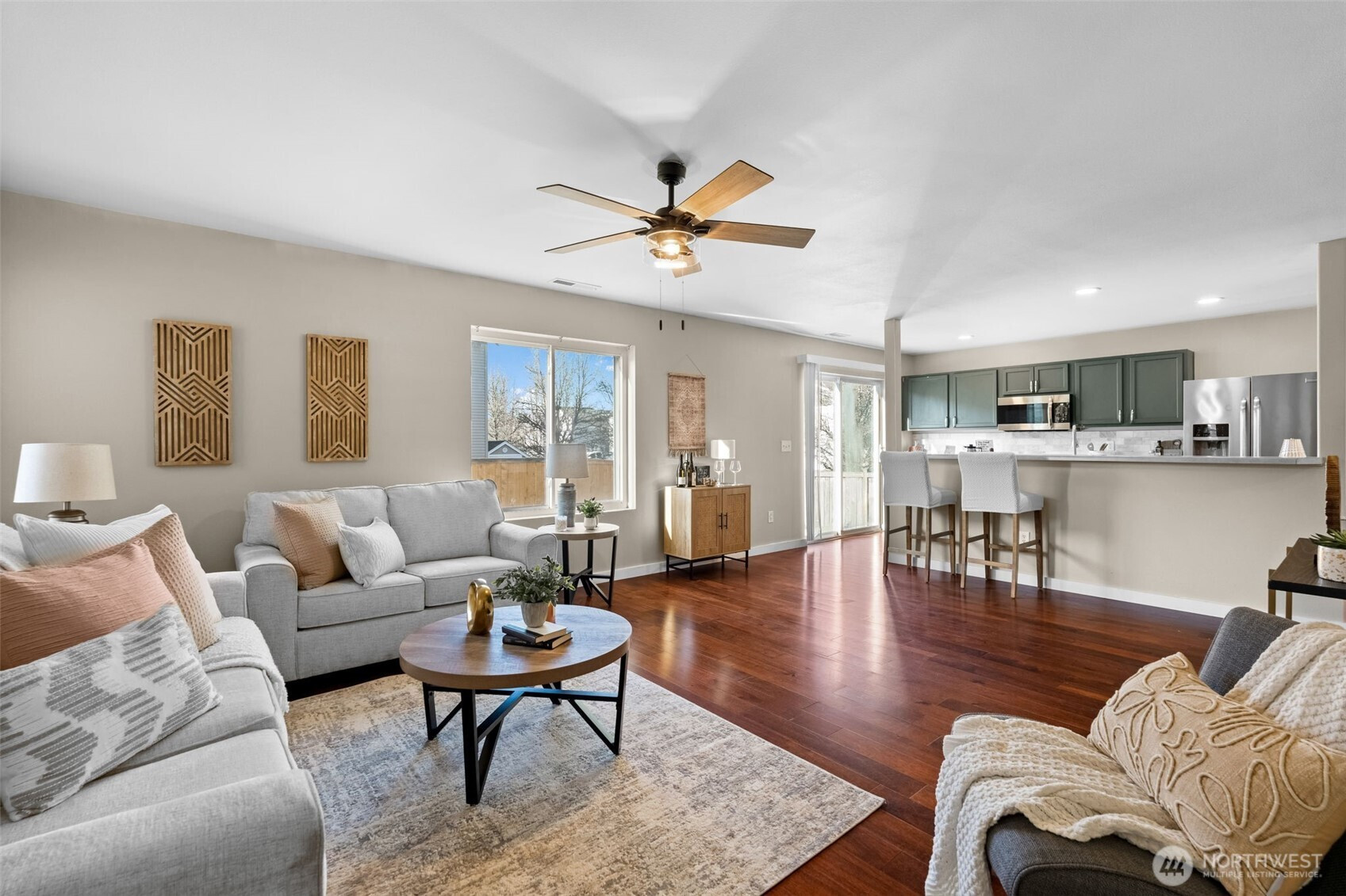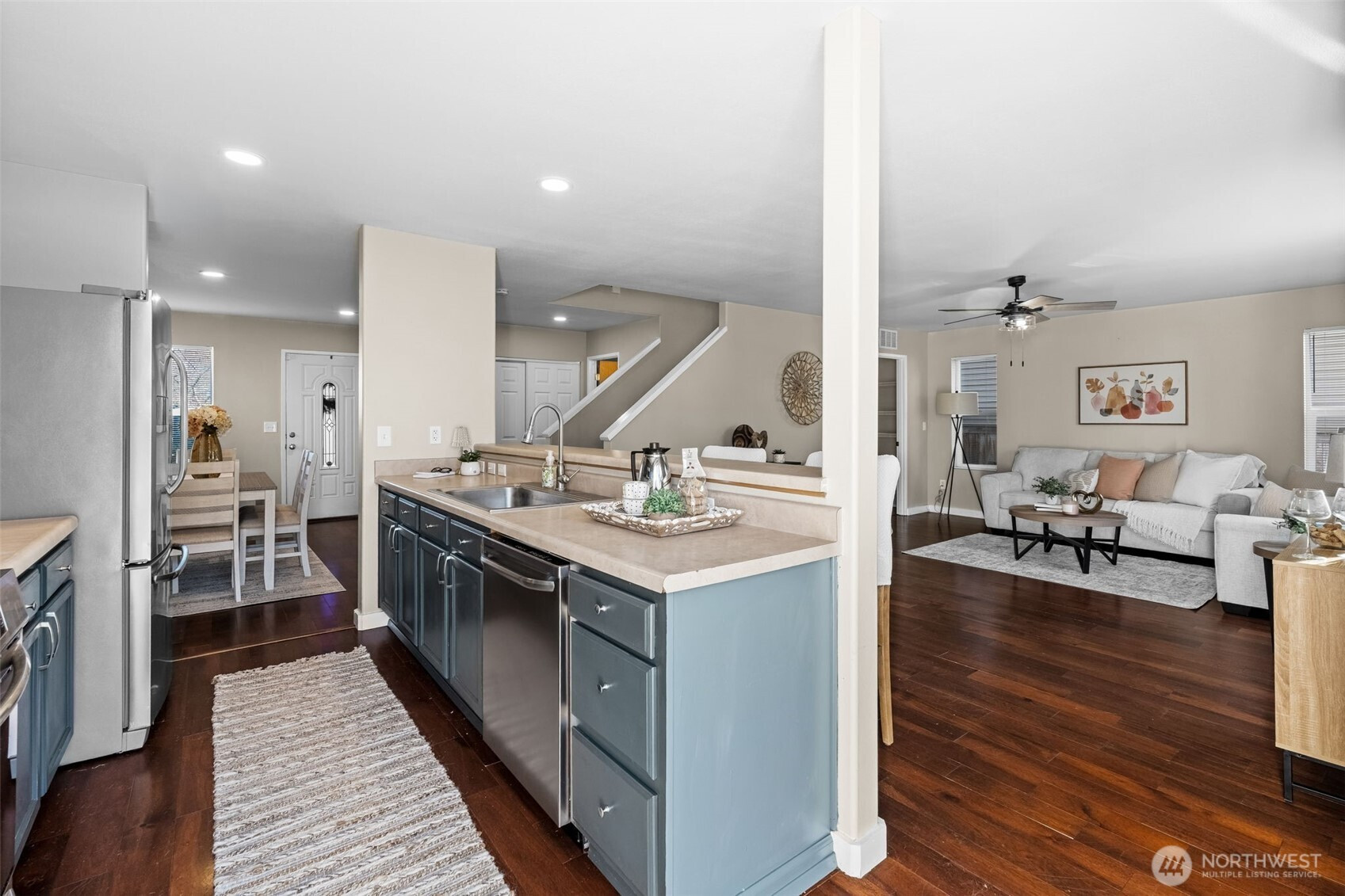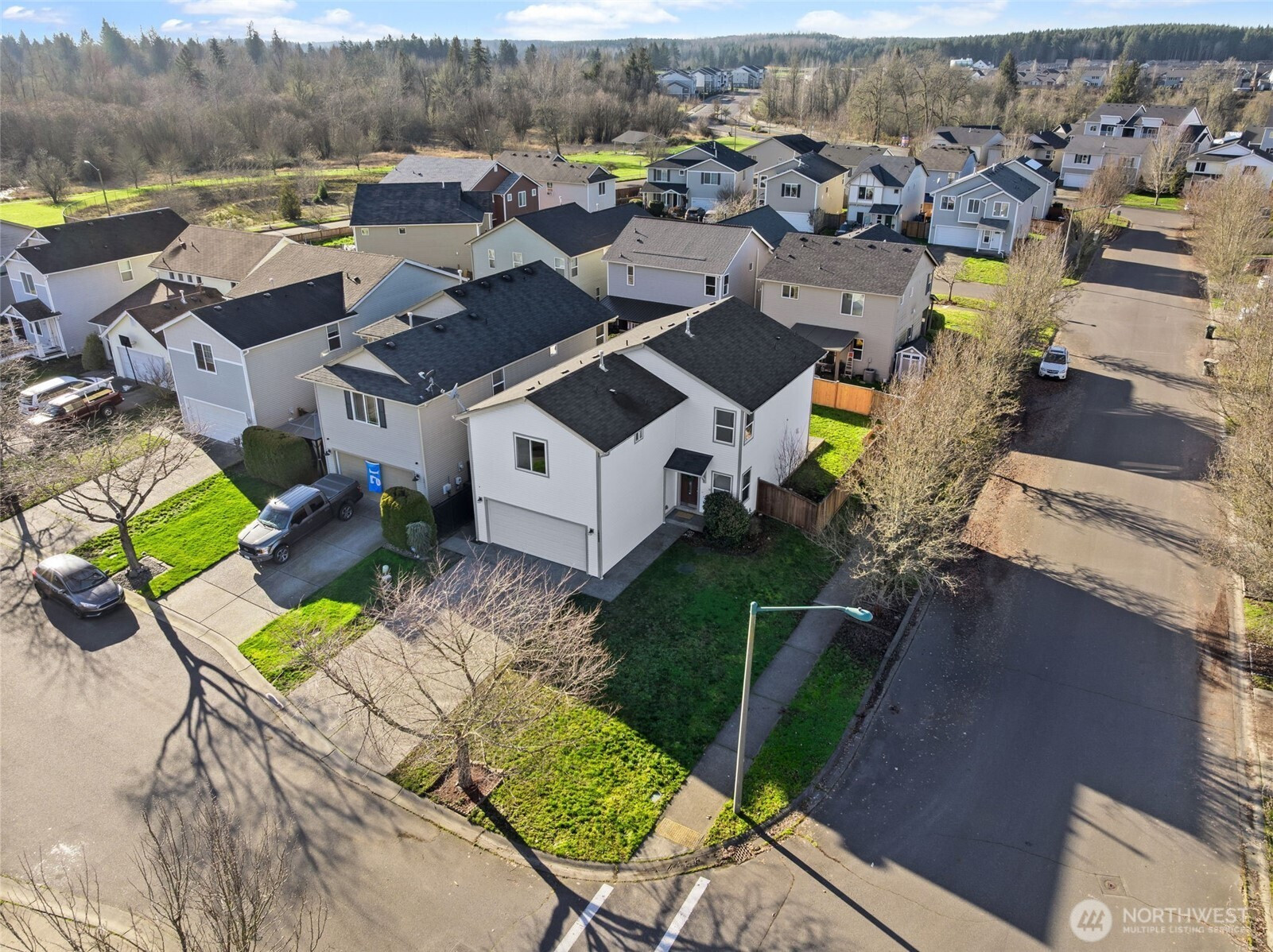 This beautiful 4-bedroom, 2.5-bath home with over 2,100 sq ft of living space sits on a spacious corner lot with views of Mount Rainier in the desirable Tahoma Meadows neighborhood, just minutes from restaurants, coffee shops & parks. The open-concept main floor features high ceilings, stunning vinyl plank flooring and a bright, open-concept kitchen that flows seamlessly into the dining and living room—perfect for entertaining with a sliding door to a large patio and fully fenced backyard. Upstairs, the generous primary suite with a huge walk-in closet and En suite bath with soaking tub and walk-in shower. Three additional bedrooms & walk-in closets and another full bath. New A/C system, two-car garage and easy access to Downtown Yelm and JBLM. **Assumable VA loan with a 3% interest rate and approximately $2,440 monthly payment. Walking distance to parks & trails.