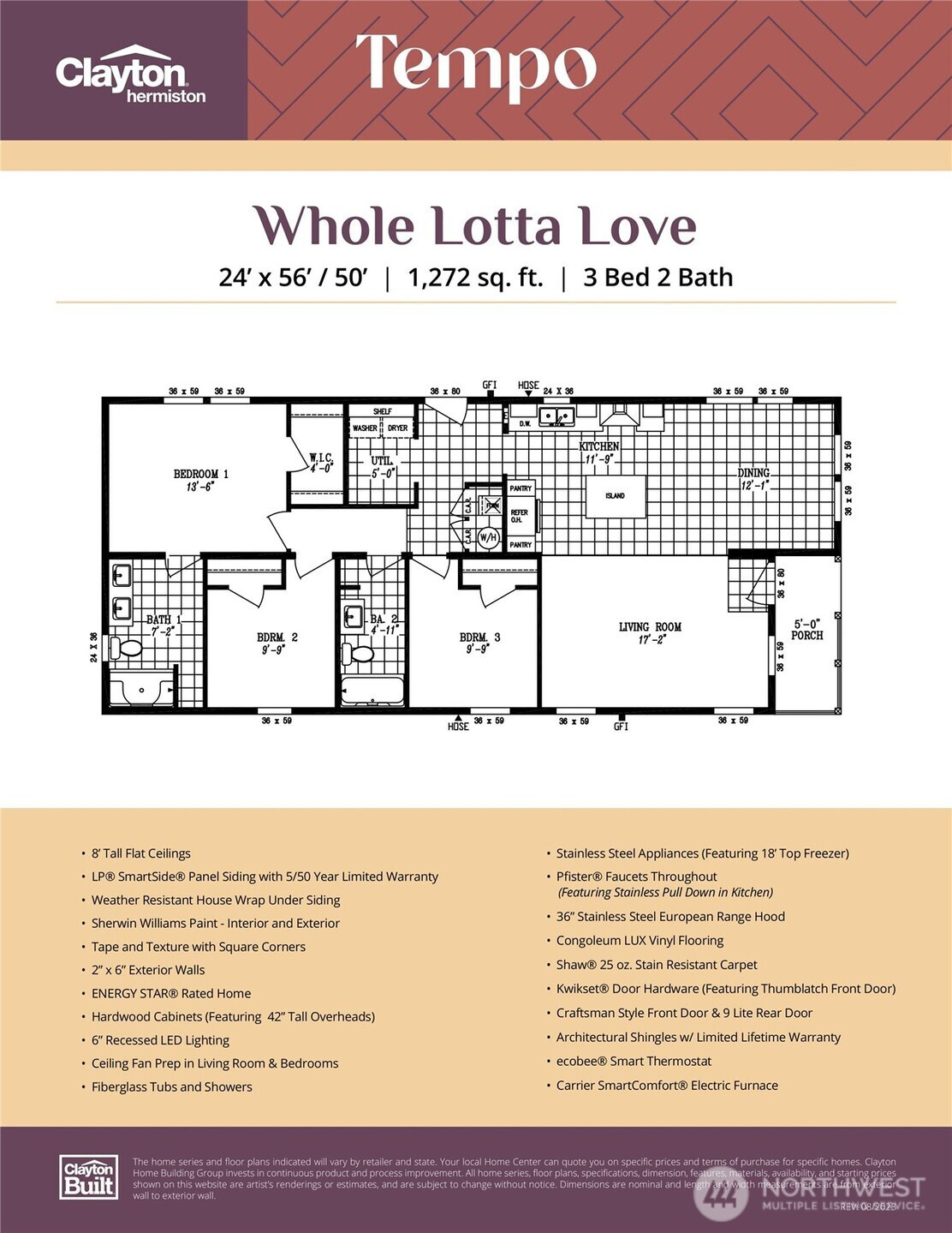 Welcome to your Brand New home in Claudia’s All Ages Park! The Whole Lotta Love floorplan by Clayton Homes features an open layout with recessed lighting throughout. The kitchen boasts stainless steel appliances, tons of cabinets for all your cooking gadgets and a large island with breakfast bar that flows seamlessly into the dining and living areas - perfect for entertaining! Primary bedroom offers a walk-in closet and private bath with dual sinks. Outside you'll find a relaxing covered front porch, carport with storage shed and plenty of parking for you and your guests. The community features a recently renovated clubhouse with exercise room. Fantastic location close to I-5, Nisqually Wildlife Refuge, JBLM, shopping & restaurants. Don’t miss out - ask about available financing options!