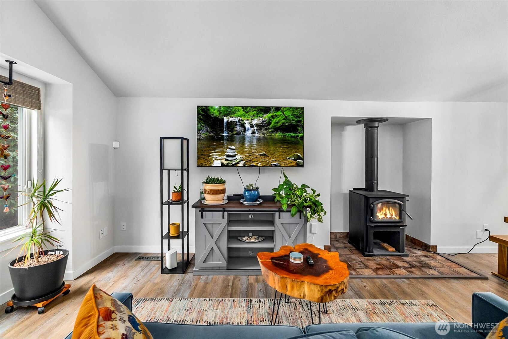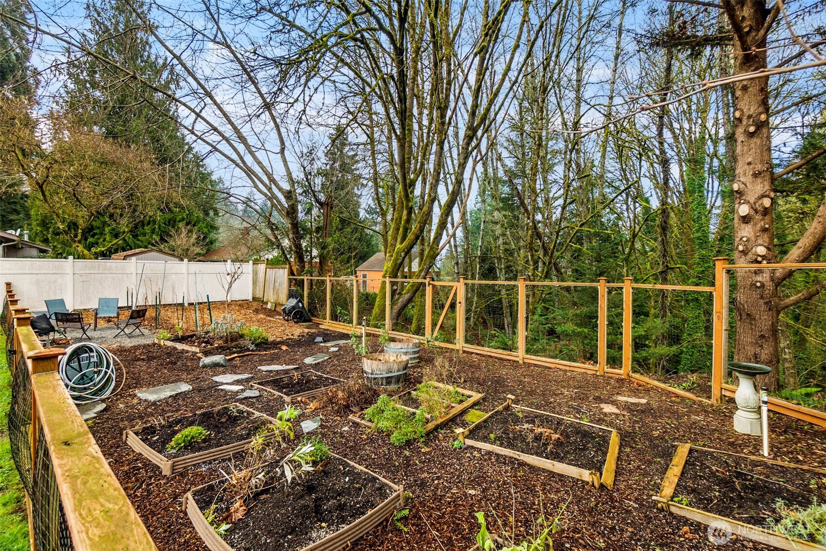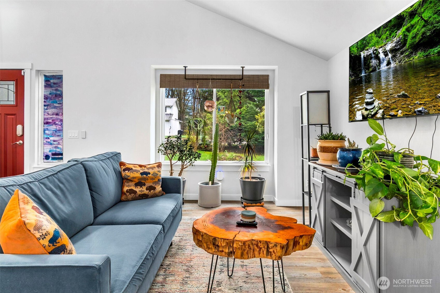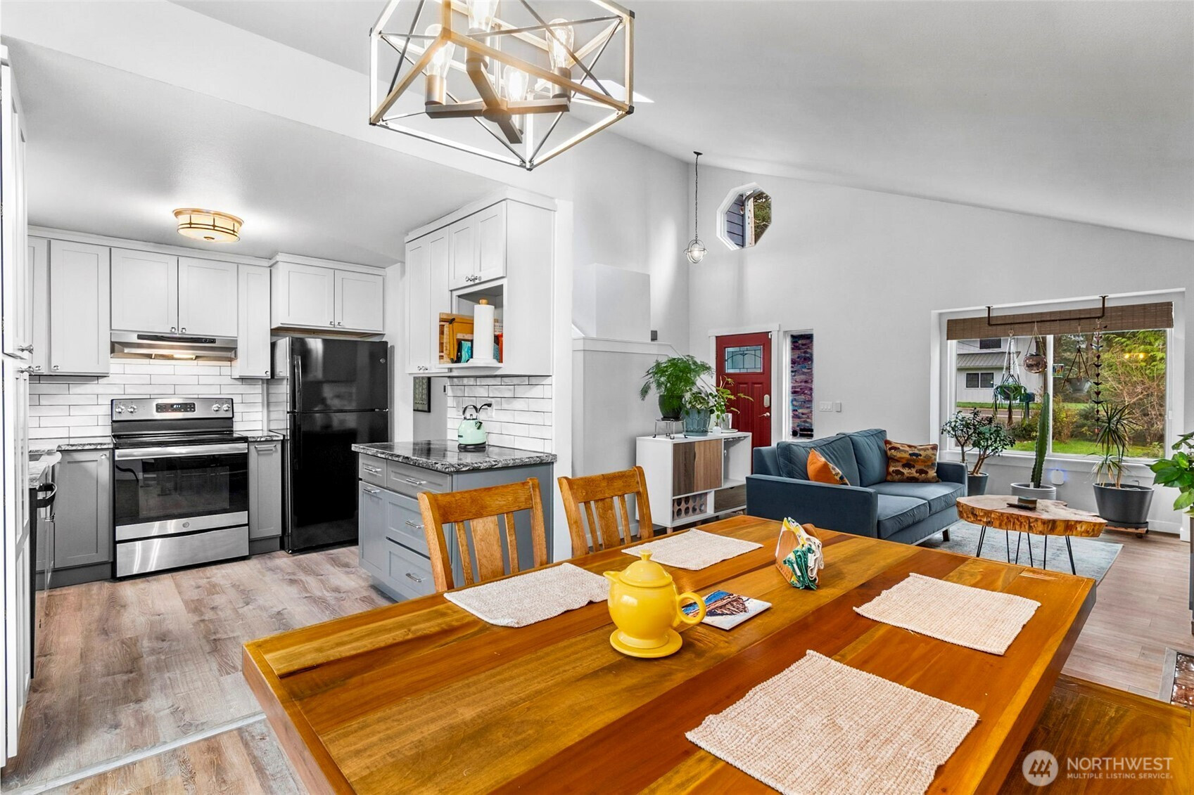 Extensive updates, strong energy efficiency, and a desirable Olympia location come together in this well maintained home. A full interior remodel completed in 2023 refreshed the kitchen, living spaces, bedrooms, and bathrooms with clean, current finishes. A new roof was installed in 2022, and a 35 panel solar system added in 2021 supports long term efficiency and lower overall energy use. Living spaces feel bright and comfortable, with updates focused on finishes and overall condition. The kitchen sits alongside the dining area, offering a practical setup for everyday use. The living room features a cozy wood stove that adds warmth and character, with a half cord of wood stored in the detached outdoor shed. A bonus room off the kitchen provides flexible space well suited for a home office, den, or additional living area. A heat pump supplies efficient heating and air conditioning. The fully fenced backyard is thoughtfully maintained with landscaped yards and garden beds. Established beds and usable open space create a calm, well organized setting. The backyard view looks onto a neighboring forested area, creating a green backdrop and added privacy. Watershed Park sits directly across the street, offering immediate access to forested trails and natural surroundings. Downtown Olympia is just down the road for easy access amenities. These elements combine to create a home that is comfortable, well cared for, and easy to settle into.