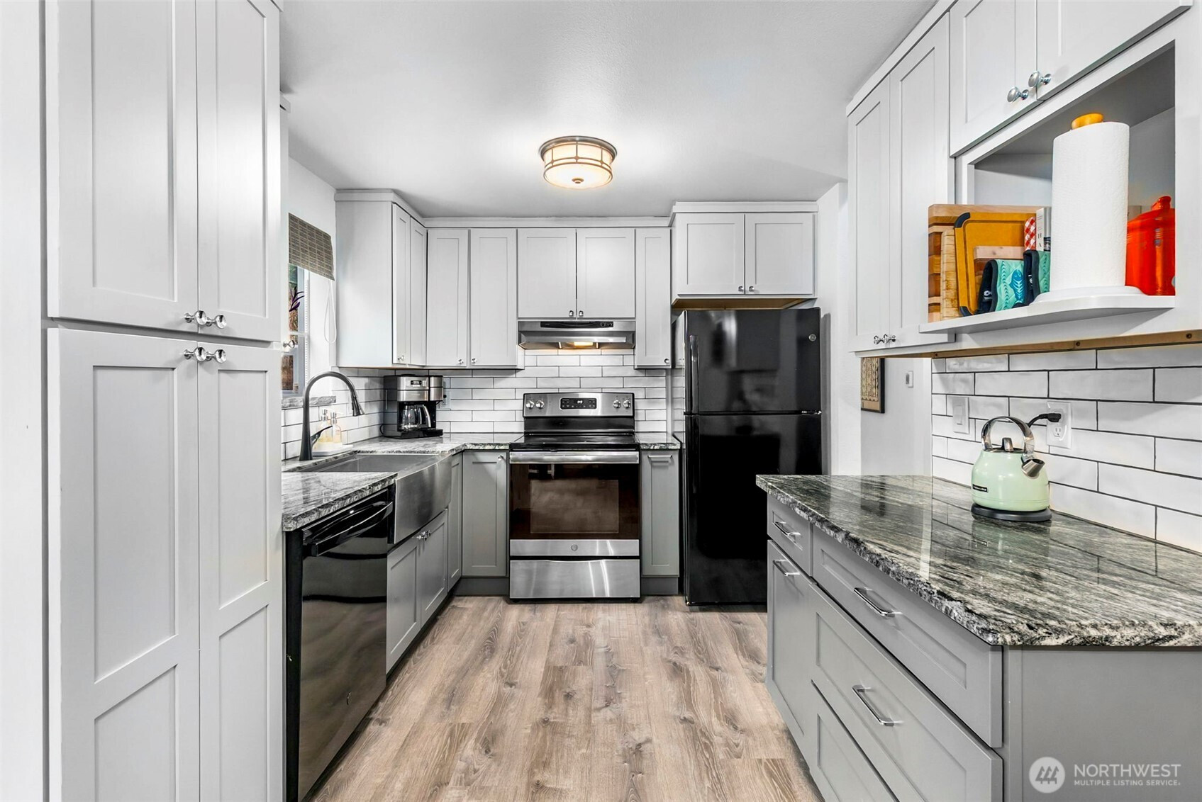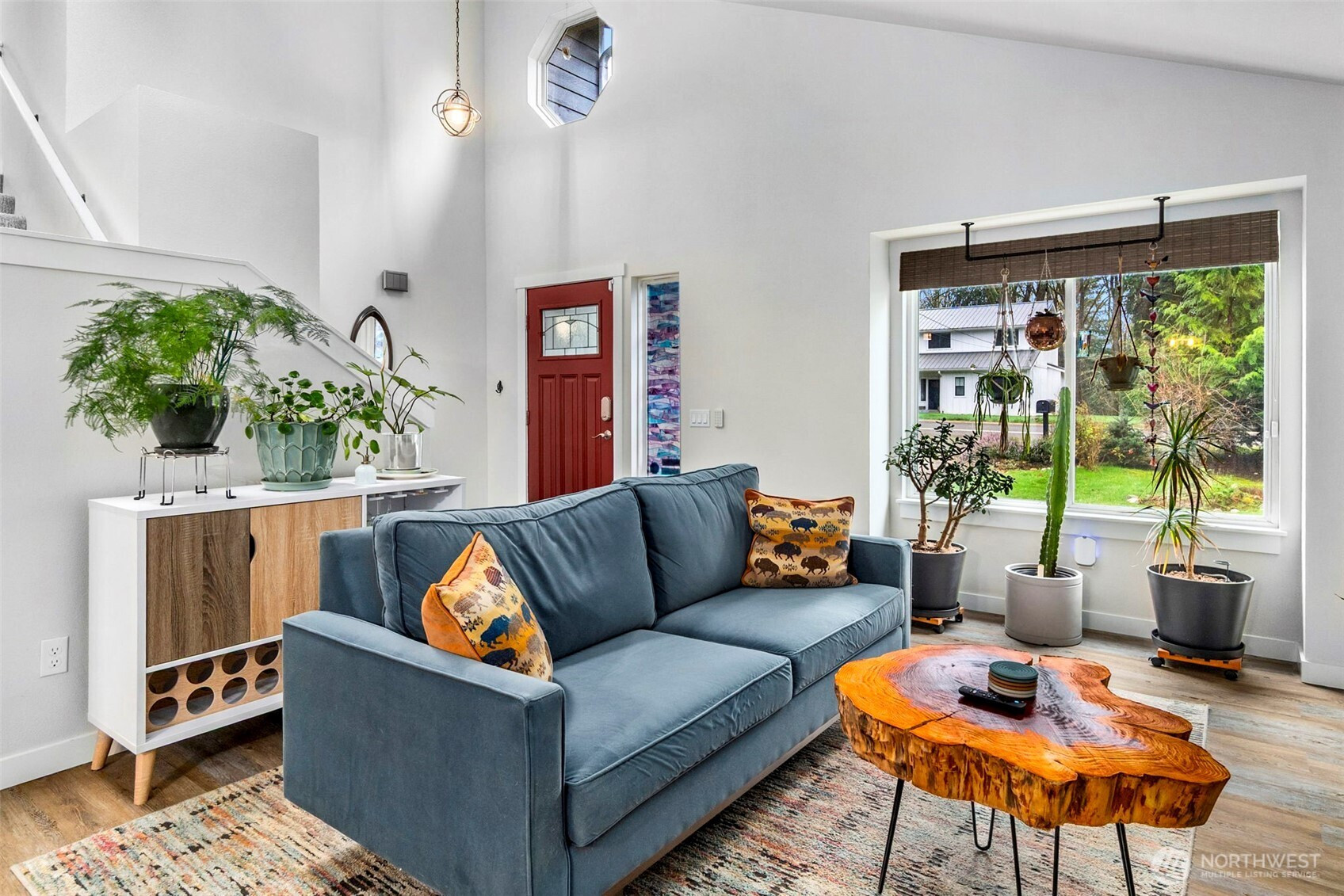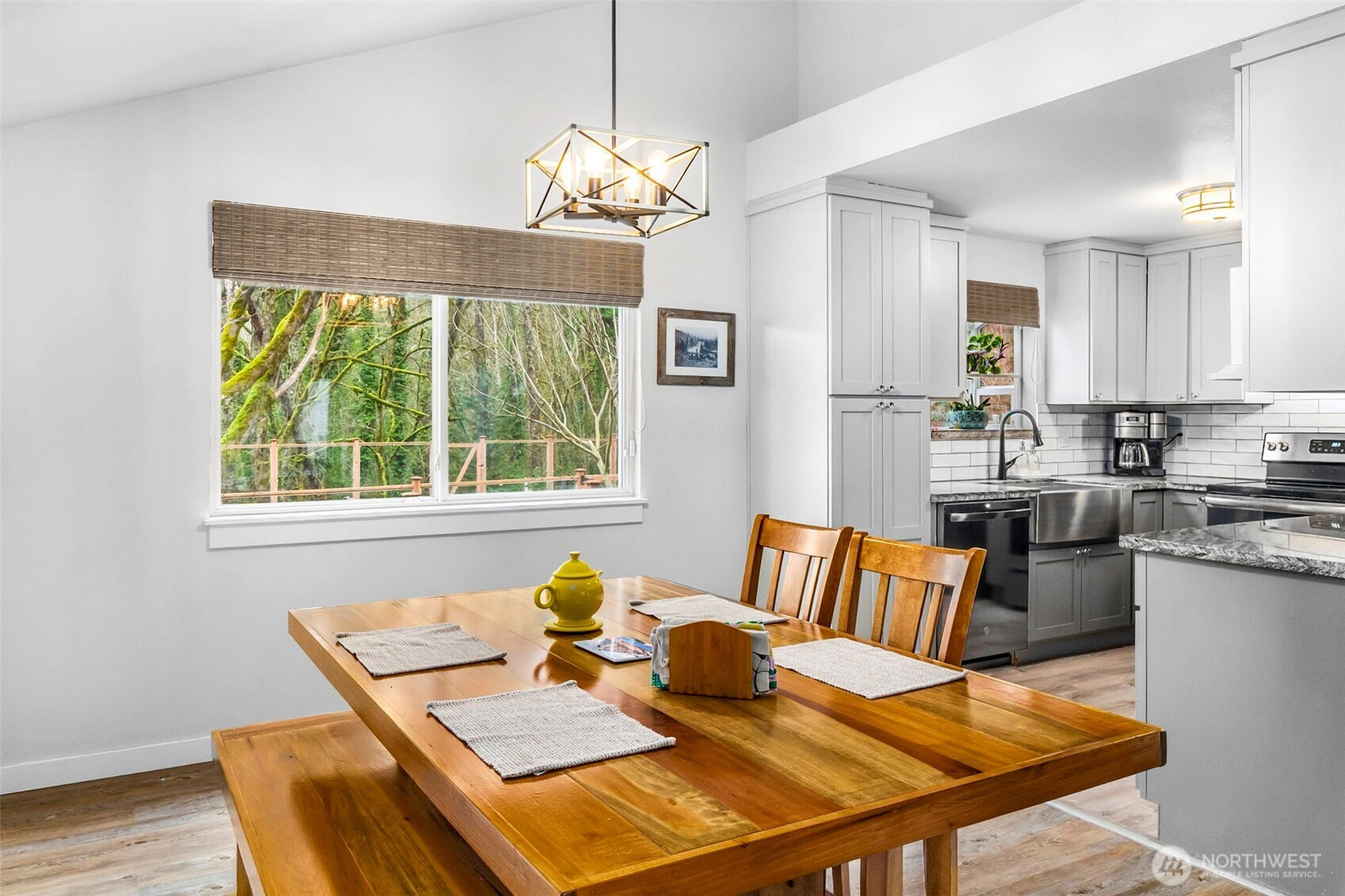 Extensive updates, strong energy efficiency, and a desirable Olympia location come together in this well maintained home. A full interior remodel completed in 2023 refreshed the kitchen, living spaces, bedrooms, and bathrooms with clean, current finishes. A new roof was installed in 2022, and a 35 panel solar system added in 2021 supports long term efficiency and lower overall energy use. Living spaces feel bright and comfortable, with updates focused on finishes and overall condition. The kitchen sits alongside the dining area, offering a practical setup for everyday use. The living room features a cozy wood stove that adds warmth and character, with a half cord of wood stored in the detached outdoor shed. A bonus room off the kitchen provides flexible space well suited for a home office, den, or additional living area. A heat pump supplies efficient heating and air conditioning. The fully fenced backyard is thoughtfully maintained with landscaped yards and garden beds. Established beds and usable open space create a calm, well organized setting. The backyard view looks onto a neighboring forested area, creating a green backdrop and added privacy. Watershed Park sits directly across the street, offering immediate access to forested trails and natural surroundings. Downtown Olympia is just down the road for easy access amenities. These elements combine to create a home that is comfortable, well cared for, and easy to settle into.
