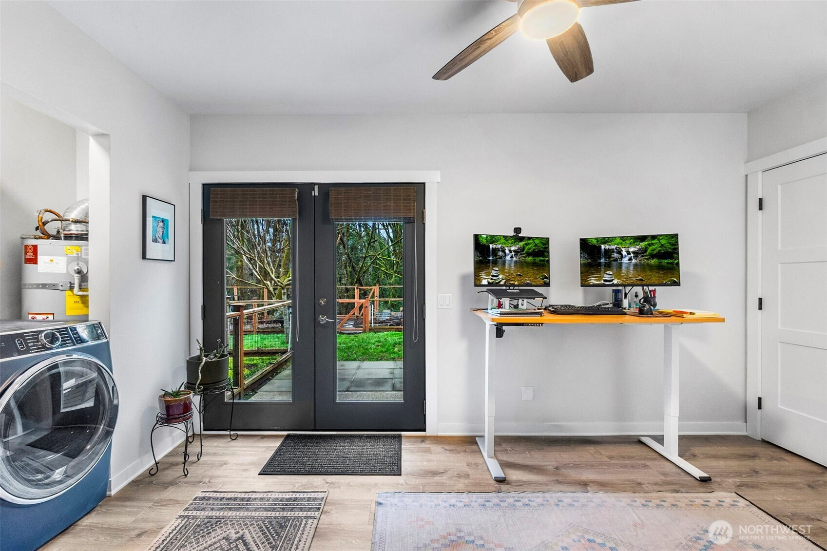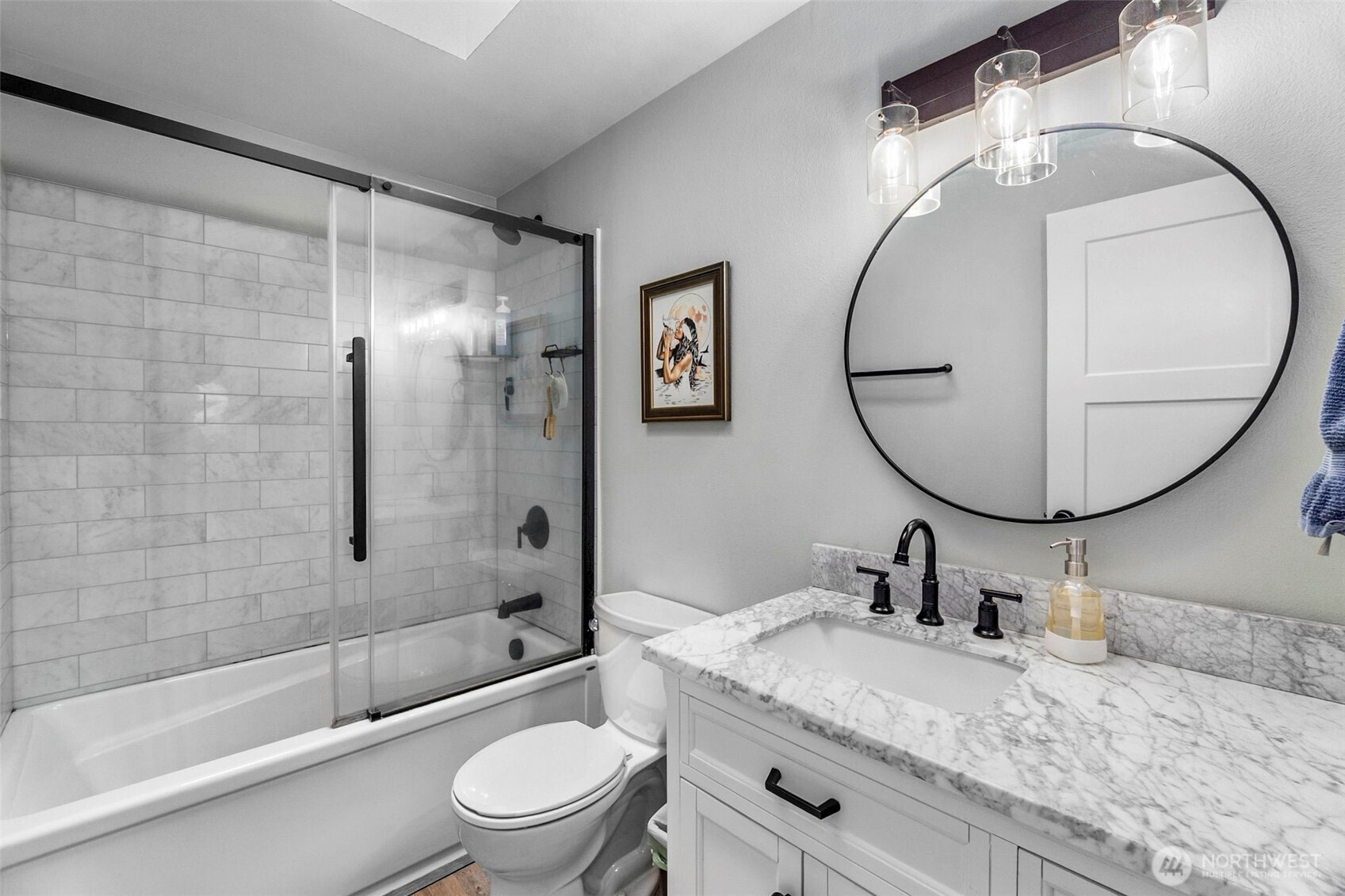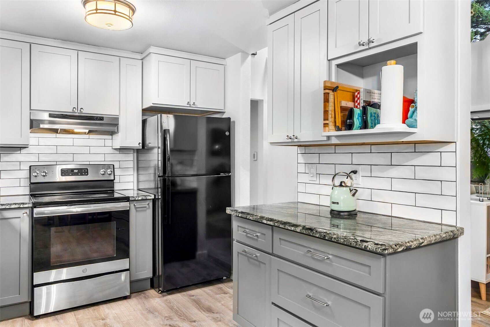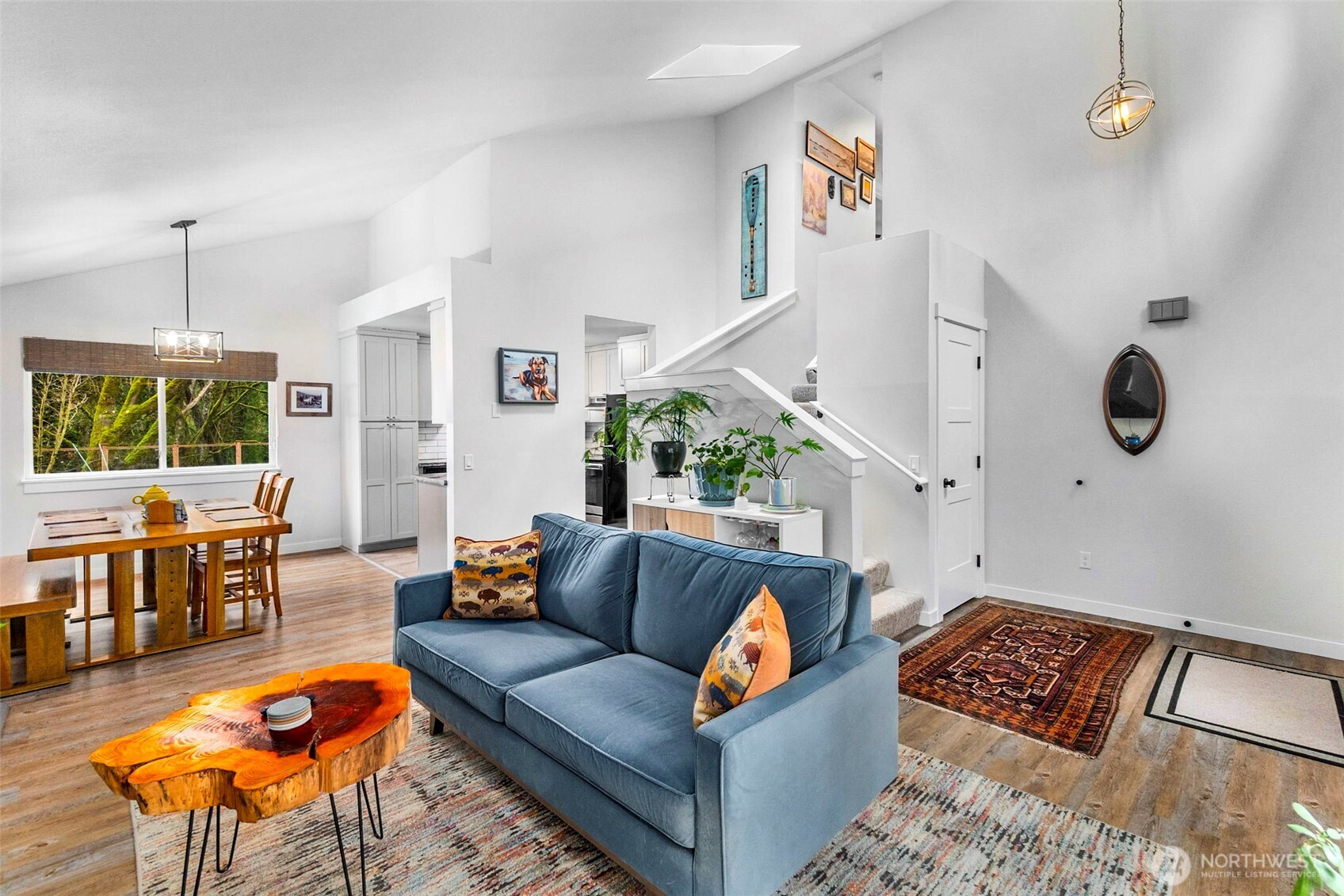 Extensive updates, strong energy efficiency, and a desirable Olympia location come together in this well maintained home. A full interior remodel completed in 2023 refreshed the kitchen, living spaces, bedrooms, and bathrooms with clean, current finishes. A new roof was installed in 2022, and a 35 panel solar system added in 2021 supports long term efficiency and lower overall energy use. Living spaces feel bright and comfortable, with updates focused on finishes and overall condition. The kitchen sits alongside the dining area, offering a practical setup for everyday use. The living room features a cozy wood stove that adds warmth and character, with a half cord of wood stored in the detached outdoor shed. A bonus room off the kitchen provides flexible space well suited for a home office, den, or additional living area. A heat pump supplies efficient heating and air conditioning. The fully fenced backyard is thoughtfully maintained with landscaped yards and garden beds. Established beds and usable open space create a calm, well organized setting. The backyard view looks onto a neighboring forested area, creating a green backdrop and added privacy. Watershed Park sits directly across the street, offering immediate access to forested trails and natural surroundings. Downtown Olympia is just down the road for easy access amenities. These elements combine to create a home that is comfortable, well cared for, and easy to settle into.