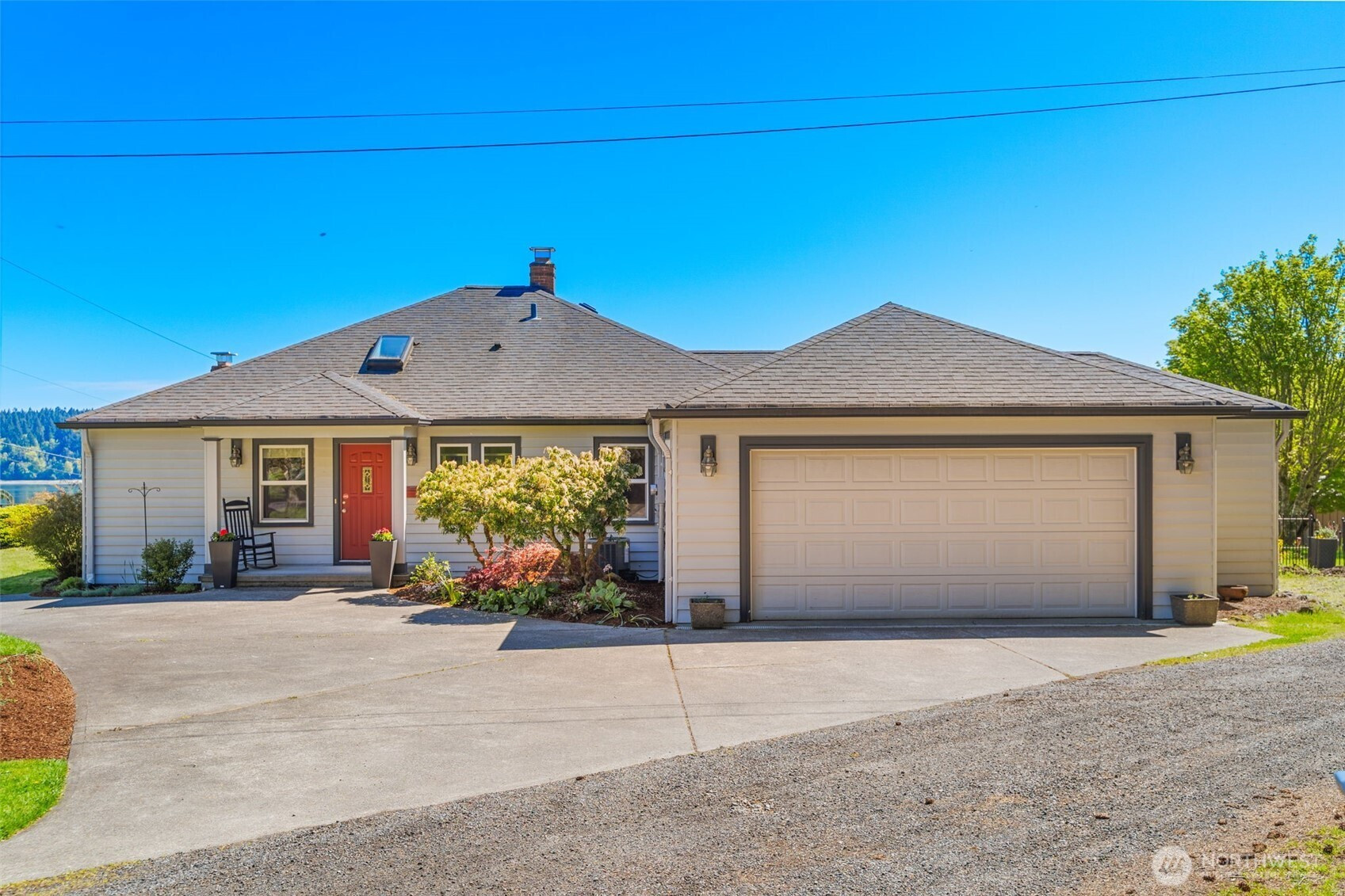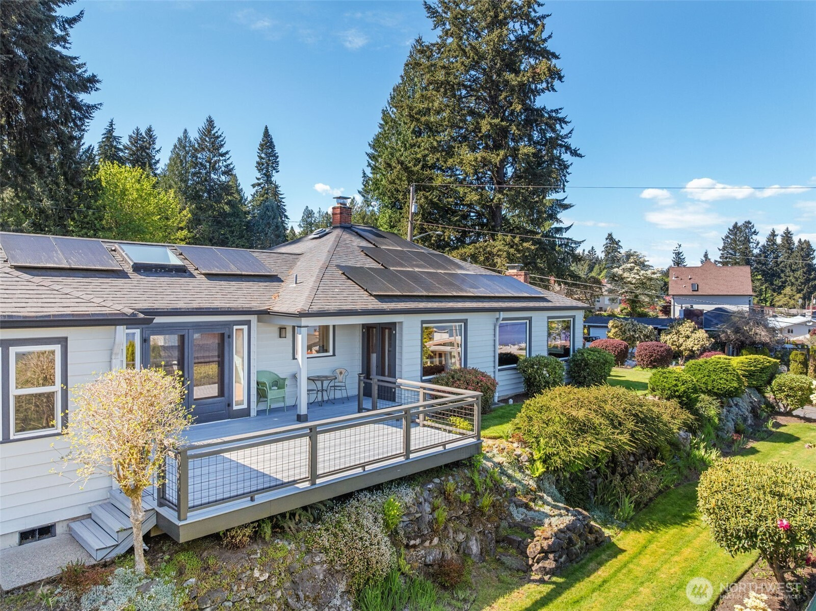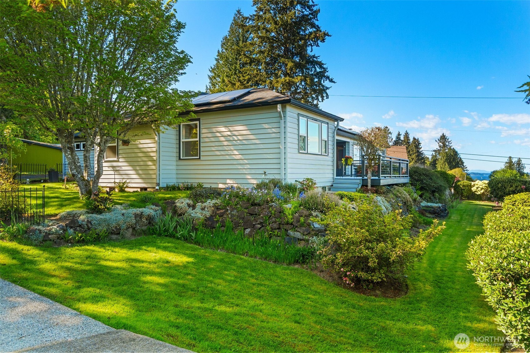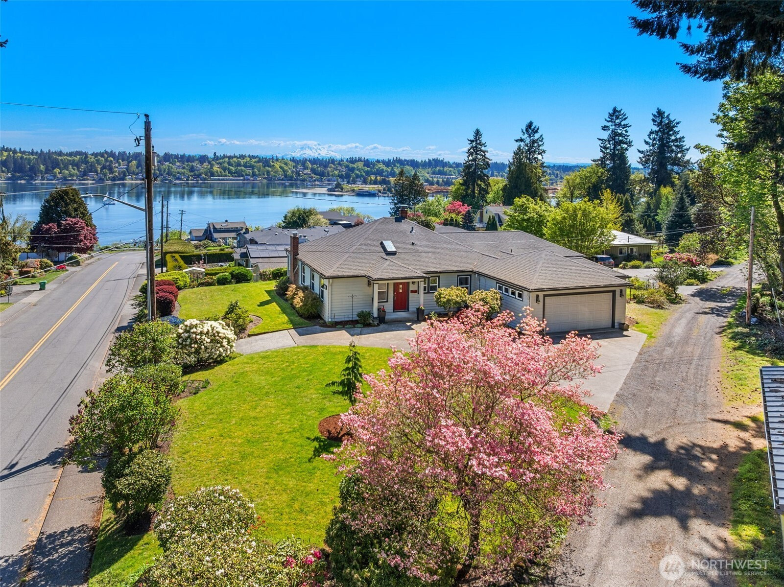 Experience the ultimate West Olympia lifestyle on nearly one-third of an acre with a full view of Mt. Rainier and Budd Inlet. This impeccably maintained home is designed for effortless one-level living. The living room and dining room feature large picture windows that perfectly frame the mountain and water. The primary suite and timelessly remodeled kitchen are also strategically positioned to capture these stunning vistas. For seamless indoor and outdoor living, the kitchen includes French doors that lead to a large deck that is great for entertaining. The main level features original hardwood floors in excellent condition, providing a warm and sophisticated atmosphere throughout.Beyond the views, this property is engineered for modern efficiency. High-value upgrades include an installed solar panel system for sustainable energy and a garage already wired for a generator. The exterior is designed for convenience, featuring a circular driveway and a beautifully terraced yard kept lush by a full sprinkler system. For those seeking extra space, the partially finished basement provides significant potential for equity growth. This versatile area is suited for a home gym, media room, or guest quarters. Located just minutes from downtown marinas, restaurants, and shopping, this residence combines Pacific Northwest beauty with robust infrastructure. Experience a rare opportunity for main-floor living with a view that must be seen in person.