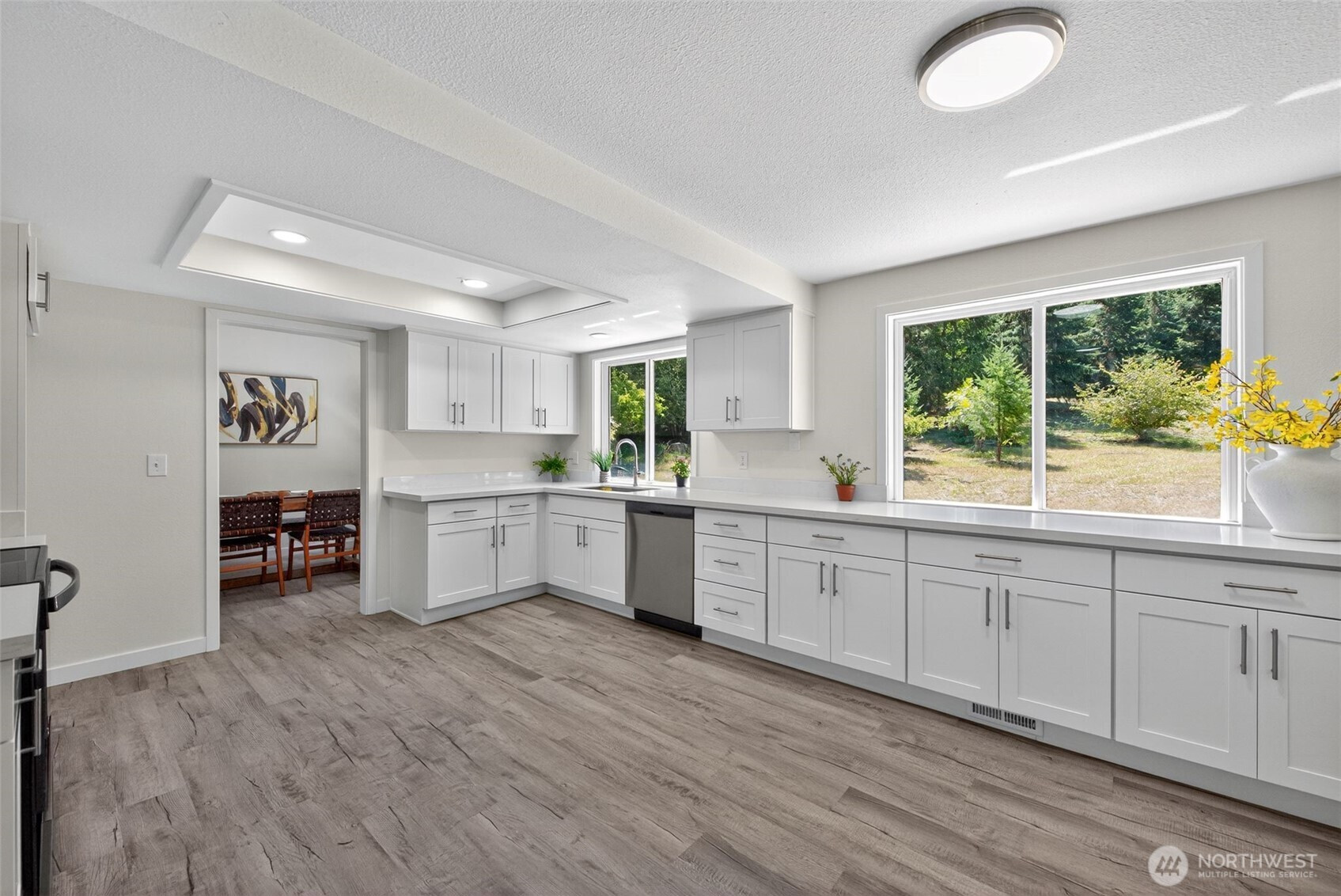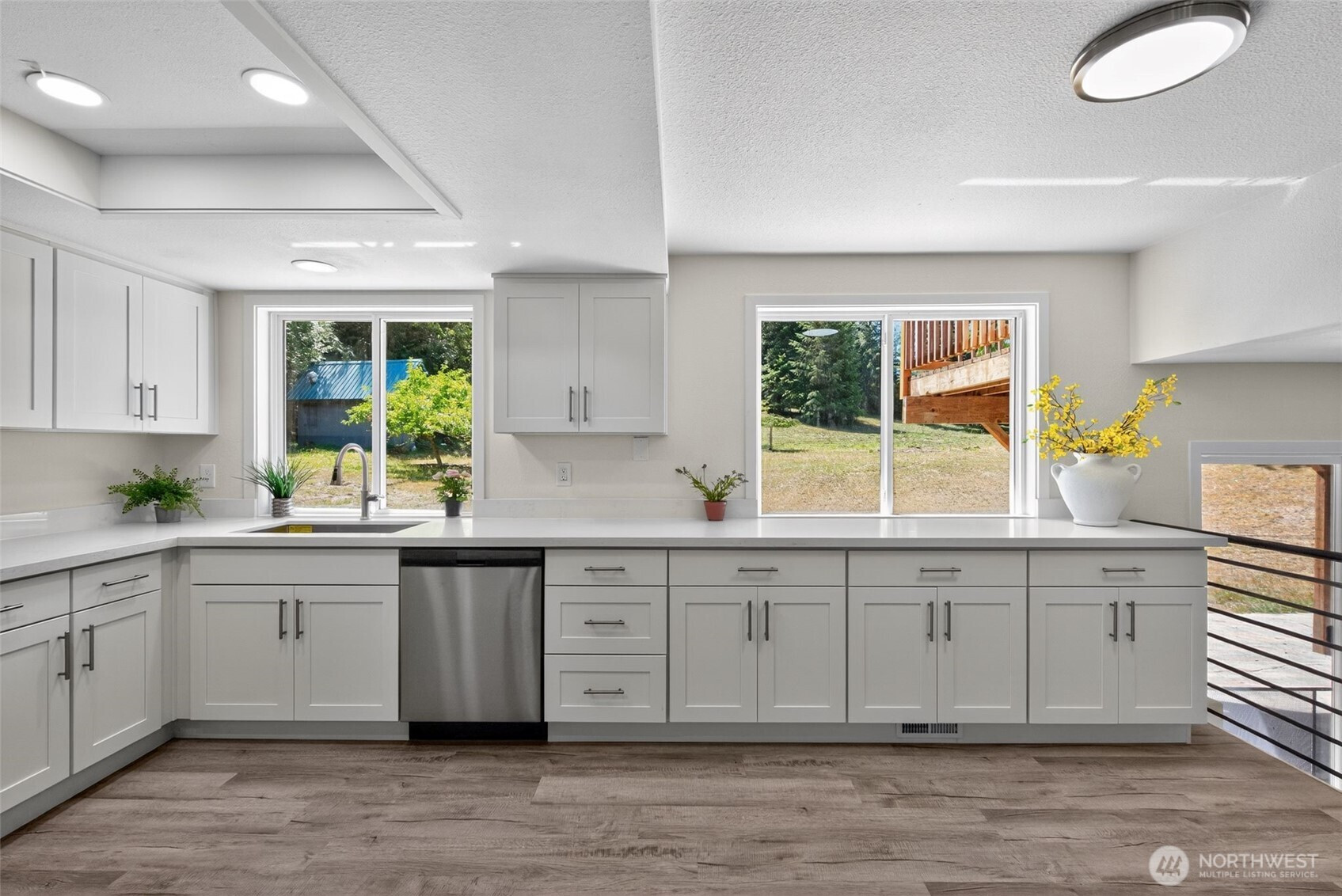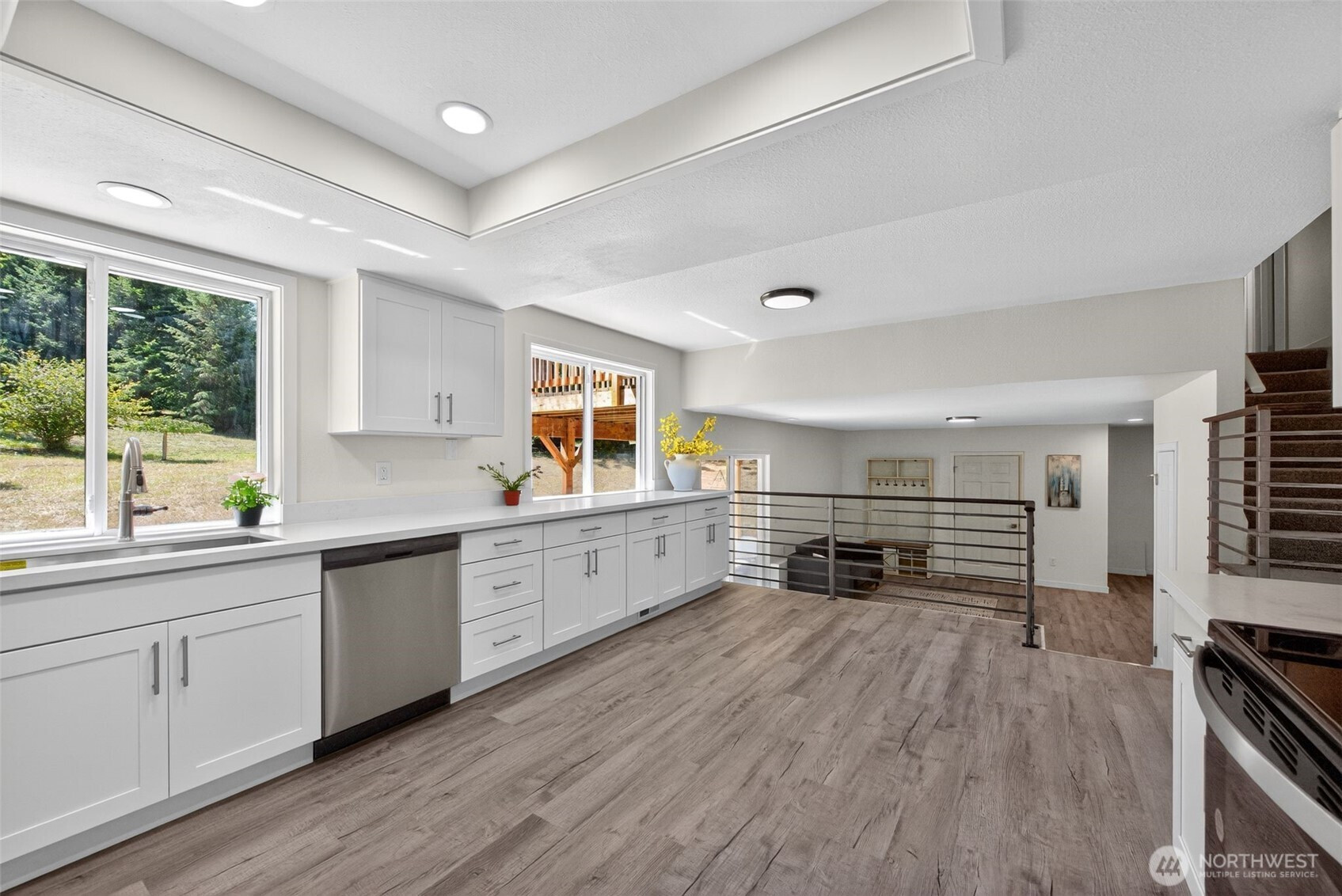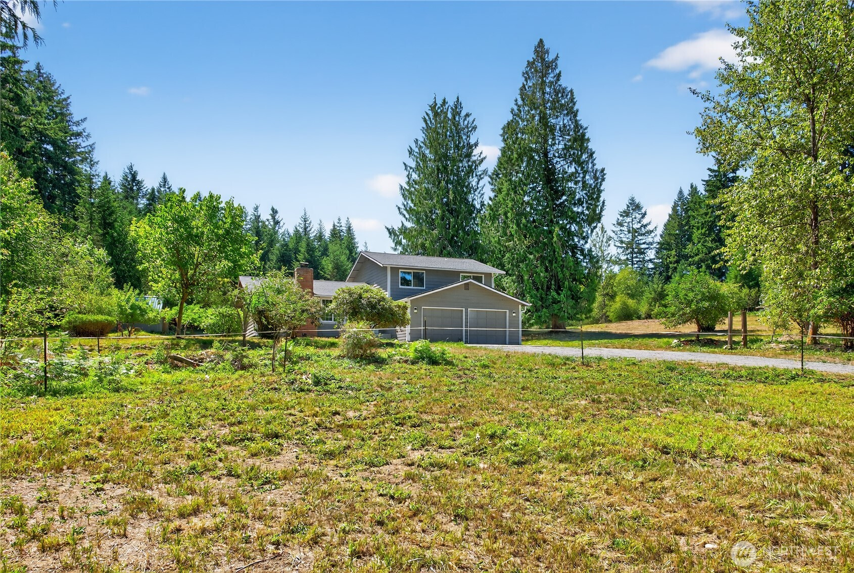 Yelm – 5.78 Acres – Discover this freshly, updated home, offering both privacy and modern comfort. Inside, you’ll find freshly painted interior, new vinyl plank flooring & plush carpet throughout. The living room features a cozy wood burning fireplace as its centerpiece, perfect for gathering. The kitchen and bathrooms have been upgraded with stunning quartz countertops, new hardware on cabinets & stainless steel appliances in the kitchen. Light fixtures and railings have been tastefully updated, adding a modern touch to the space. Enjoy outdoor living on the newer deck, overlooking the expansive property. Move-in ready and perfectly situated, this property blends rural charm with fresh, stylish upgrades.