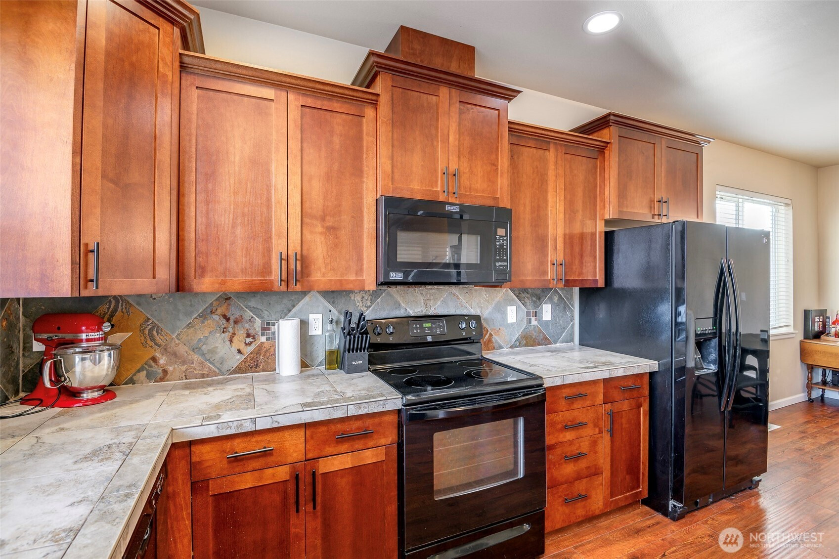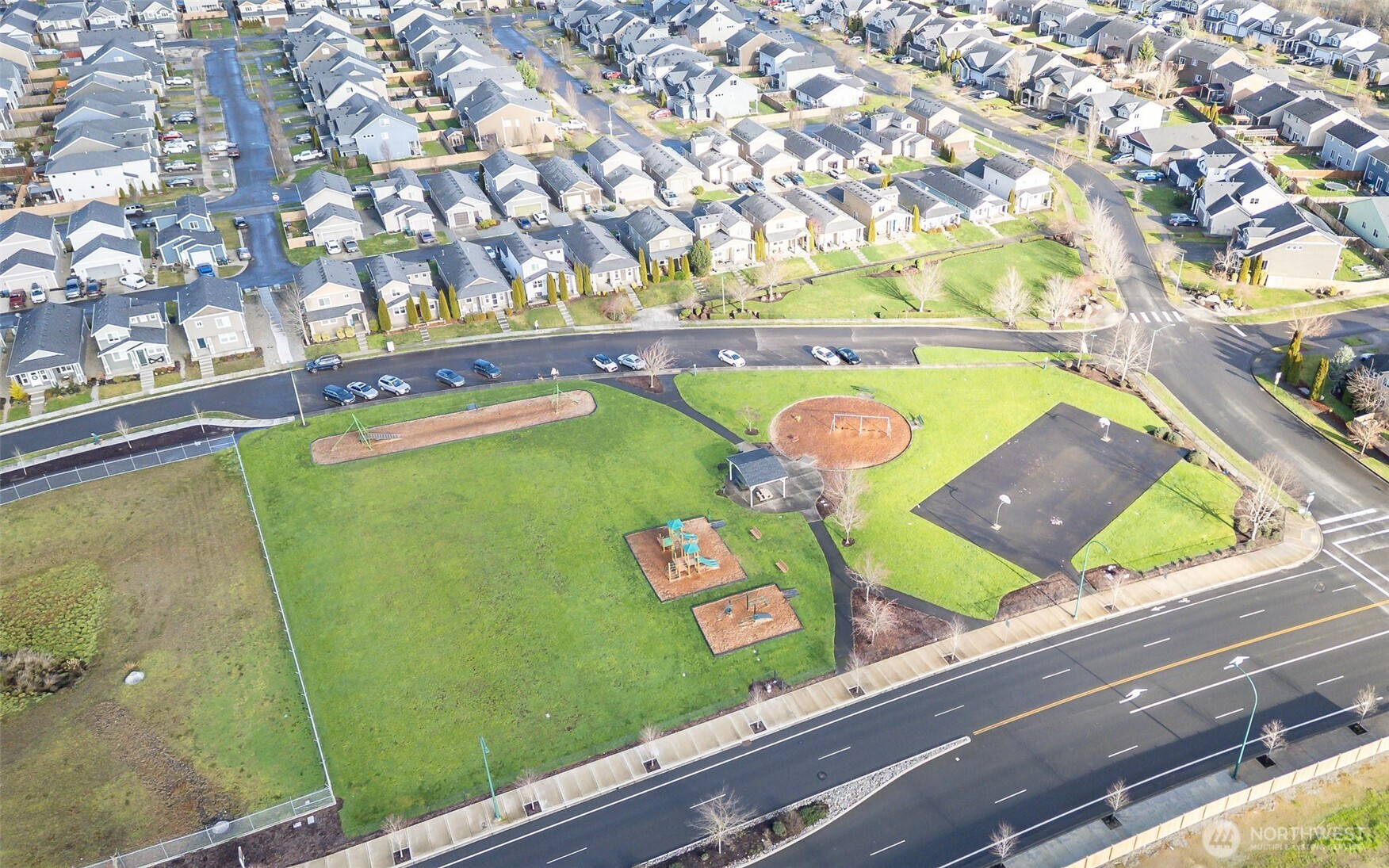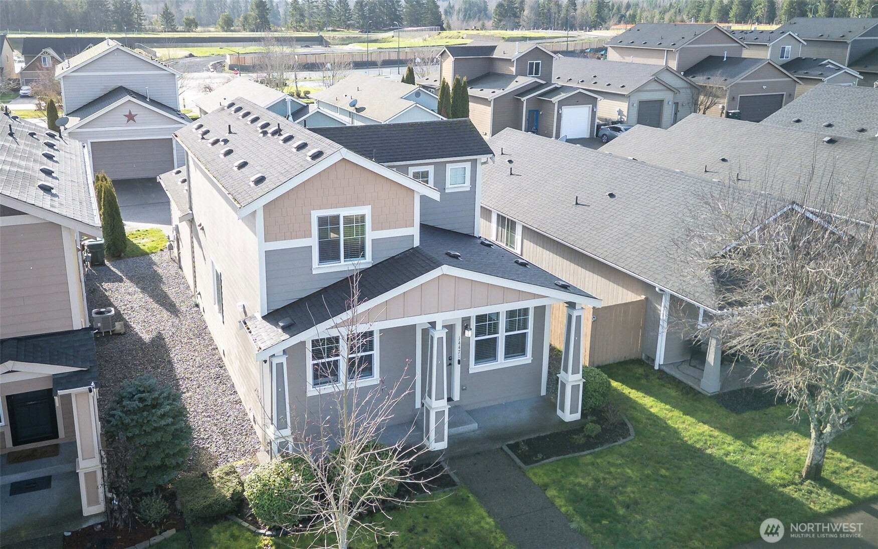 Welcome to this modern home located in the sought after Tahoma Terra community, offering 3 bedrooms and 2.5 baths. The main floor primary suite features a spacious ensuite bath and walk-in closet. Upstairs are two additional bedrooms, a full bath, and a generous hallway walk in closet. The open kitchen offers ample cabinetry, tile countertops, a slate backsplash, and all appliances stay. Enjoy the inviting covered front porch and an oversized single car garage with extra storage. A beautifully maintained community park welcomes you at the entrance of the neighborhood. Conveniently located about 30 minutes from JBLM, with shopping and amenities nearby.