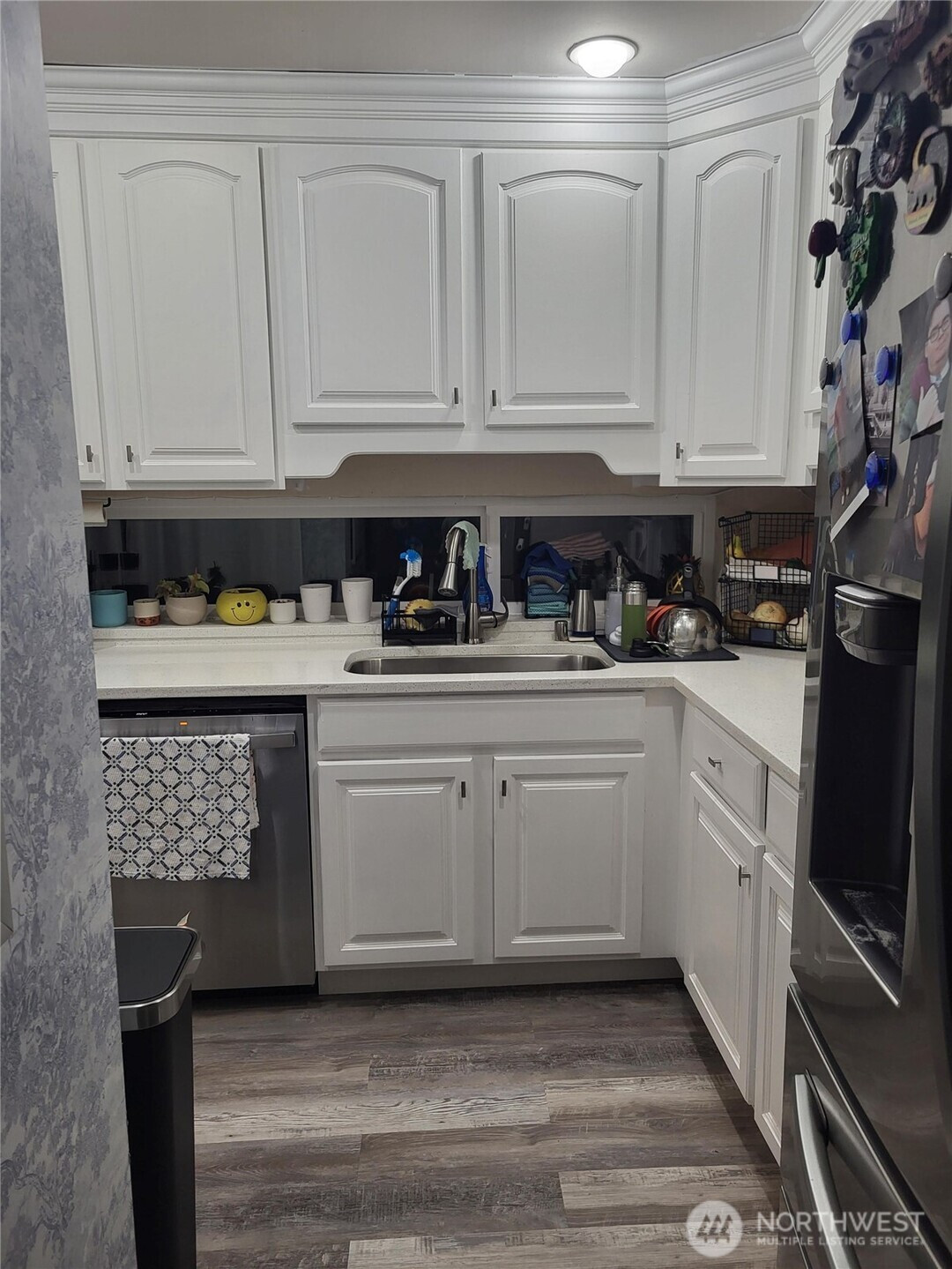 Large townhome with oversized living room, family room, dining room, coat closet with storage space, kitchen with pantry and 1/2 bath downstairs. 4 bedrooms, 1.75 bathrooms, laundry room, and closet storage upstairs. Updates include new kitchen appliances and granite countertops, hot water heater, furnace, windows and siding. Two car garage -extra parking outside. Two patios, one is fully fenced with garden beds. A lot of living space for the price, easy cosmetic updates needed in the upstairs space and stairwell - carpet, paint, and trim; finsish the kitchen with your own backsplash or paint. All the major updates have been done. Most of the wallpaper is removable (peel/stick). Less than 5 minutes to Costco, Fred Meyer, Safeway, and I-5; short drive to elementary and middle school - bus stops right in front of the complex (unit). Double sided walls for peace and quiet. Community trail and access to Barnes Lake. $5k buyer concession for closing costs or upgrade allowance with full or near full price offer. Seller is listing broker.