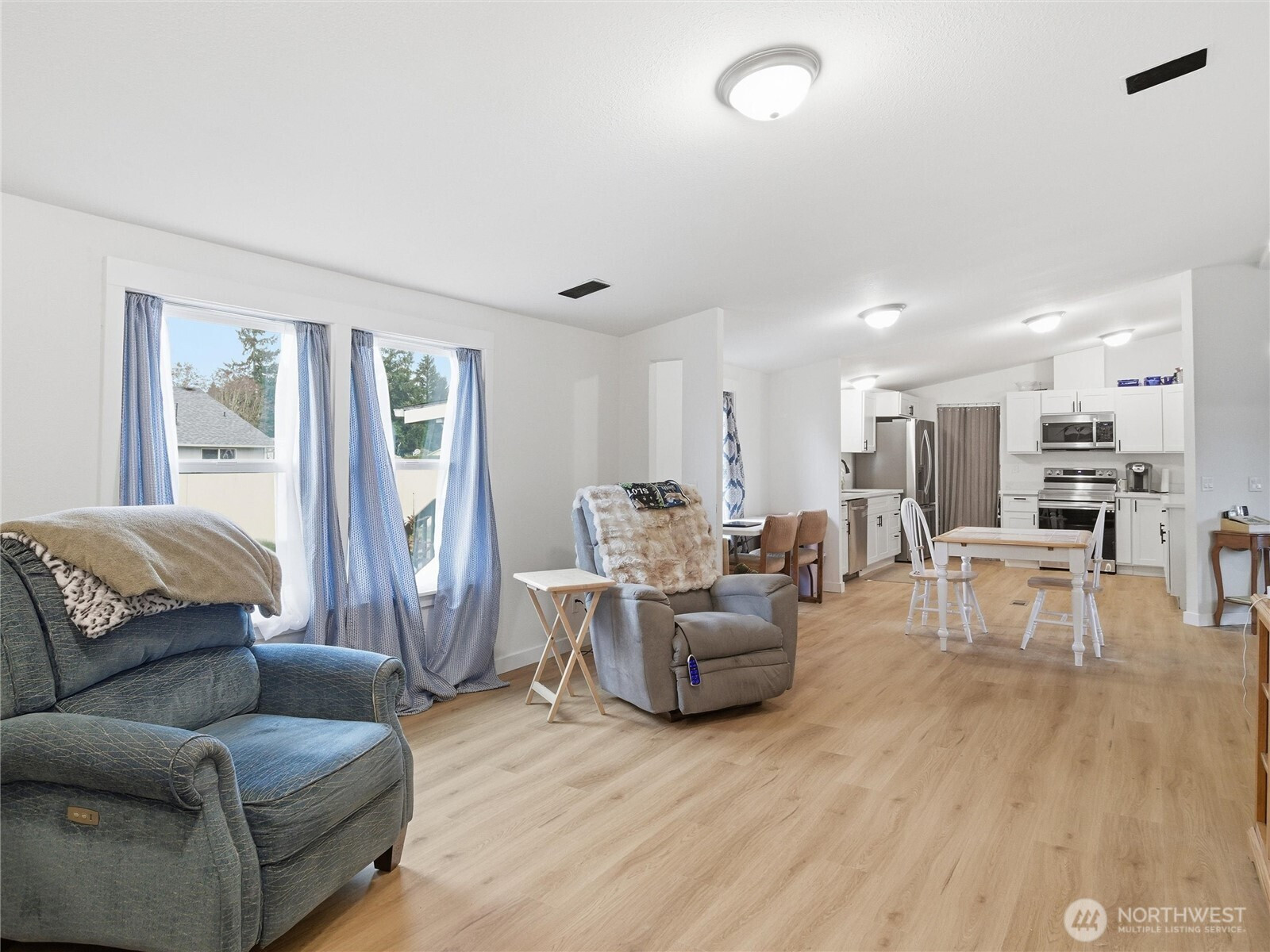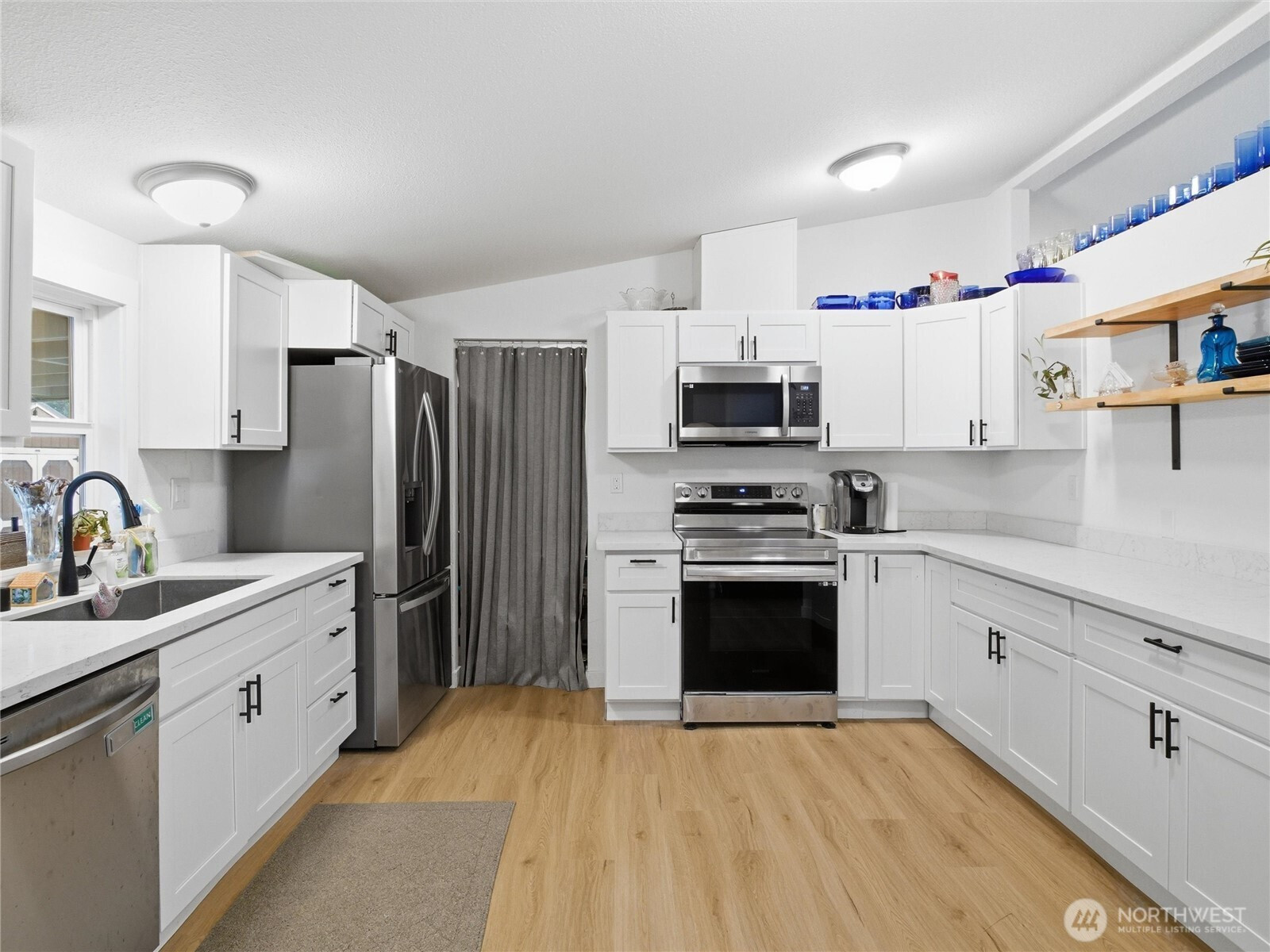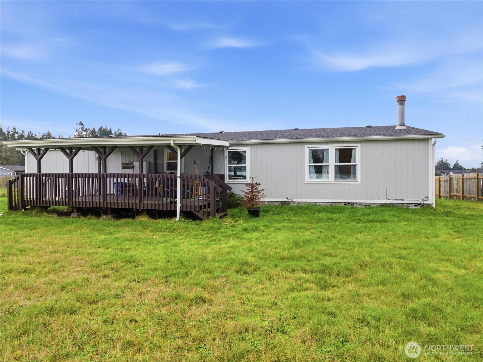 This 3 bed/2 bath home is a must see, sitting on just shy of a 1/3 acre! The spacious kitchen shines with quartz countertops and stainless steel appliances, flowing easily into the main living space. Enjoy the cozy living room with an electric fireplace and built-in shelving for added character. The primary suite features a walk-in closet and a 5-piece bath. An oversized utility room provides excellent storage and flexibility. Outside, relax on the large covered deck overlooking the fully fenced backyard. Great location! Close to schools and parks. Come see today!