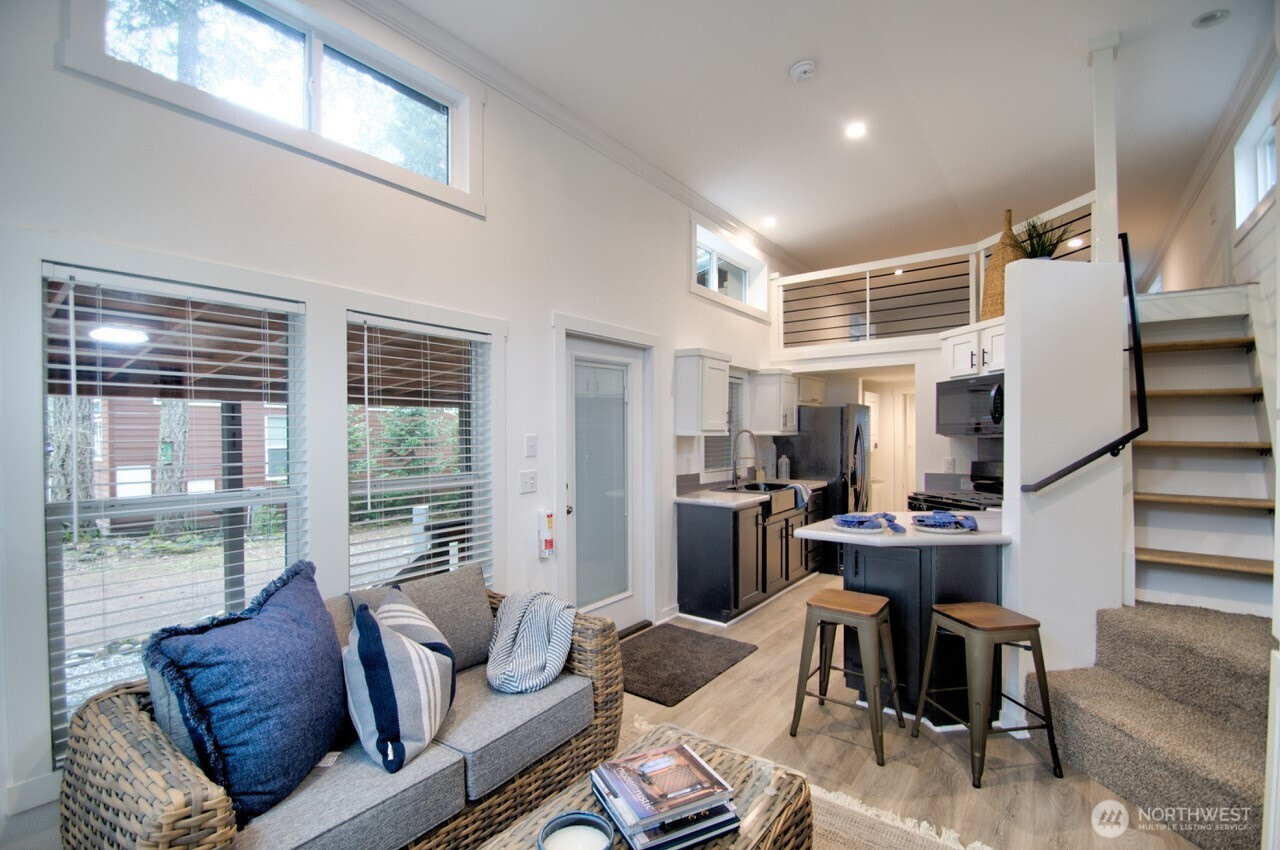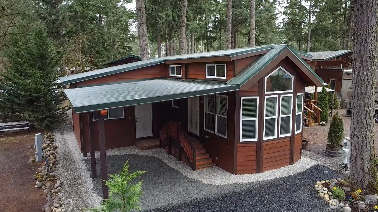 10 Maple - Brand-new cabin with loft located in the beautiful Lost Lake Resort community! This thoughtfully designed retreat features ductless mini-split heat and A/C in both the living area and bedroom, providing efficient year-round comfort. The interior showcases modern white cabinetry throughout with stylish black accents, including a striking black farmhouse sink and coordinating black bathroom fixtures. Cathedral ceilings and a layout create a bright, spacious feel, while durable vinyl plank flooring runs throughout the home for easy maintenance and a clean modern look.The kitchen comes fully equipped with a gas range, microwave, refrigerator, washer, and dryer, making this cabin move-in ready. A newly built 16 x 15 attached shed is fully finished and includes a full bath with tub and closet offering excellent additional storage or flexible space for guests, hobbies, or recreational gear. The exterior features fresh black gravel landscaping with a defined border for a polished appearance and low-maintenance upkeep. Enjoy everything Lost Lake Resort has to offer, including swimming pool, sauna, workout facility, pickleball courts, mini golf, playgrounds, and a welcoming clubhouse that hosts community activities and events. Outdoor enthusiasts will love easy access to Lost Lake for fishing, swimming, and kayaking, along with nearby scenic hiking trails. This property offers the perfect opportunity for a relaxing getaway full time or part time living.
