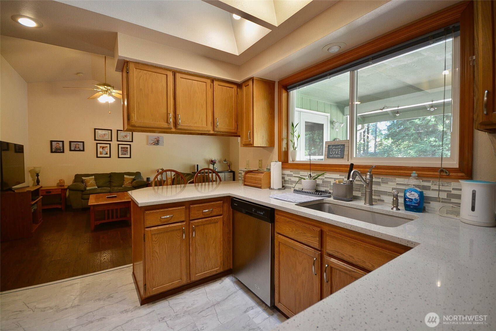 (503) 893-8874BUYER BONUS: $11,000 closing cost credit! Live at the lake & savor the sun. Here's a delightful 1714 sqft rambler on huge 0.62acre lot. Offering a spacious living room with cozy pellet stove, dining room & family room too. A large updated kitchen boasts cabinets galore, quartz counters & tiling. The main bedroom has a delightful ensuite bath and 2 more bedrooms share a 2nd full bath. There's more: heat pump for heating & A/C, updated baths, vaulted ceilings, skylights, French doors, engraved hardwood floors, covered back deck, shed for storage and a new roof with the sale. Lawrence Lake features include: boat launch, club house, park, playground etc. Close to amenities & JBLM. Your search has ended ......call now!