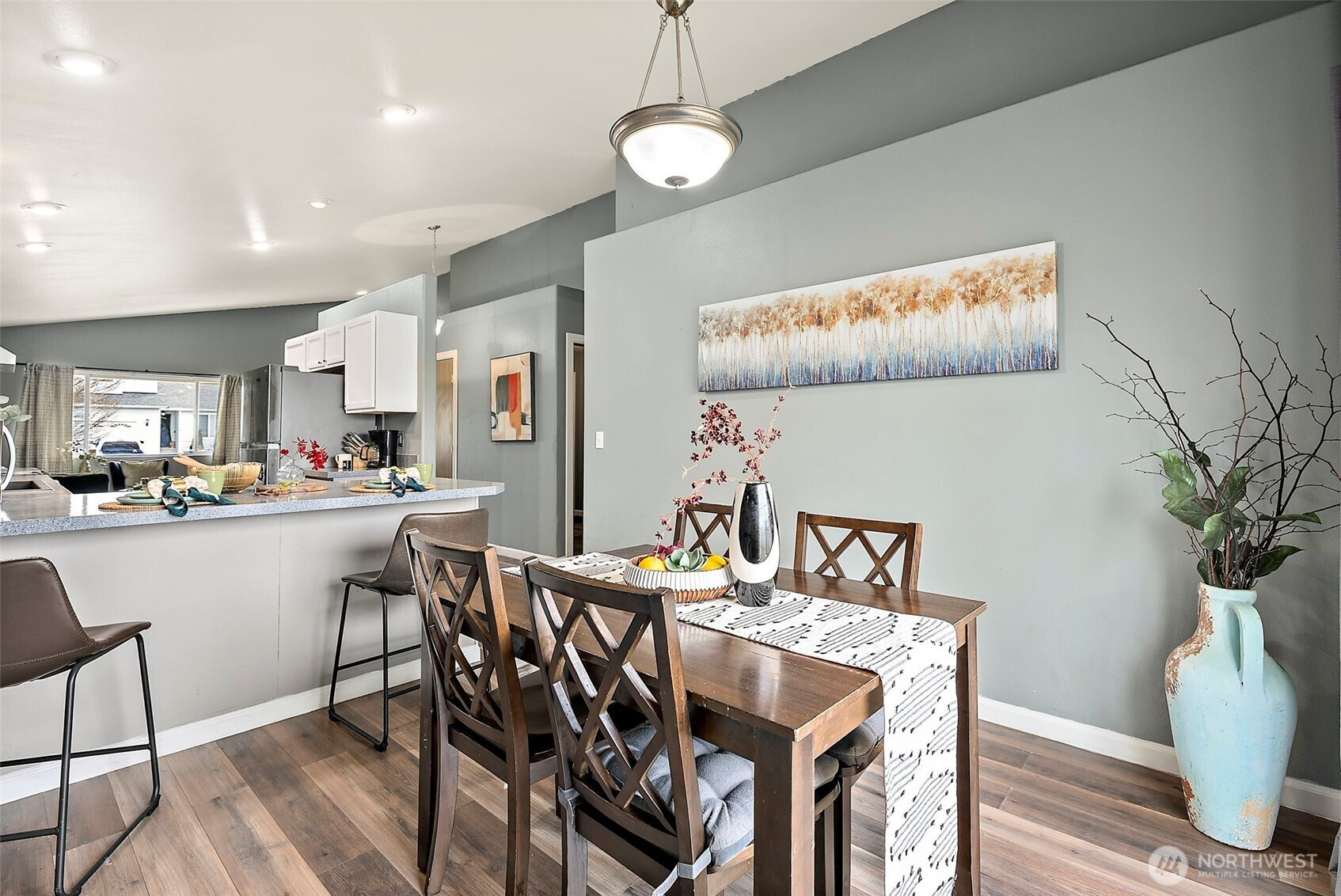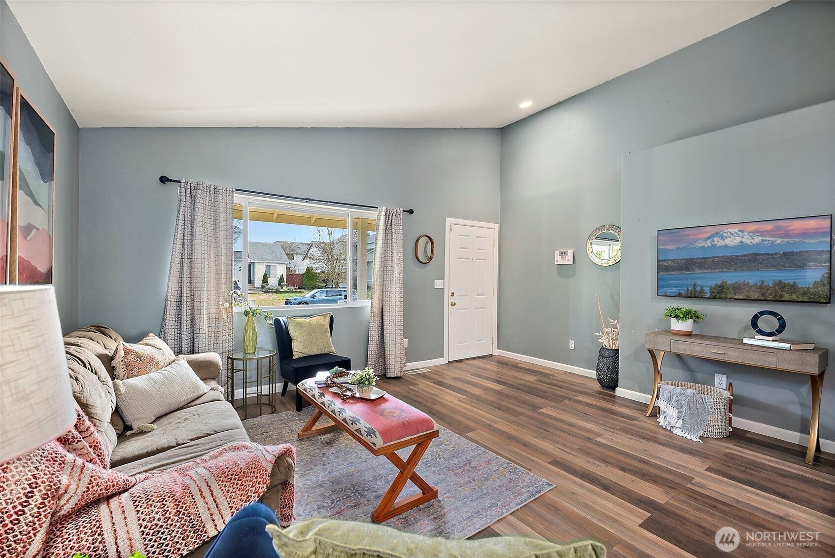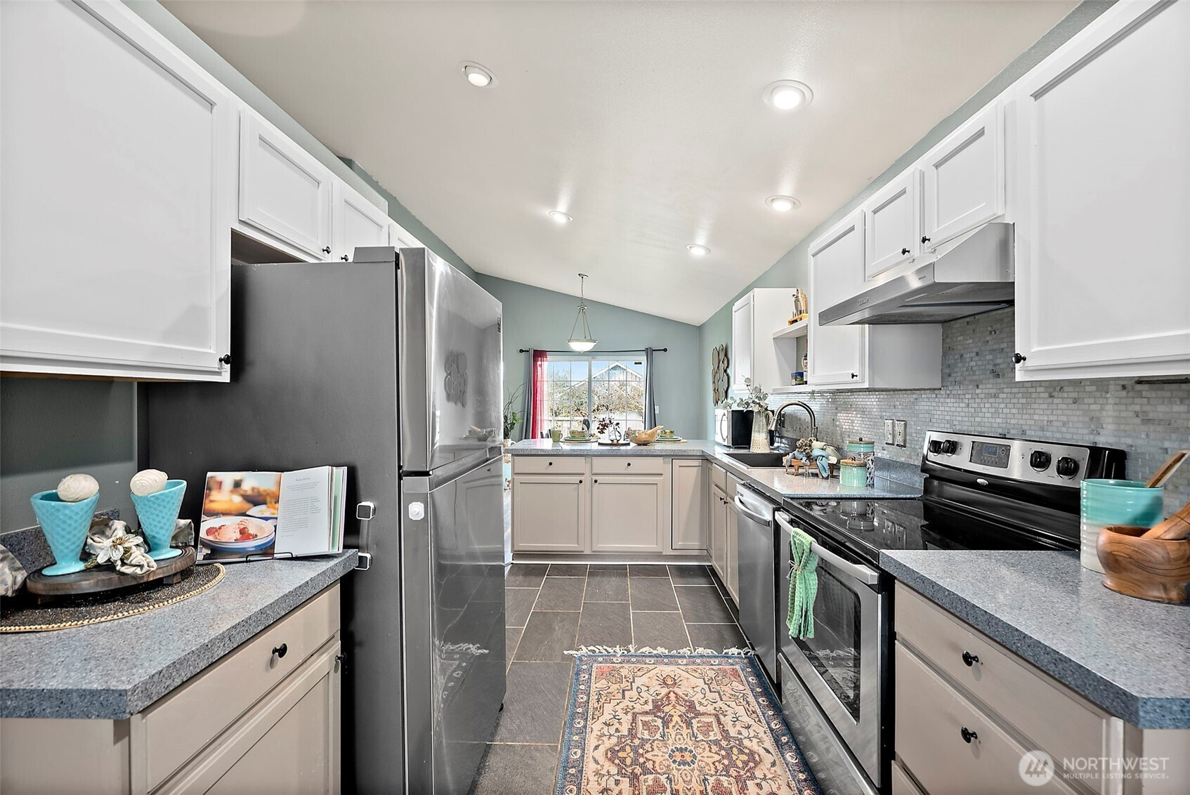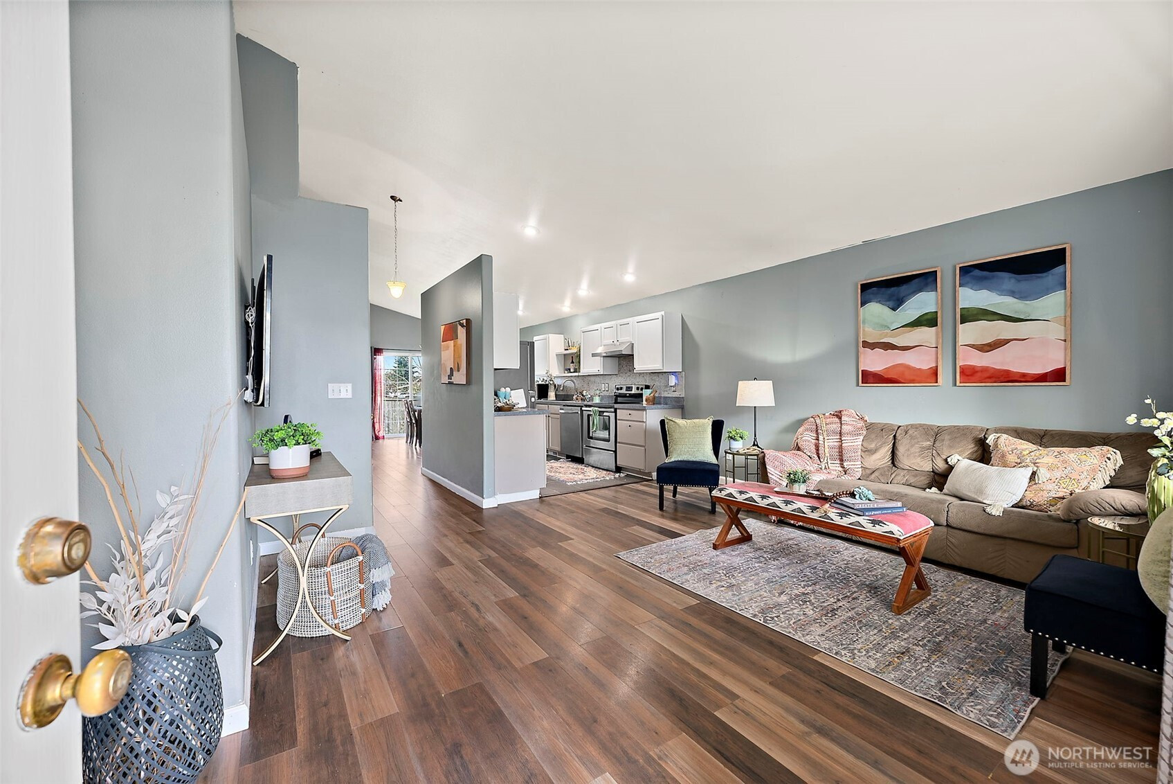 ADORABLE RAMBLER IN THE HEART OF YELM! Step in off of the large covered front porch and admire the open layout with vaulted ceilings. Kitchen with functional layout, ample counterspace, and a breakfast bar peninsula is the centerpiece of the living space, with the family room and dining room on either side. Sliding door off of the dining room leads to a fully fenced back yard. Spacious laundry room/mud room at the hallway entrance off of living area leads to the 2-car garage. As you continue down the hall, you will find all 3 bedrooms and 2 baths, including a great-sized primary with en-suite full bath. A very short walk to Fort Stevens Elementary and a quick drive to everything that Yelm has to offer! Easy commute to Lacey and JBLM!