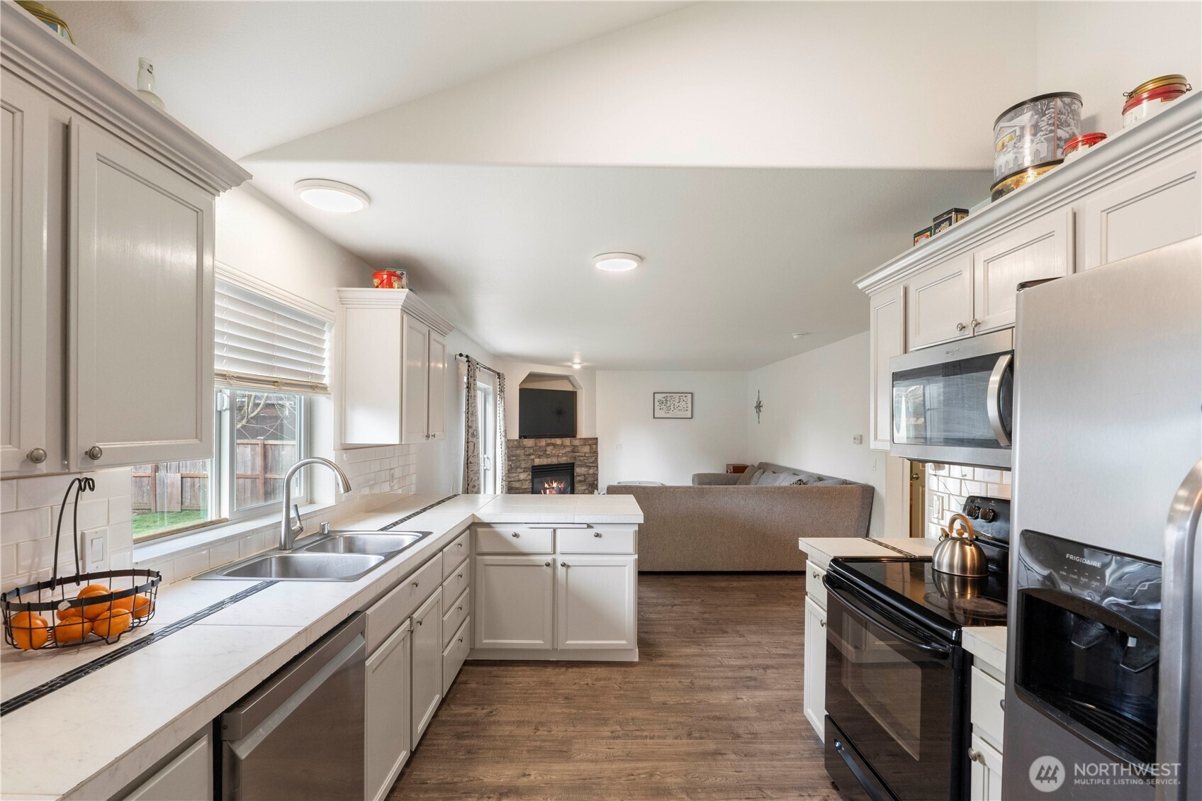 This light and bright open-concept home in the Mountain Sunrise community in Yelm offers over 1,800 square feet of functional living space with abundant storage throughout. Upon entry, you are greeted by soaring vaulted ceilings and durable LVP flooring, with a large bay window that floods the formal living and dining areas with natural light. The kitchen features tile accents, a pantry, and all appliances are included, featuring a newer microwave and dishwasher. This central hub opens directly into the cozy family room, which is anchored by a warm gas fireplace for those chilly evenings. Step outside to a large, fully fenced backyard and patio. This low-maintenance outdoor space is perfect for relaxing, entertaining or gardening in a private setting. Upstairs, the oversized primary suite serves as a retreat, featuring a tastefully updated 5-piece bath and a generous walk-in closet. The two additional upstairs bedrooms are spacious and include built-in window benches for even more storage. The 2 car garage provides ample space for your vehicles, yard tools and more. Ideally located just minutes from parks, walking trails, and shopping, this home also offers a quick and easy commute to JBLM. This property perfectly balances modern comfort with a prime location. FREE One Year Home Warranty included. Welcome Home!
