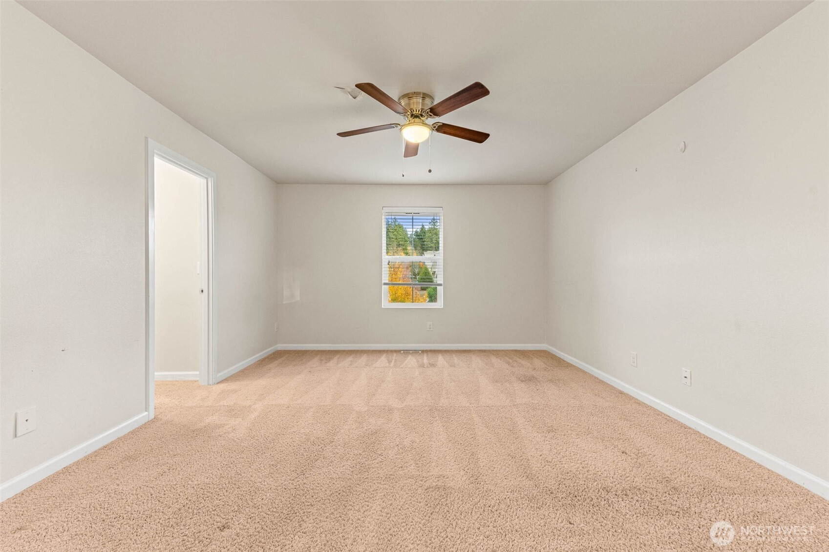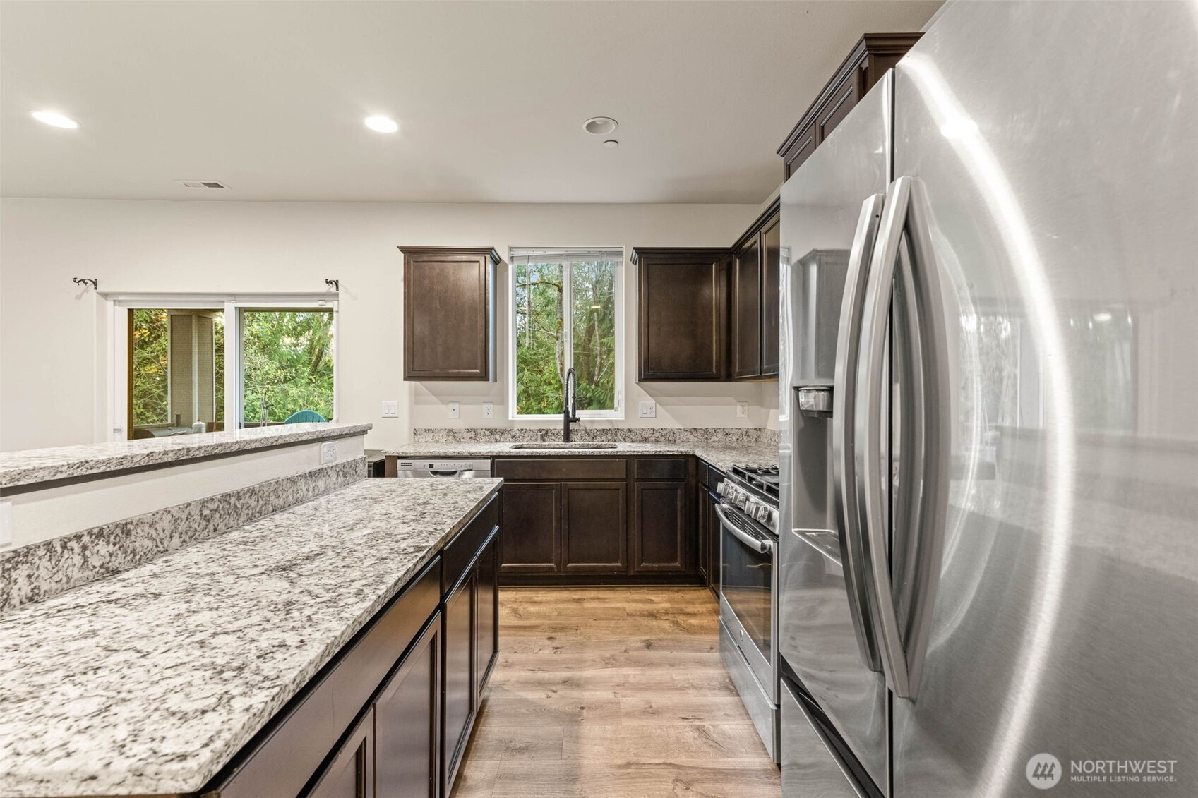 Nestled in the highly sought-after Evergreen Pointe community, this five-bedroom, three-bathroom home epitomizes modern living in Olympia's vibrant Westside. The kitchen, a chef's delight, features sleek granite countertops, stainless steel appliances, exquisite cabinetry, and an expansive island. The luxurious primary suite includes a five-piece bath and generous walk-in closet. A convenient guest bedroom on the main level adjoins a full bathroom. Outdoors, the covered back deck offers serene sunset views, shielded by lush fir trees. Modern comforts include a heat pump for cool summers and solar panels for energy efficiency. Upstairs, a bonus room and laundry add convenience to this exceptional home.